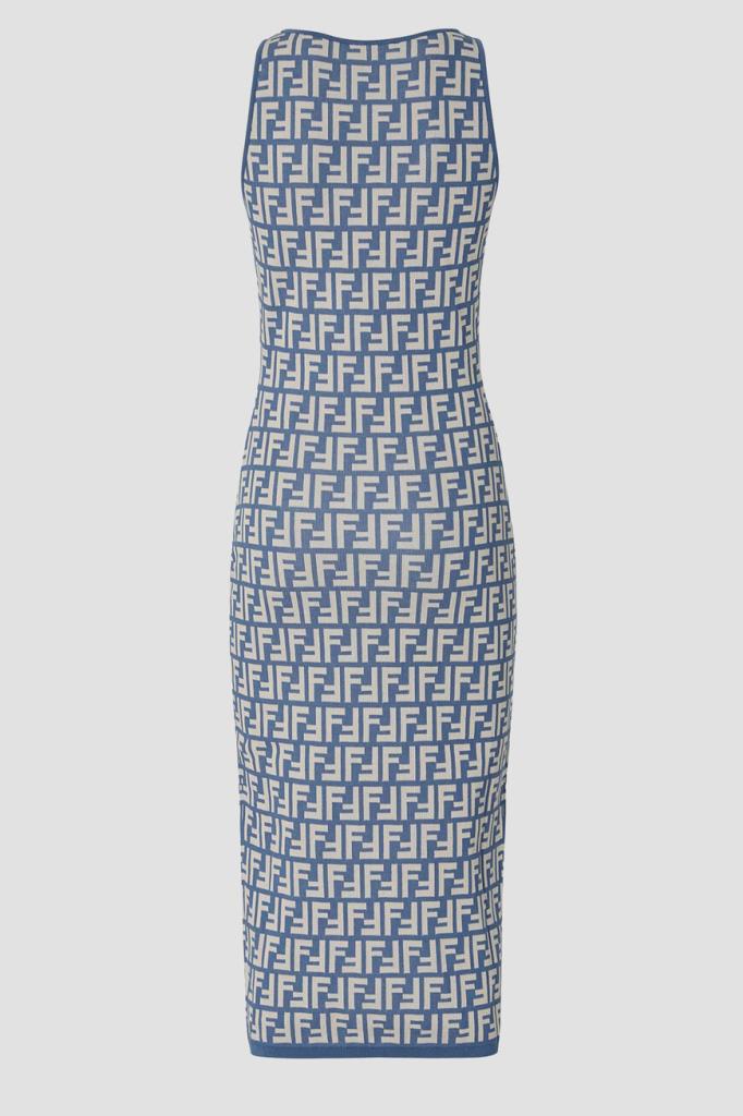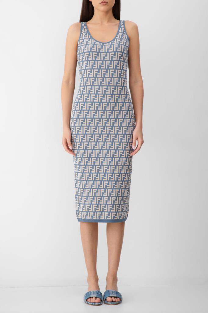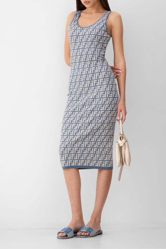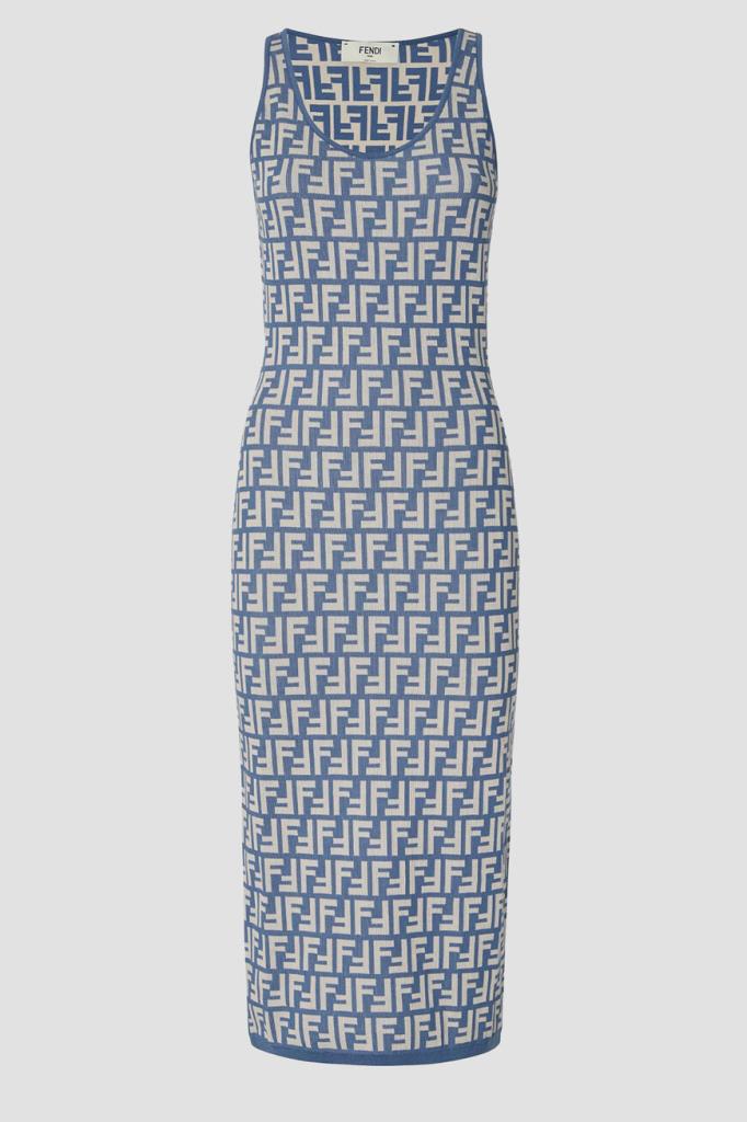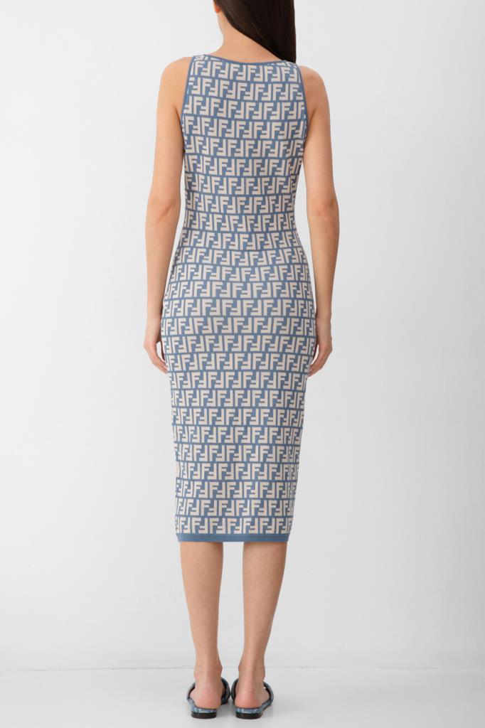 Брендированное платье-миди облегающего силуэта из новой коллекции Fendi. Для пошива двухцветной модели используется эластичный жаккард на основе хлопка и прочного нейлона с легендарным геометрическим мотивом «FF». Изделие интересно отсутствием рукавов и отделкой краёв цвета синего денима в наборную резинку.