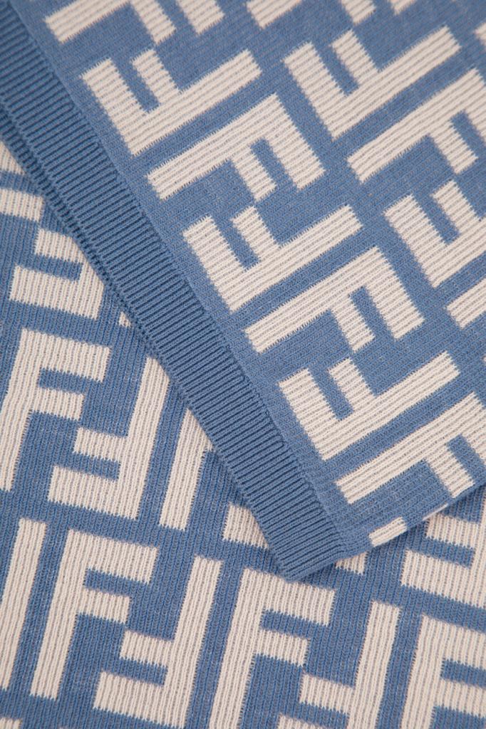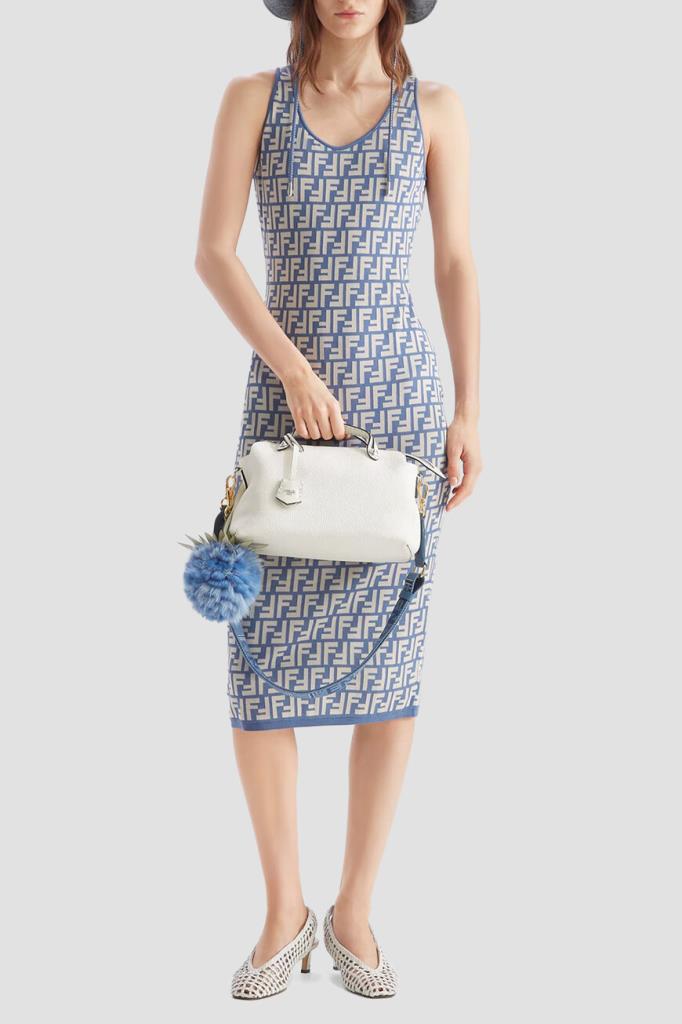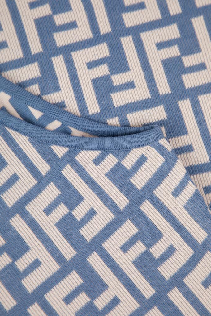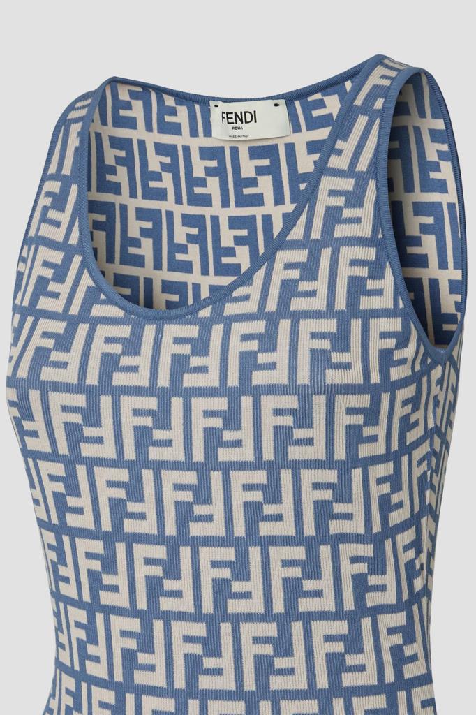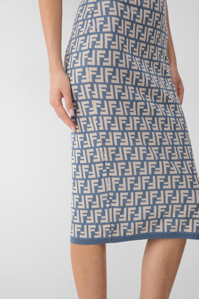 Брендированное платье-миди облегающего силуэта из новой коллекции Fendi. Для пошива двухцветной модели используется эластичный жаккард на основе хлопка и прочного нейлона с легендарным геометрическим мотивом «FF». Изделие интересно отсутствием рукавов и отделкой краёв цвета синего денима в наборную резинку.