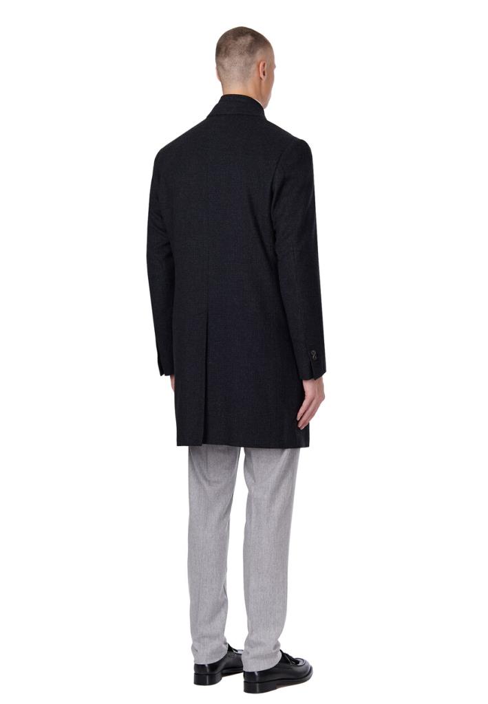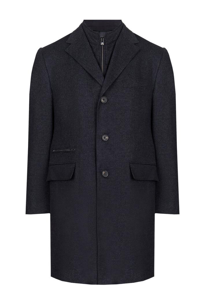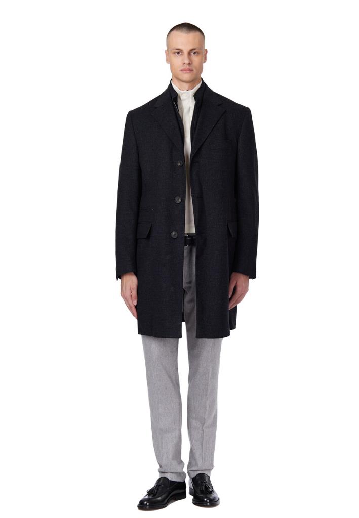 Однобортное серое пальто Corneliani мастера марки выполнили из плотной и мягкой премиальной шерсти, которая не продувается ветром и хорошо удерживает тепло. Лаконичная модель прямого кроя дополнена манишкой на молнии с воротником-стойкой, закрывающим шею от холода, если погода внезапно испортится.
