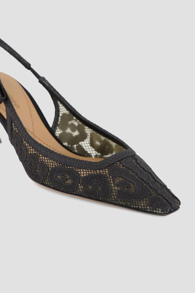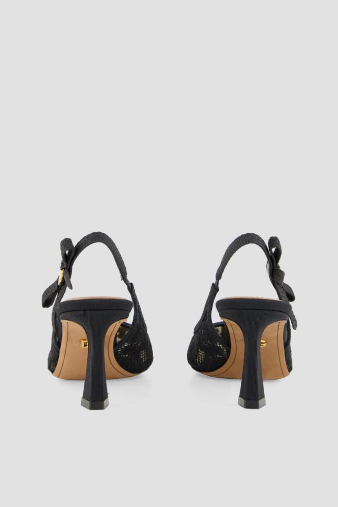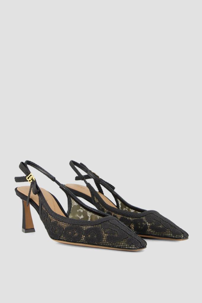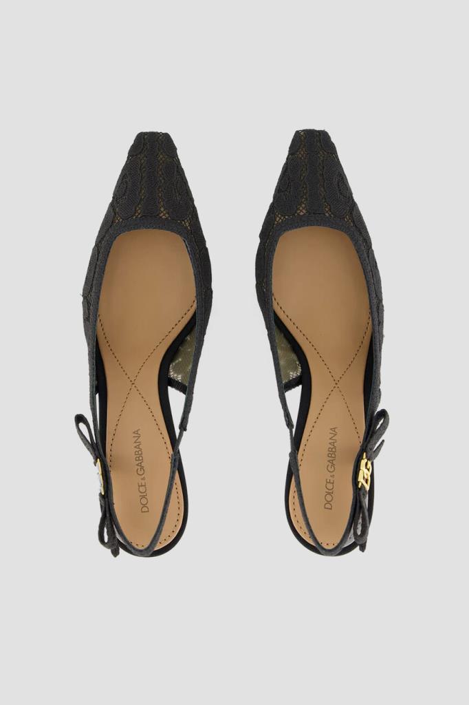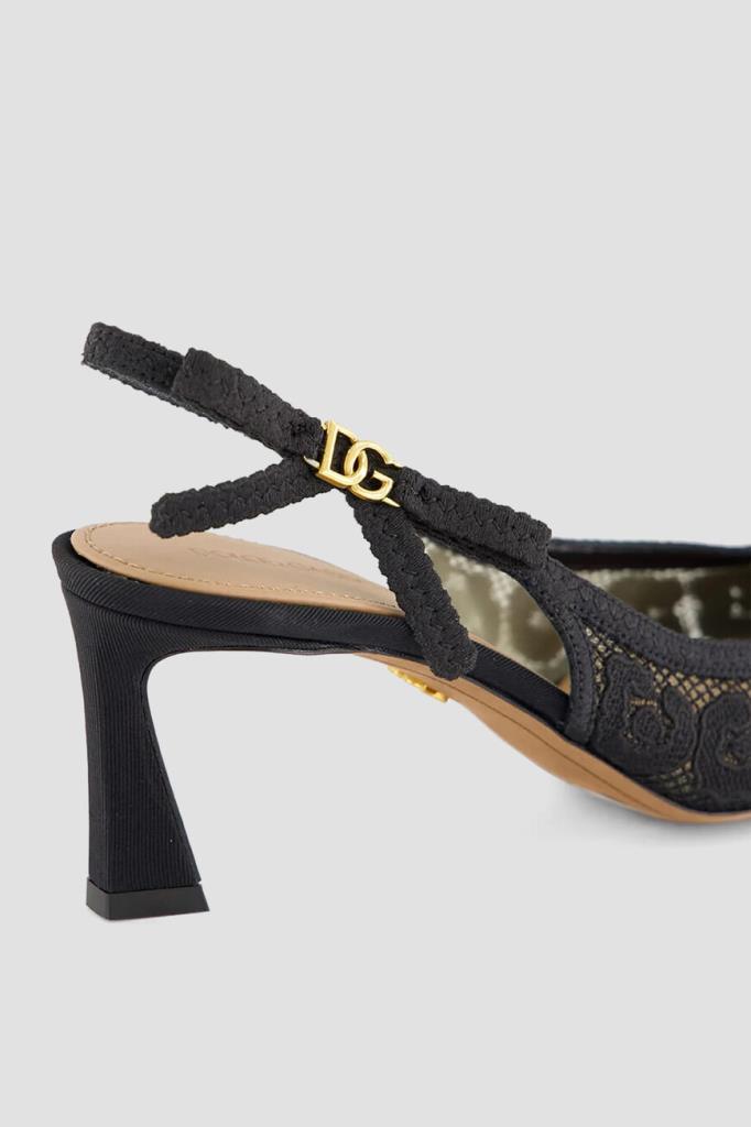 Слингбэки Dolce&Gabbana на скульптурном каблуке средней высоты. Для производства удобной пары выбрано кордовое кружево на основе хлопка, прочного полиэфира, мягкой шерсти и вискозного волокна чёрного цвета с цветочным мотивом. Модель, источающая вечную романтику и утончённую женственность, характеризуется наличием удлинённого квадратного мыса и тонкого эластичного ремешка с крупным бантом и металлической пряжкой в виде лого-монограммы золотого оттенка на щиколотке.