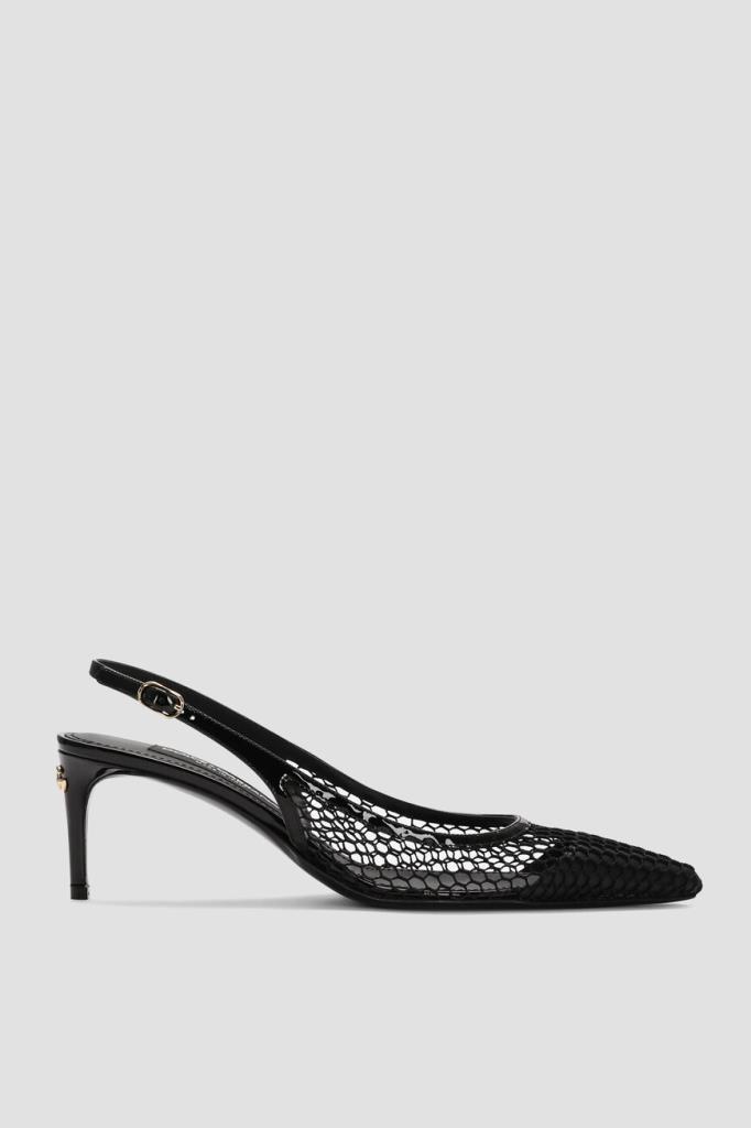 Комбинированные туфли Lollo 60 чёрного цвета от Dolce&Gabbana. Изделие из новой коллекции DNA выполнено из прочной полупрозрачной сетки с деталями и кантом из глянцевой телячьей кожи в тон и вставкой из зернистой кожи телёнка на носке. На принадлежность модели на невысоком устойчивом каблуке-шпильке Дому указывают лого-монограмма из металла светло-золотого оттенка в задней части и брендирование на стельках.