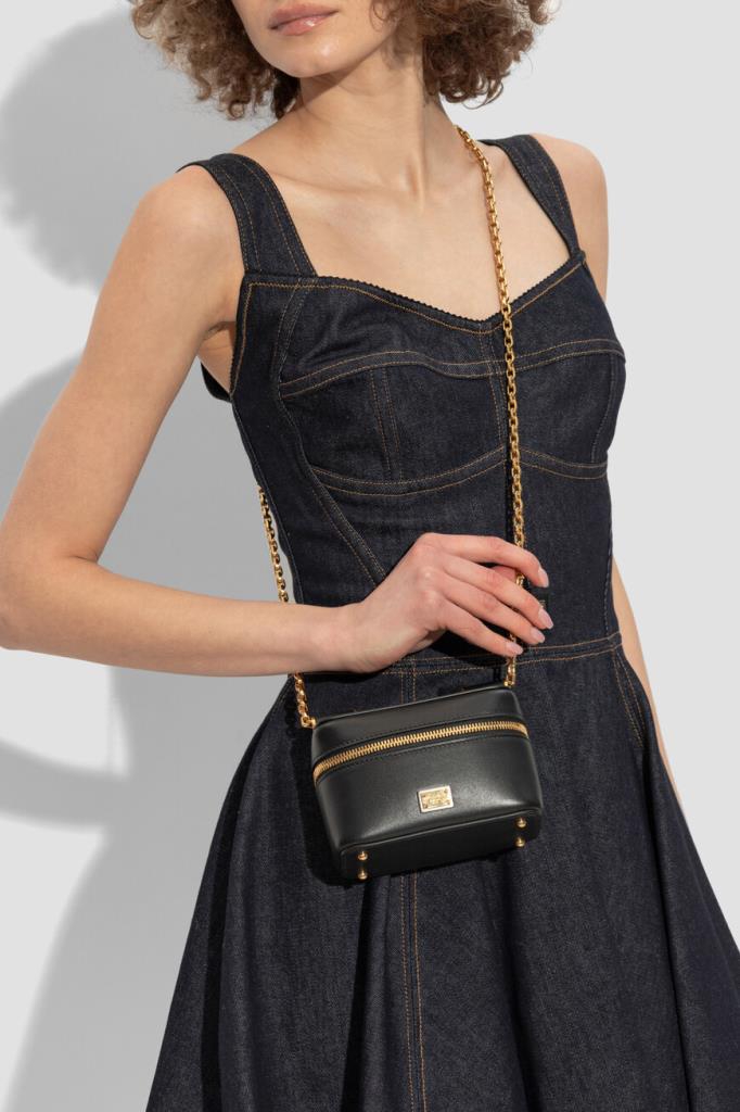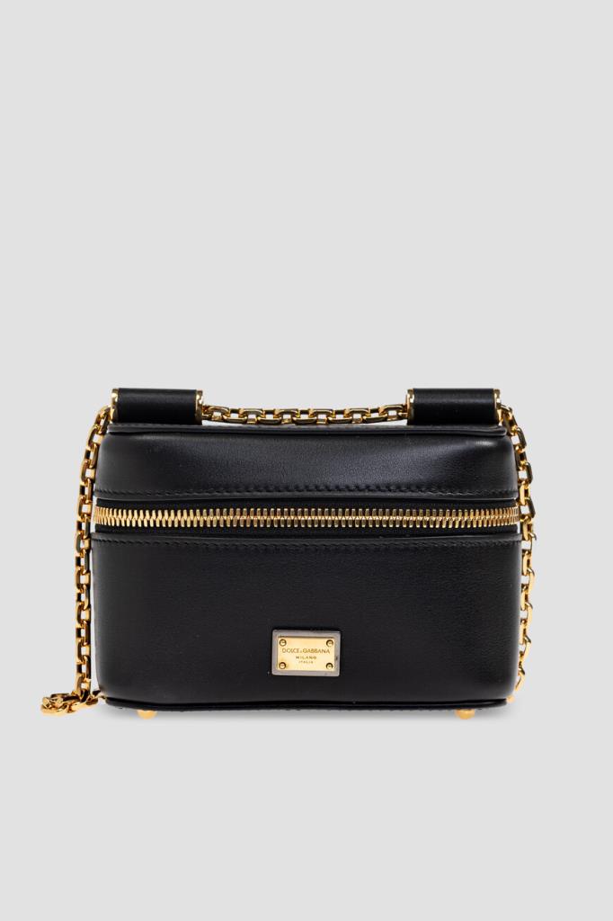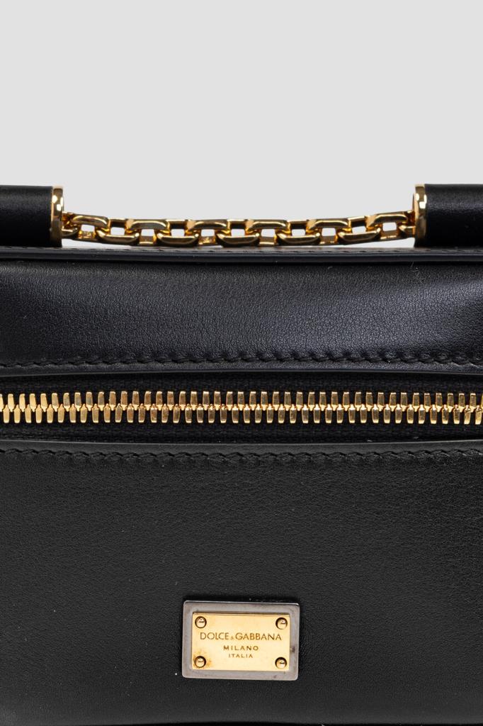 Кожаная сумка кросс-боди Sicily чёрного цвета от Dolce & Gabbana. Компактный аксессуар отличается гладкой текстурой, прямоугольной формой с изящно закруглёнными краями и застёжкой на золотистую молнию с двумя кожаными пуллерами. Для удобства переноски в изделии с металлическими ножками у основания предусмотрен скользящий плечевой ремень-цепочка, легко трансформирующийся в две длинные ручки.