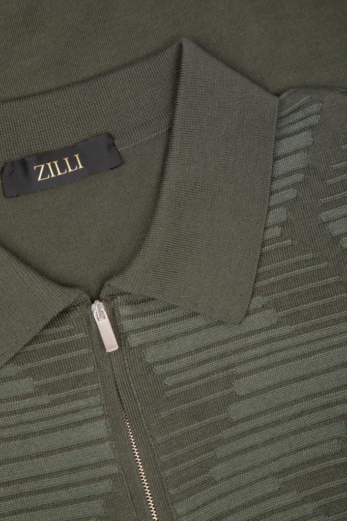 Поло прямого силуэта от Zilli. Изделие выполнено из мягкого хлопка и гладкого шёлка лицевой гладью. Поверхность передней части модели с короткими рукавами декорирована жаккардовым геометрическим узором на фоне цвета хаки. Для комфортной посадки по фигуре в поло предусмотрены широкий эластичный пояс и манжеты-резинки.