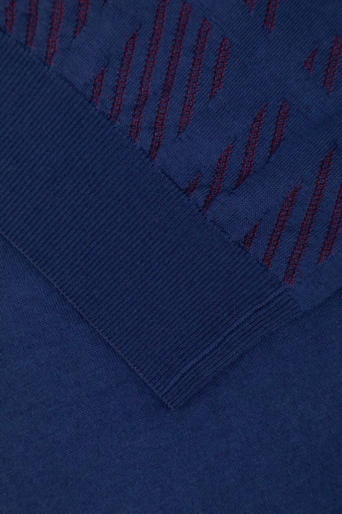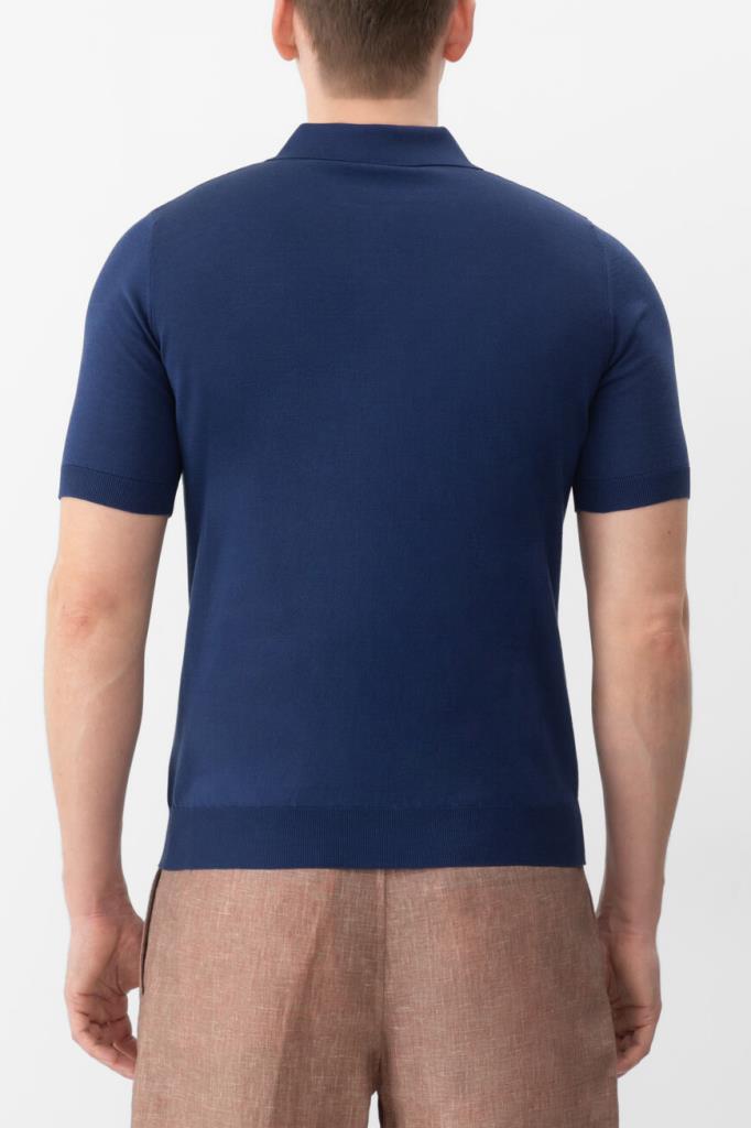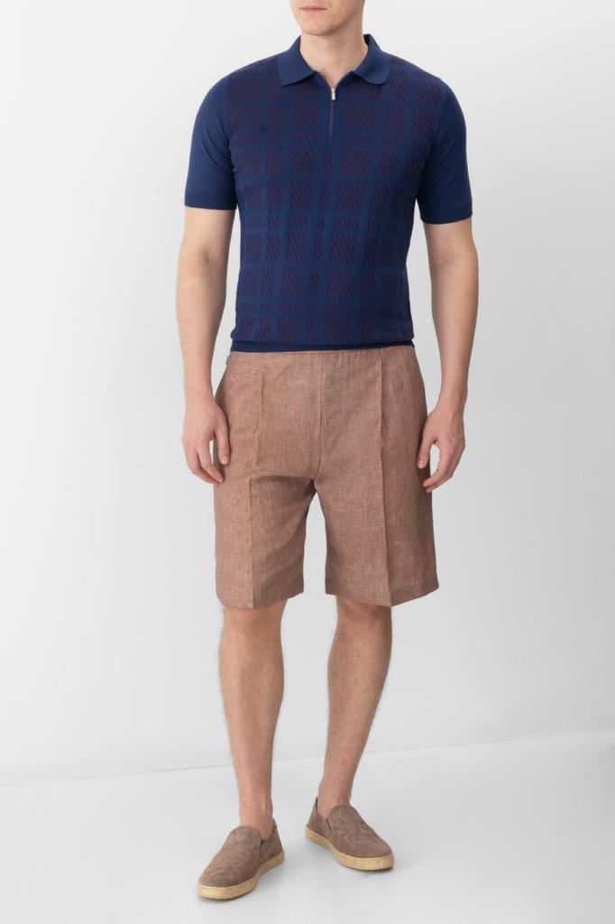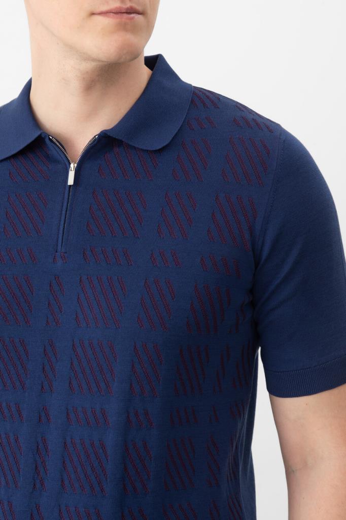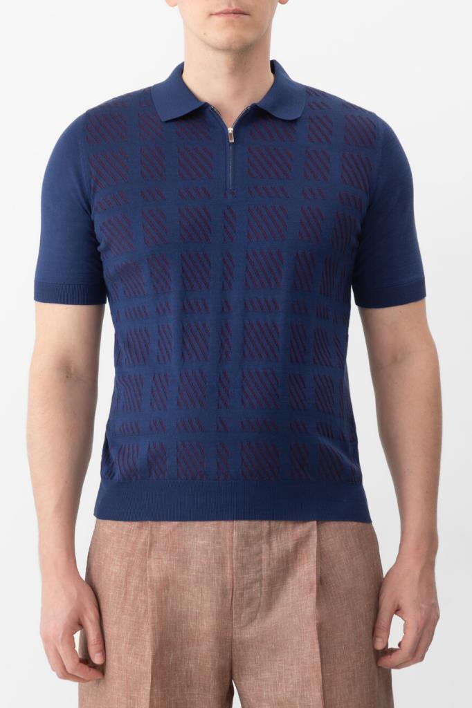 Прямое поло Zilli на молнии с брендированным металлическим пуллером. Для производства изделия выбраны хлопок и гладкий шёлк синего цвета с диагональным геометрическим мотивом в крупную клетку бордового оттенка спереди. Конструкция повседневной модели предполагает наличие коротких рукавов и широкого эластичного пояса и манжет-резинок для оптимальной посадки по фигуре. Образ можно завершить шортами с классическими стрелками и защипами сверху из той же коллекции.