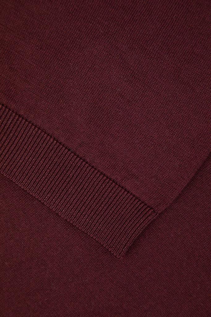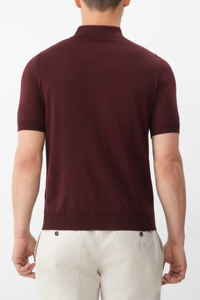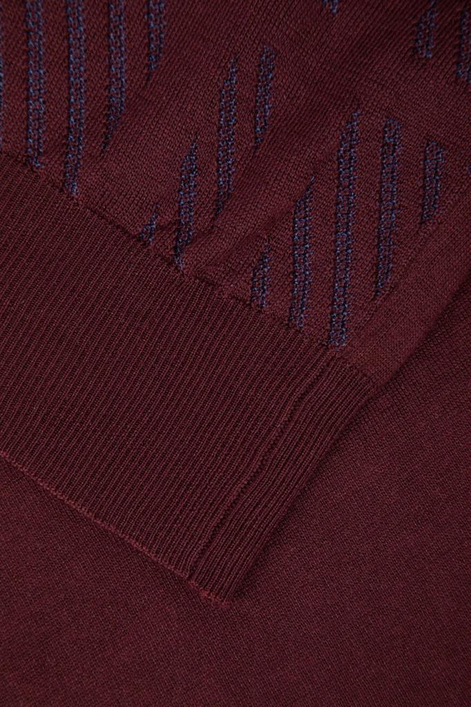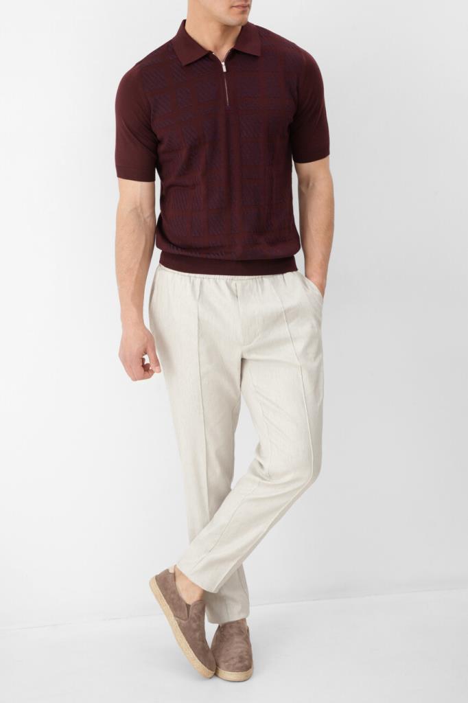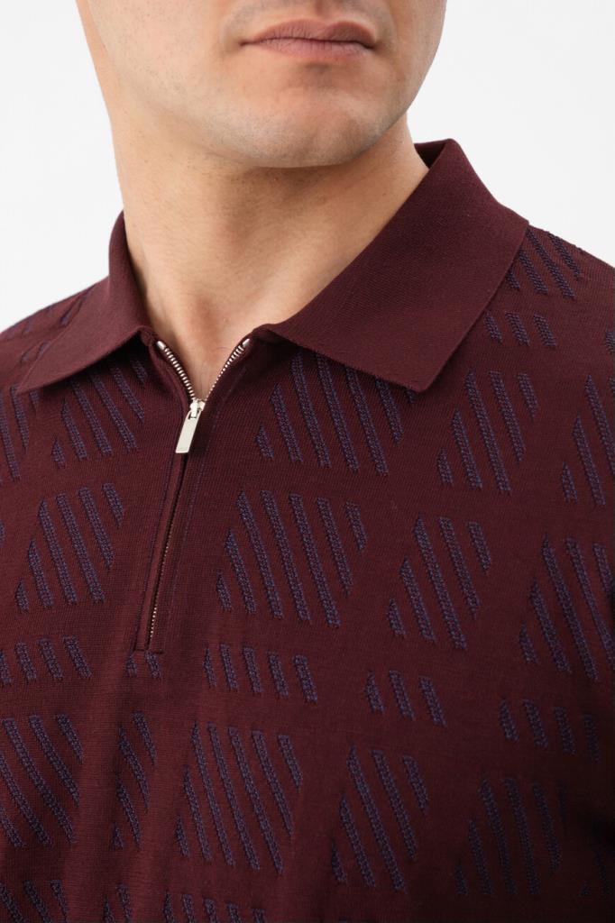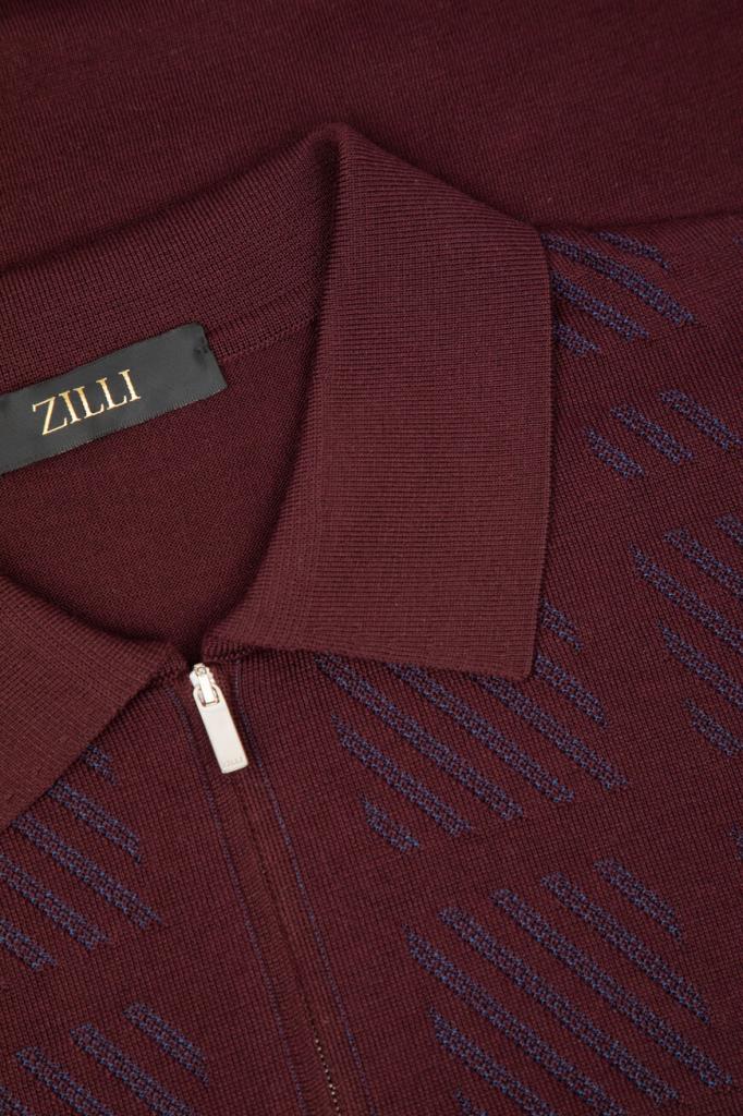 Поло Zilli из мягкого трикотажа на основе хлопка и гладкого шёлка. Передняя сторона изделия бордового оттенка покрыта диагональным геометрическим мотивом в крупную клетку тёмно-синего цвета. О принадлежности модели прямого силуэта Дому деликатно напоминает гравировка на серебристом металлическом пуллере молнии.