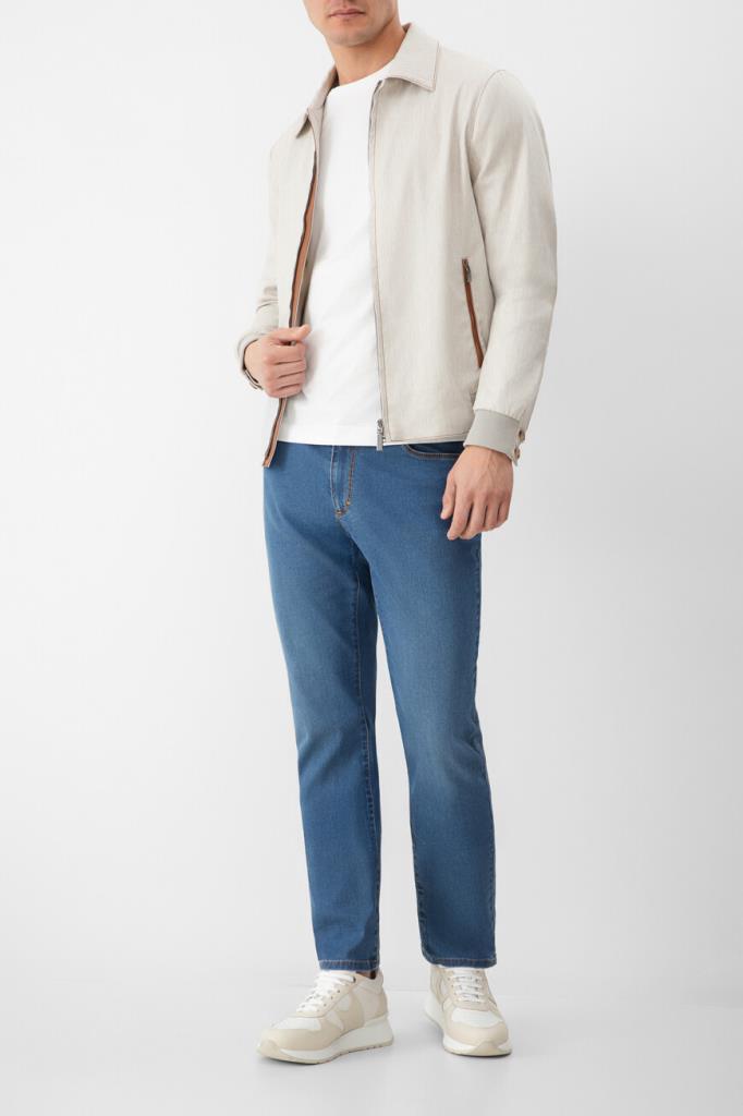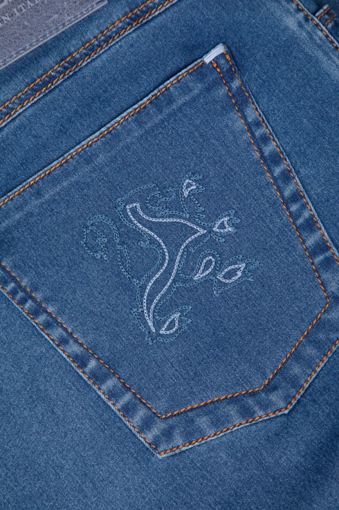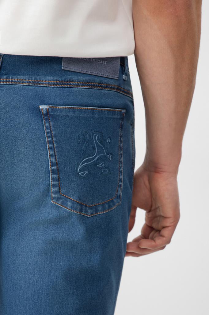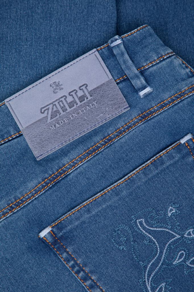 Стрейчевые джинсы Zilli с оранжевой прострочкой на швах. Изделие выполнено из мягкого денима на основе хлопка и прочного полиэфира синего цвета с эффектом делаве. Принадлежность традиционной пятикарманной модели Дому обозначена патчем со знаковой символикой в задней части и крупным вышитым грифоном на правом заднем кармане. Джинсы станут незаменимой частью повседневного гардероба мужчины.