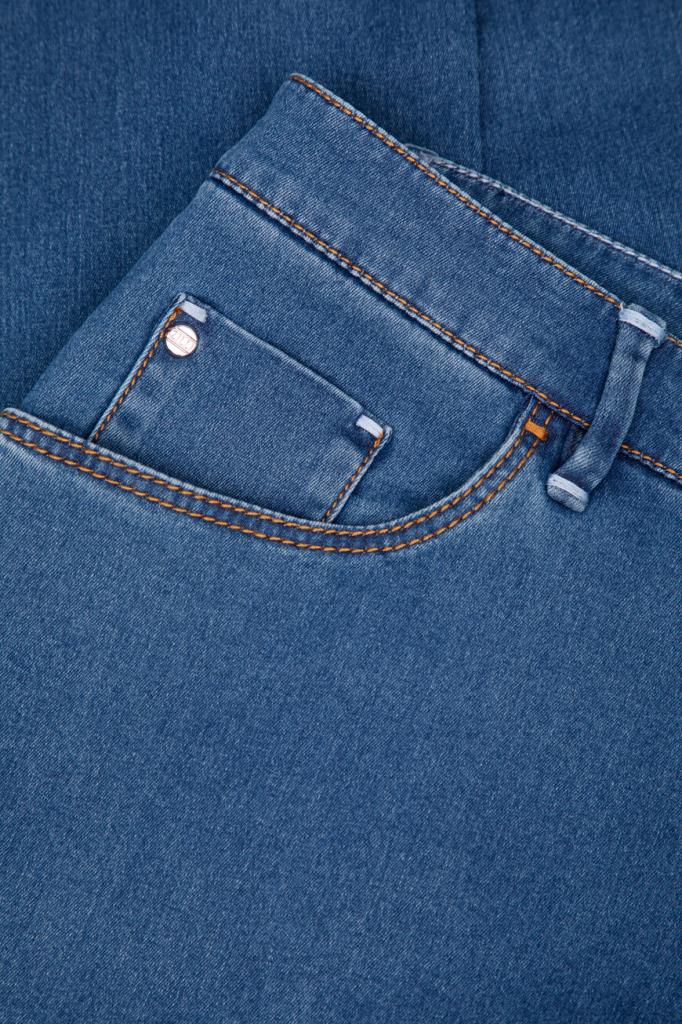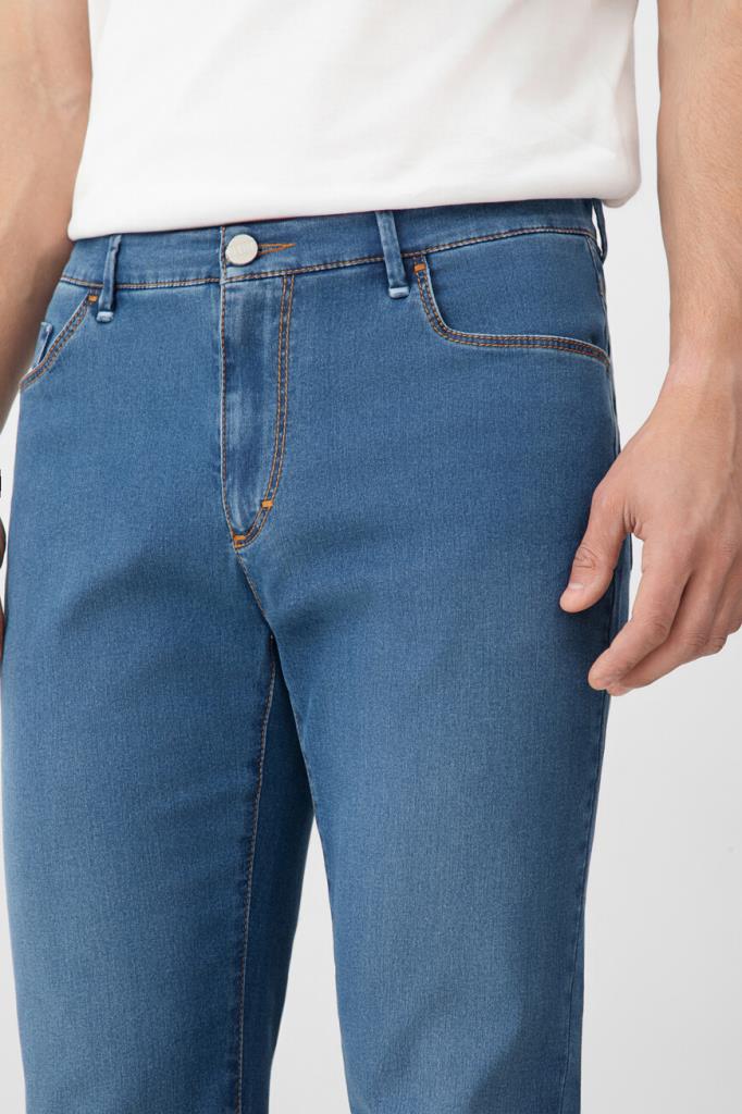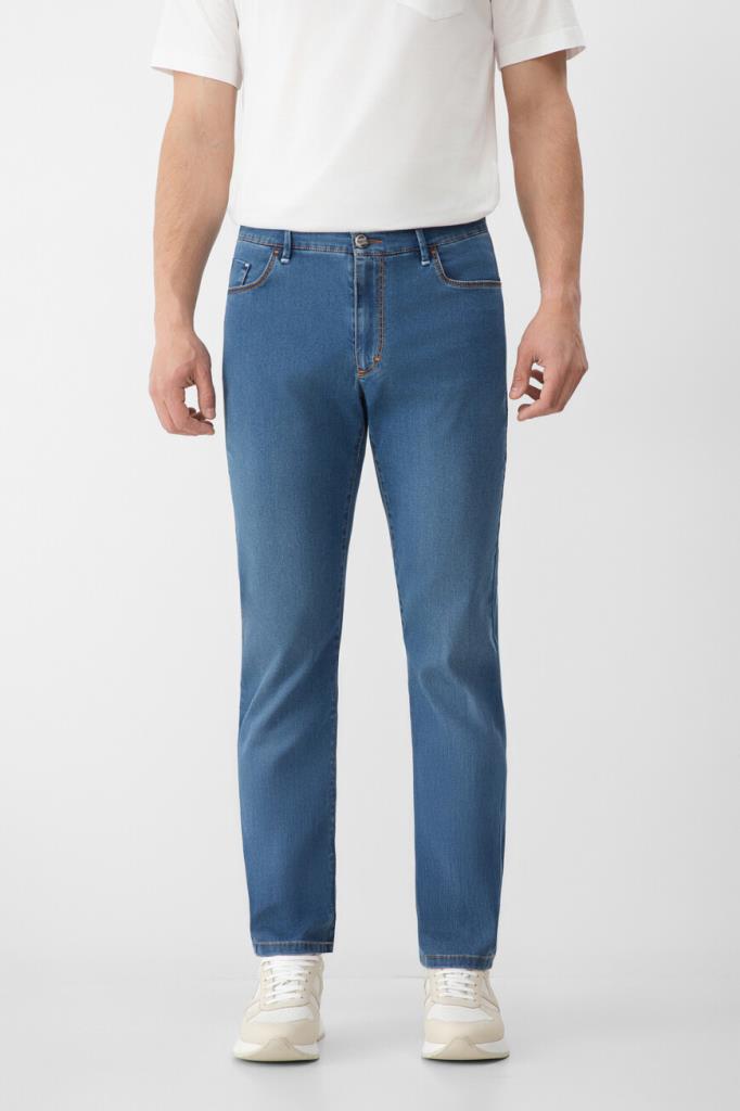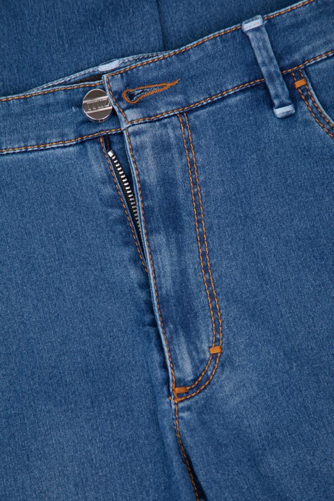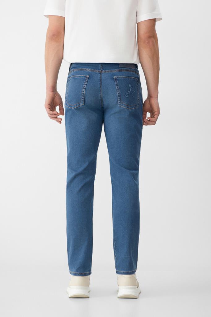 Стрейчевые джинсы Zilli с оранжевой прострочкой на швах. Изделие выполнено из мягкого денима на основе хлопка и прочного полиэфира синего цвета с эффектом делаве. Принадлежность традиционной пятикарманной модели Дому обозначена патчем со знаковой символикой в задней части и крупным вышитым грифоном на правом заднем кармане. Джинсы станут незаменимой частью повседневного гардероба мужчины.