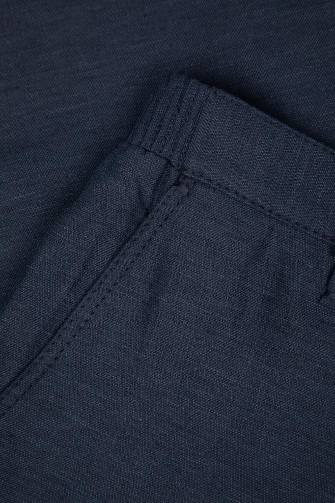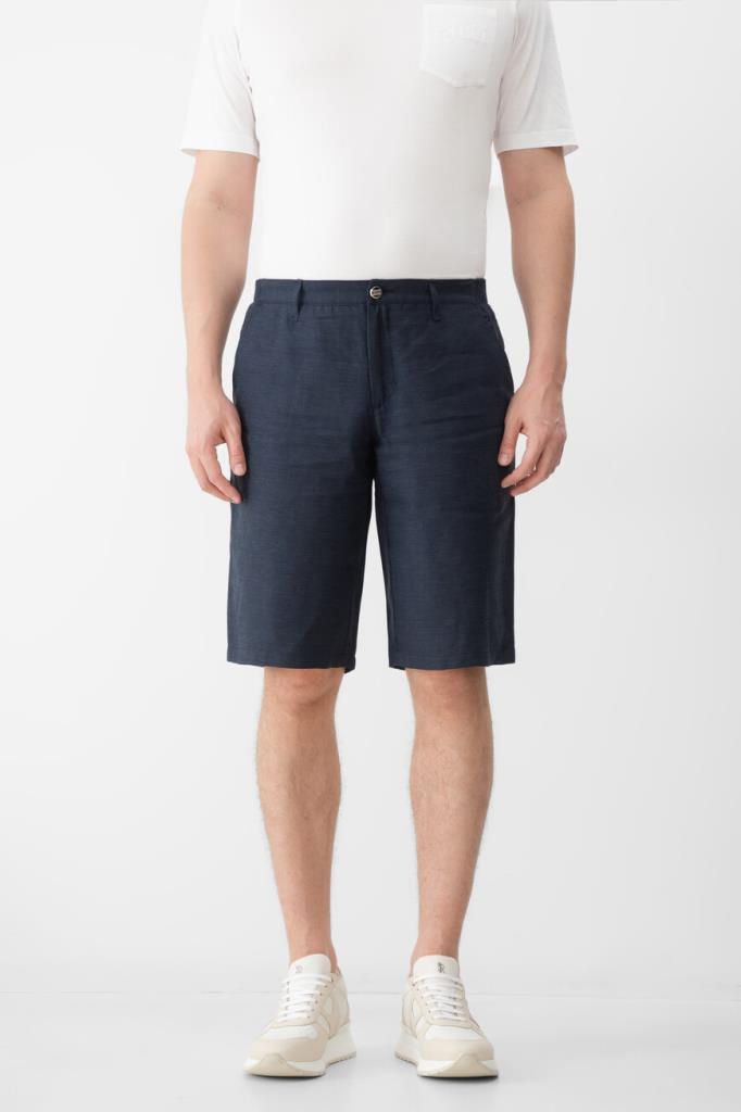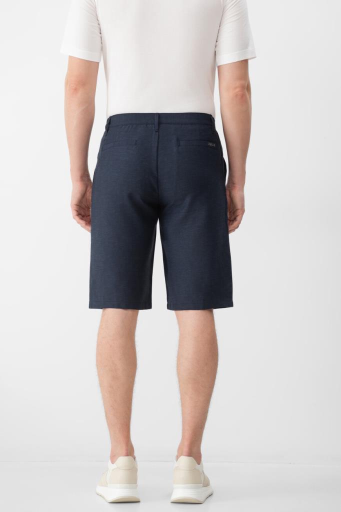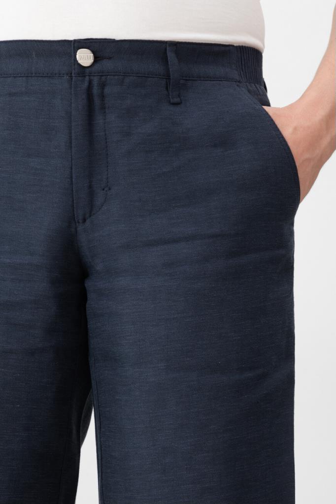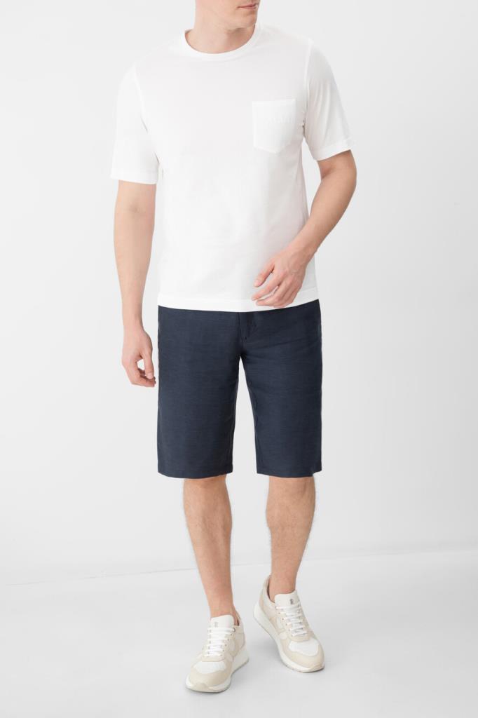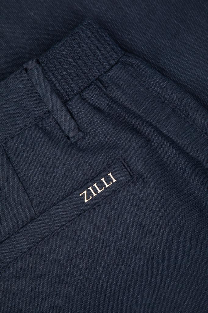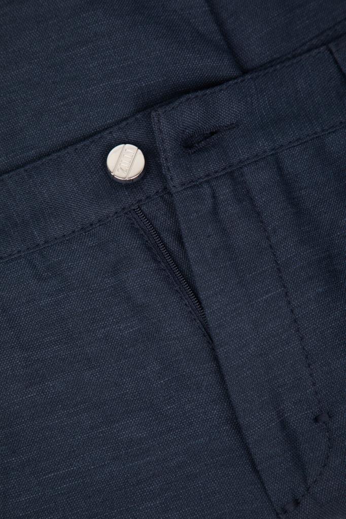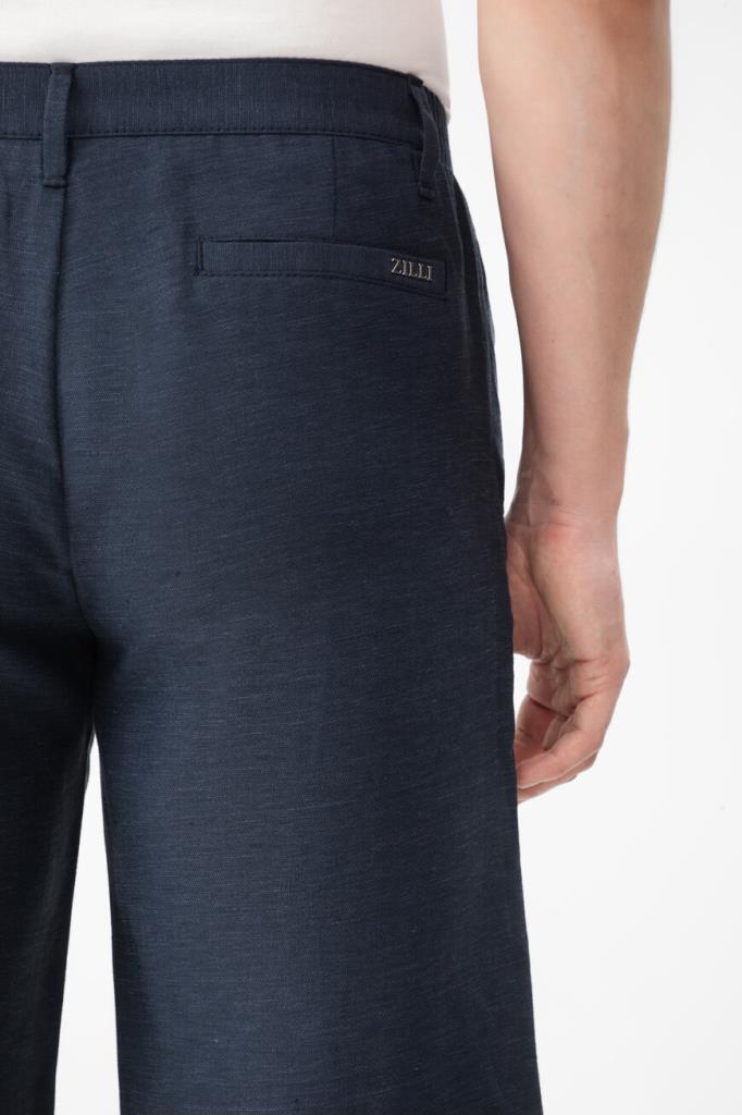 Бермуды ZILLI на молнии, покрытой планкой, и брендированной пуговице. Конструкция повседневной модели тёмно-синего цвета, изготовленной из гладкого шёлка и льна, предполагает наличие плотного пояса со шлевками под ремень и эластичной вставкой в задней части и четырёх прорезных карманов. Правый задний карман декорирован рельефной надписью-лого Дома из серебристого металла, а подкладка карманов выполнена из прочного полиэстера и покрыта логотипированным принтом.
