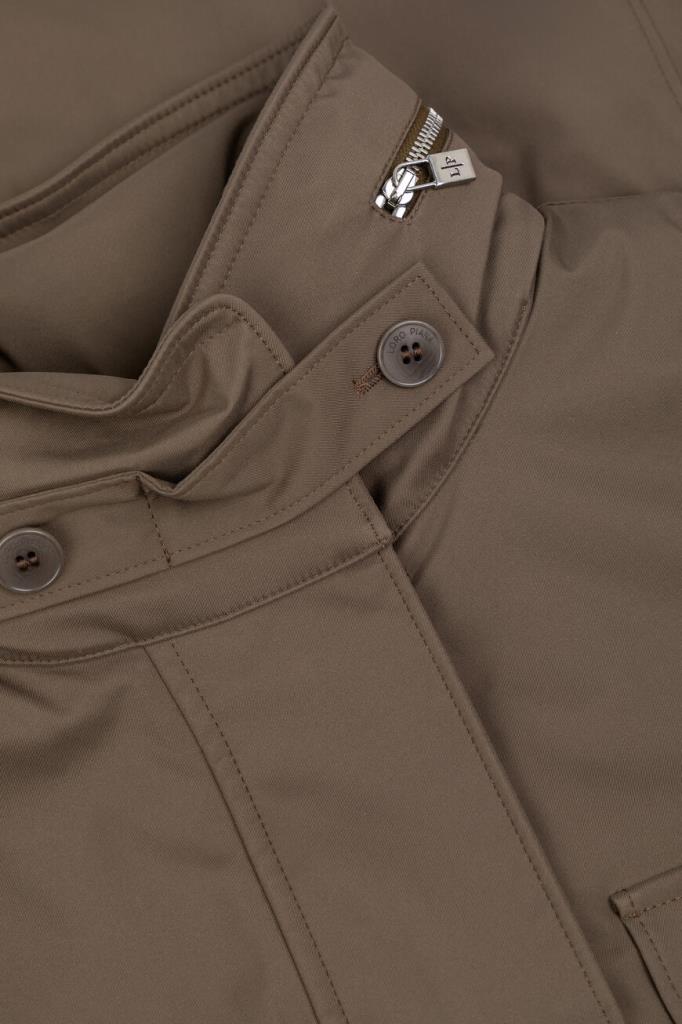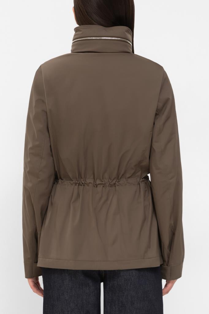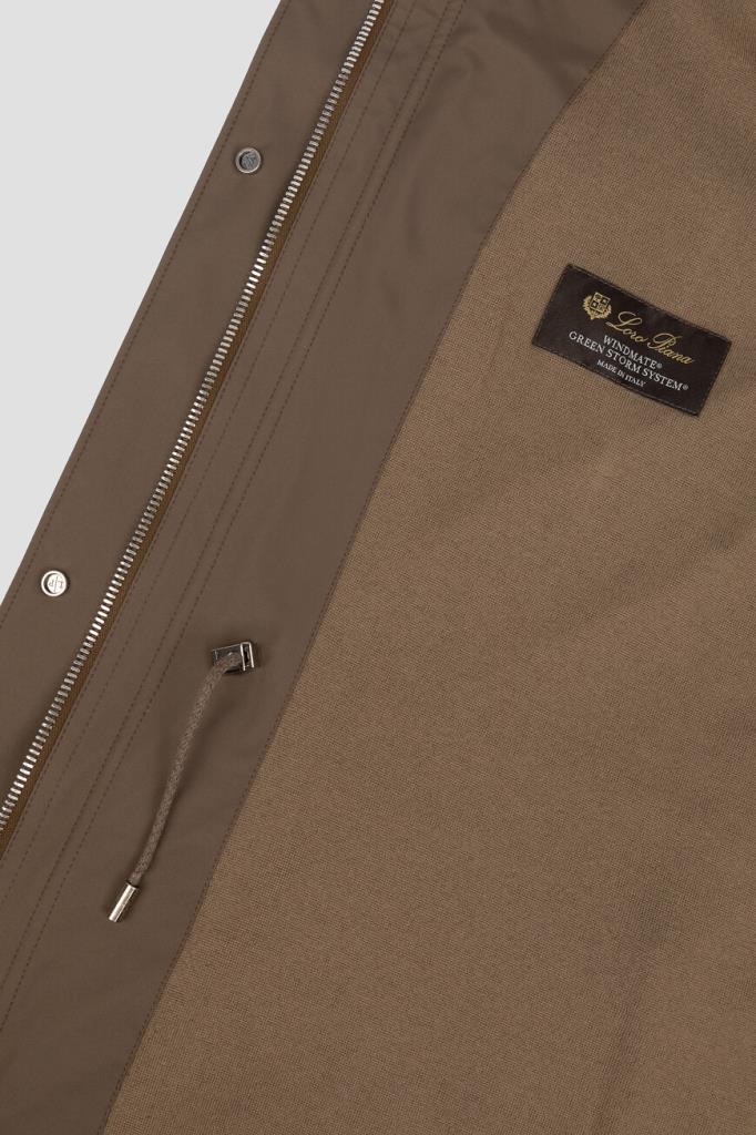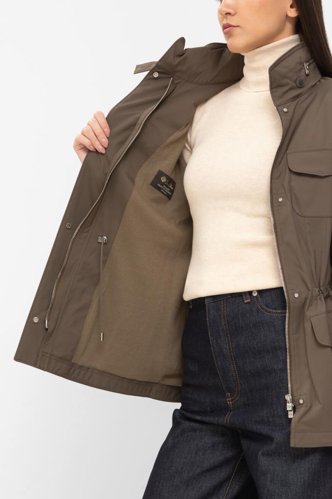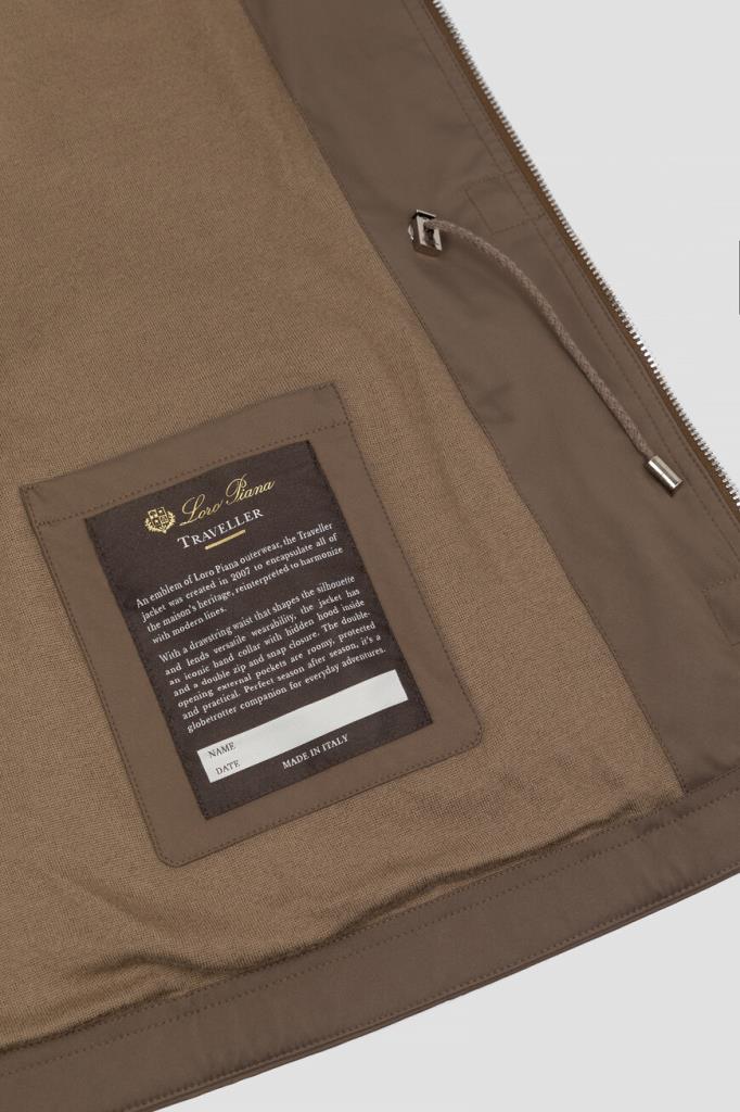Куртка Traveller из прочного эковолокна WindMate® Stretch от бренда Loro Piana. Фасон изделия прилегающего силуэта на основе микрофибры, обработанной по технологии Storm System® для обеспечения водоотталкивающего и ветроустойчивого покрытия, предполагает наличие высокого воротника-стойки с патой на роговой пуговице спереди и застёжку на потайную молнию и клёпки с планкой. Лёгкая немнущаяся модель без декора оснащена талией на скрытой кулиске и подкладкой из мягкого нежного кашемира.