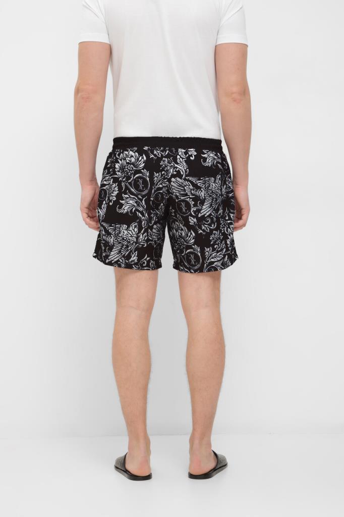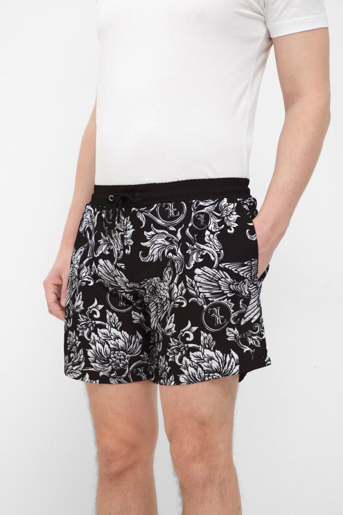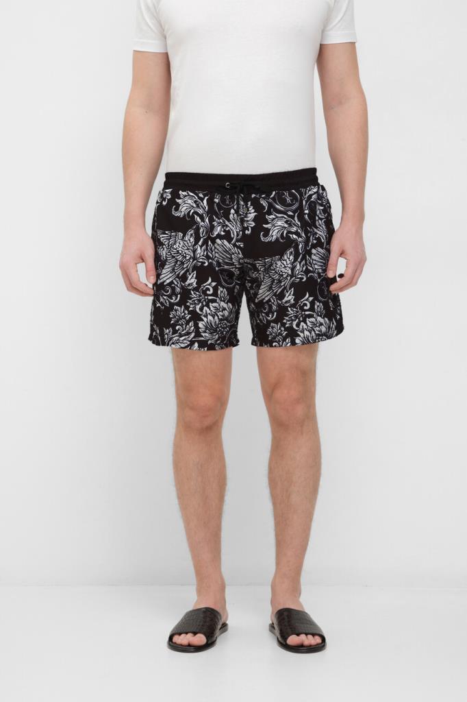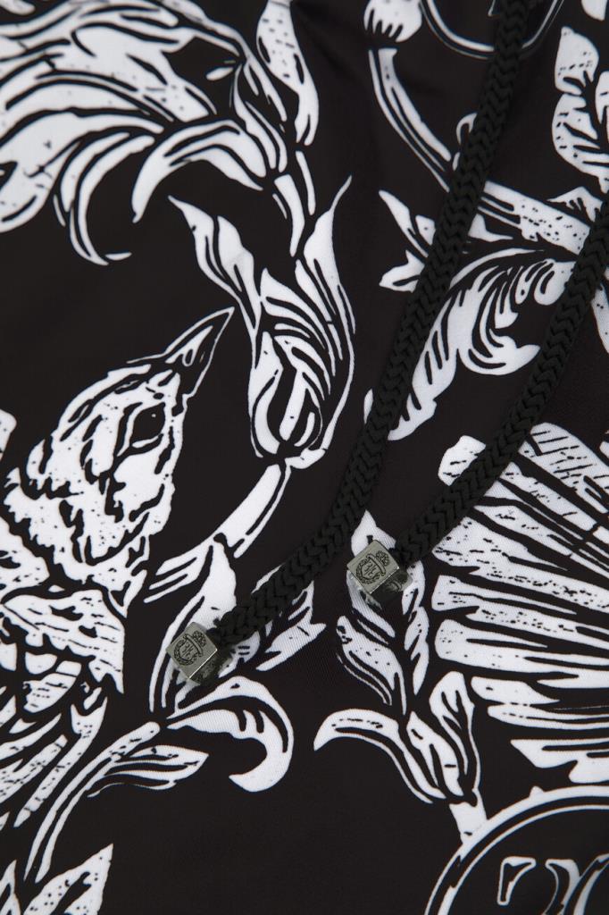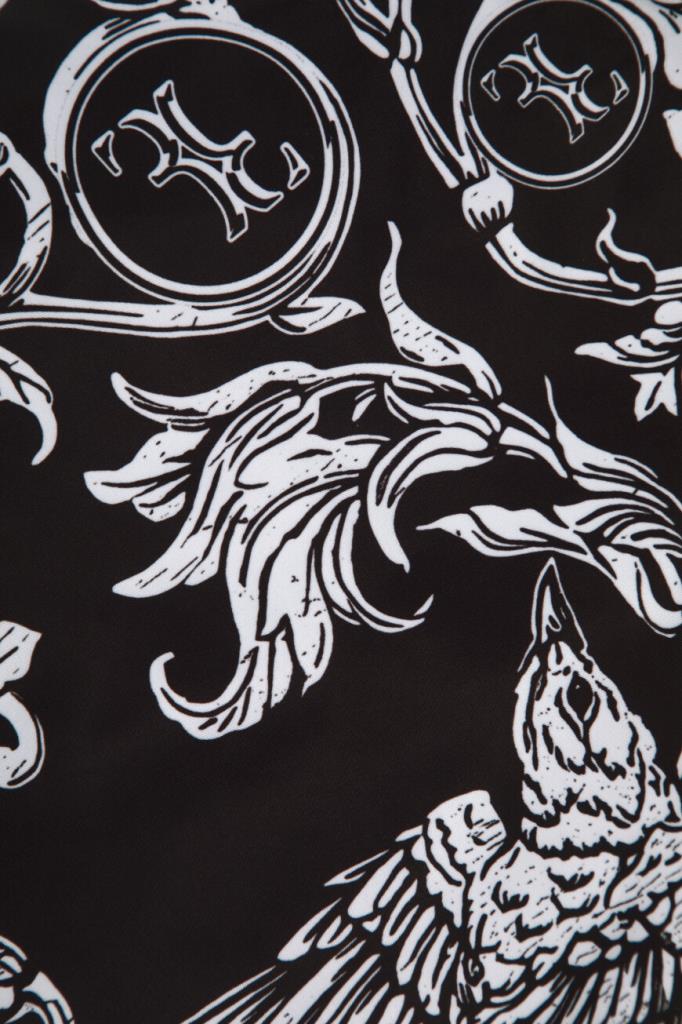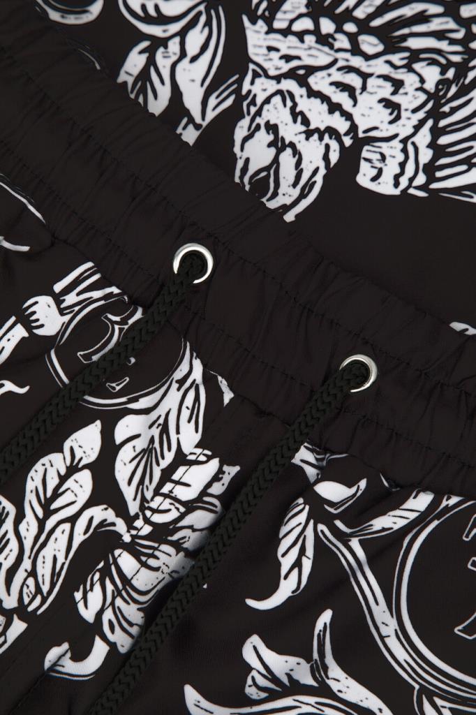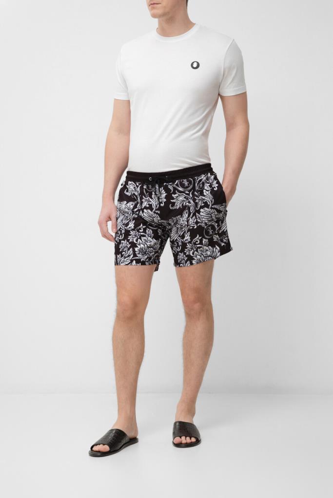 Чёрно-белые плавки-боксеры Billionaire с широким эластичным поясом-кулиской. На поверхности модели, изготовленной из прочного износостойкого полиэфира, размещены растительный принт, изображения птиц и символика Дома. Особенностями изделия стали наличие сетчатой подкладки и двух прорезных карманов.