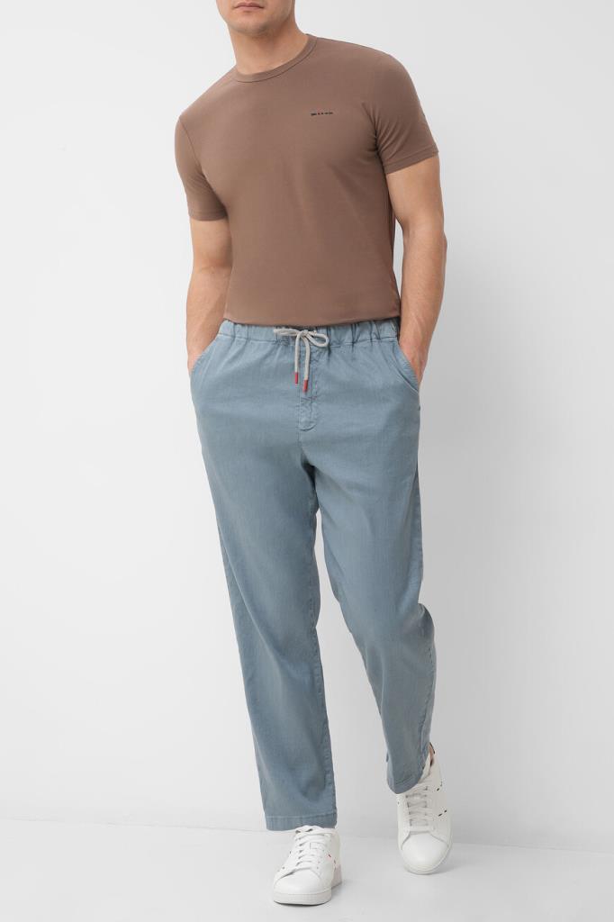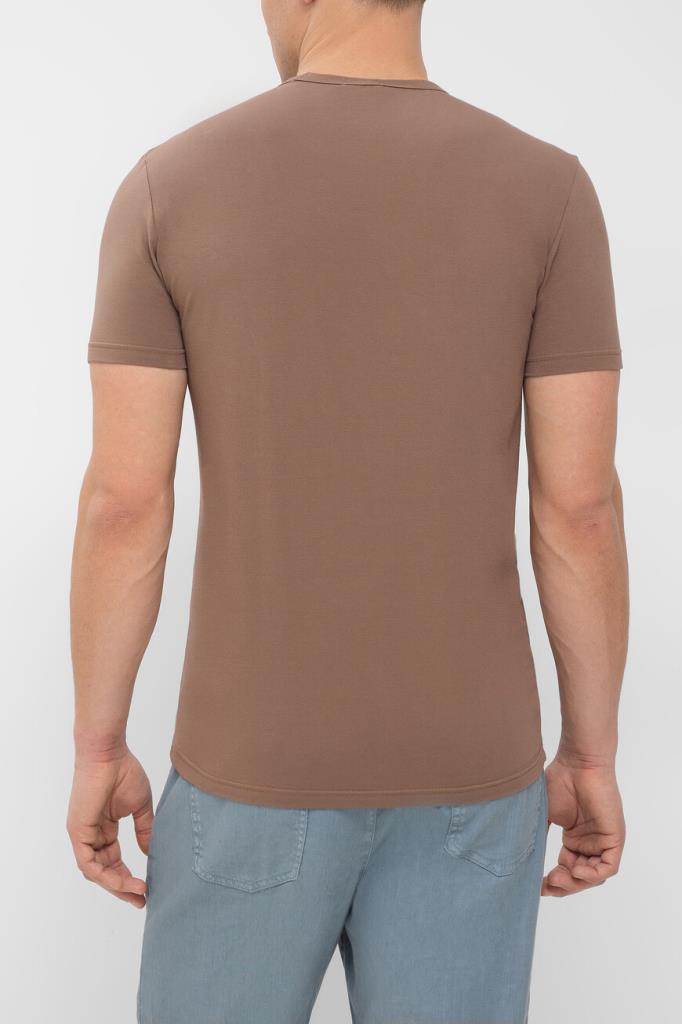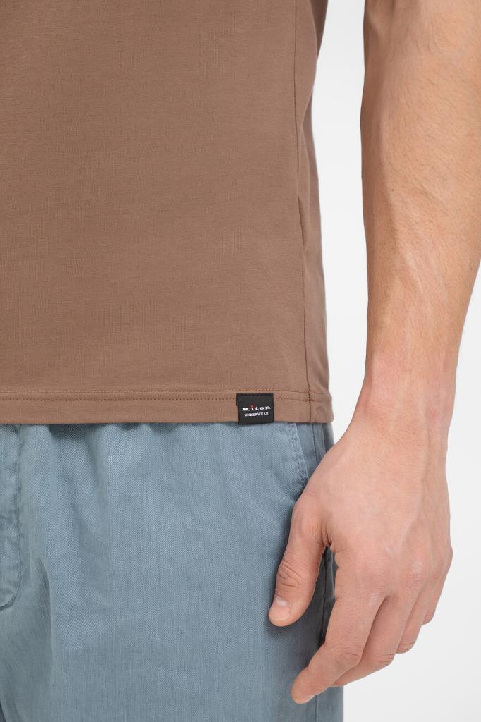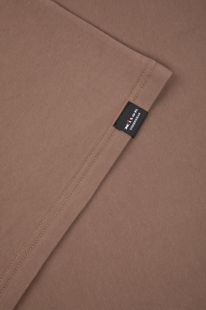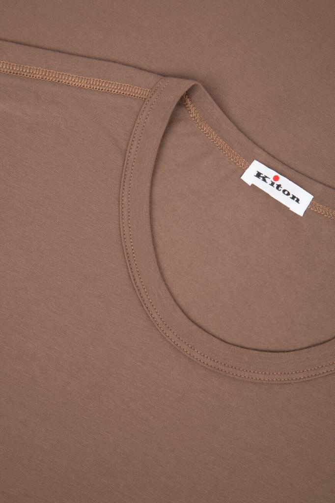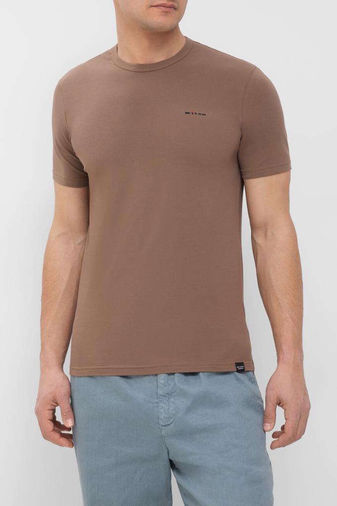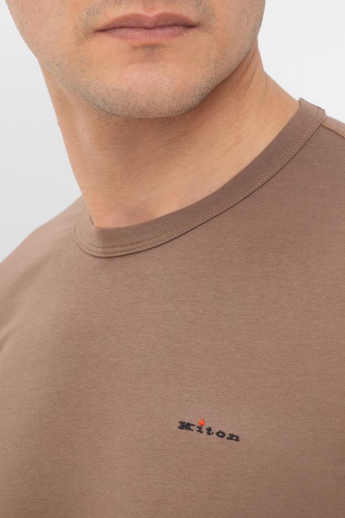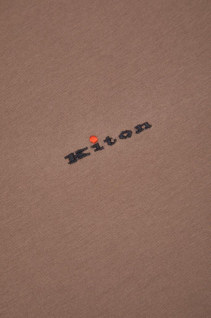 Футболка Kiton с видимыми плечевыми швами. Модель изготовлена из эластичного хлопкового джерси коричневого оттенка с гладкой текстурой. О принадлежности изделия прямого силуэта Дому деликатно напоминают вышитый чёрный логотип слева на груди и чёрно-белая вставка спереди. Образ можно завершить голубыми брюками с плотным эластичным поясом на кулиске из той же коллекции.