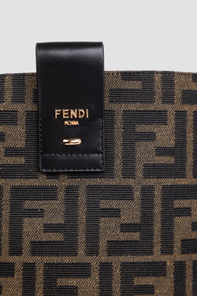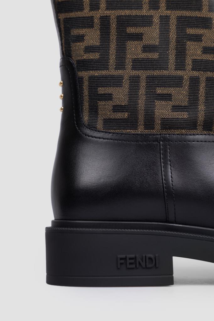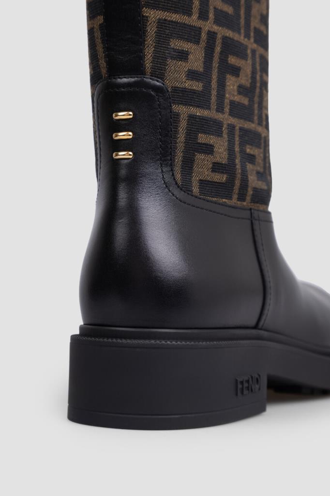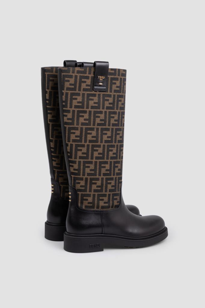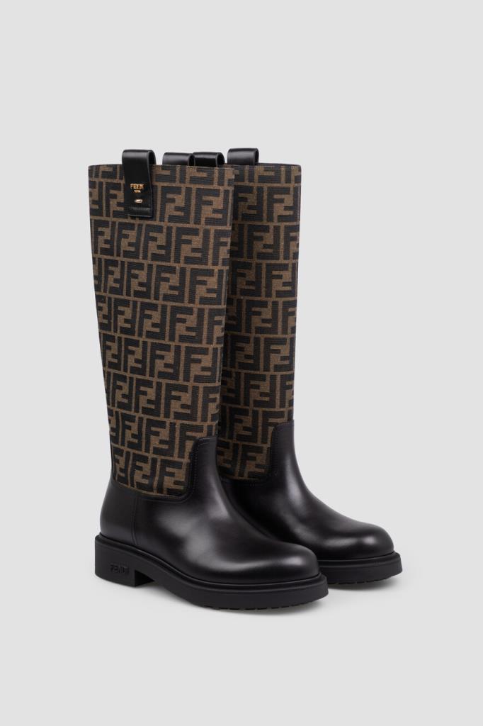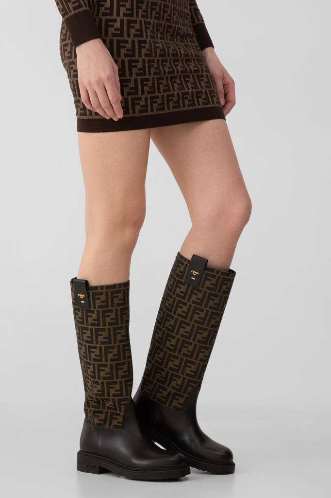 Сапоги Fendi Filo с высоким прямым голенищем и округлым носком. Для изготовления модели выбрана плотная жаккардовая ткань на основе хлопка и полиэфира с геометрическим мотивом FF. Изделие выполнено в коричневых тонах и дополнено вставкой из гладкой телячьей кожи чёрного цвета у основания. Комбинированная пара обуви декорирована стежками-строчкой Selleria из металла светло-золотого оттенка на боковинах и заднике и украшена золотистой надписью-лого Дома на кожаных лентах для удобства надевания.
