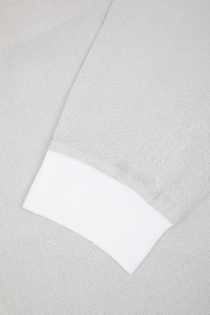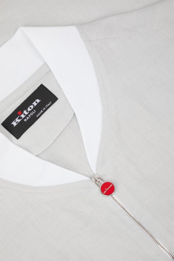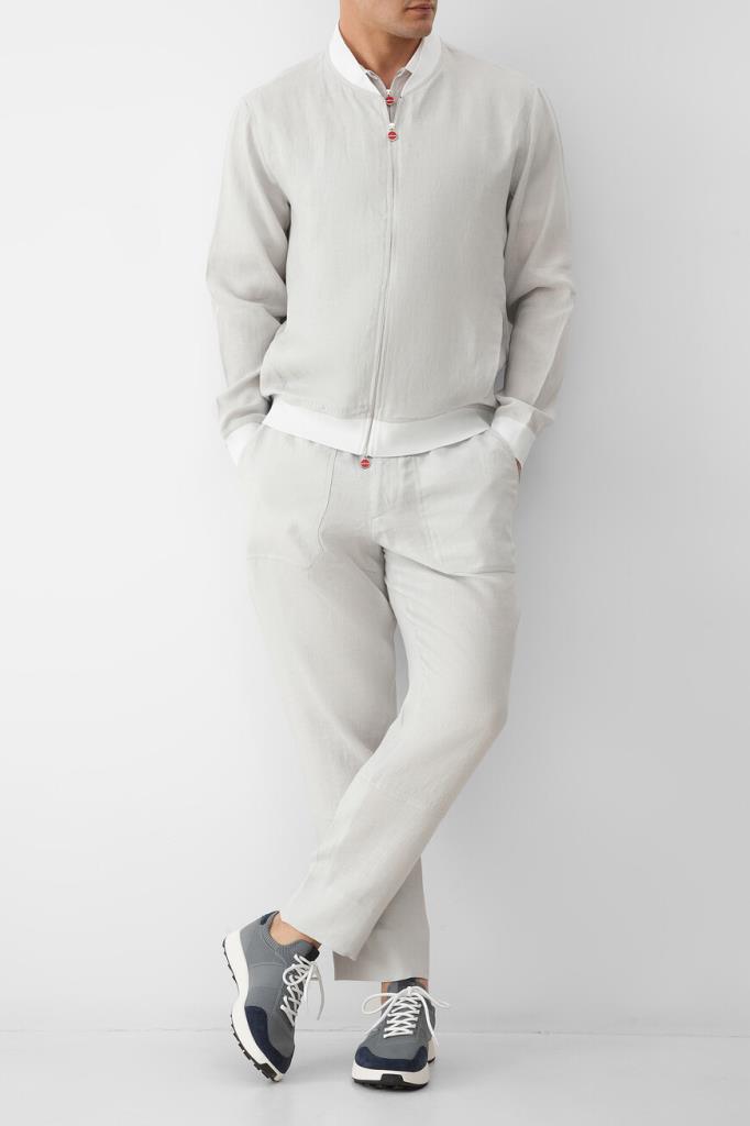 Бомбер Kiton светло-серого оттенка с белыми полосами-декором. Для производства изделия прямого силуэта выбран лёгкий мягкий лён. Трикотажные воротник-стойка, манжеты рукавов и широкий пояс дополнены резинкой, а модель оснащена застёжкой на встречную молнию с двумя брендированными эмалированными пуллерами. Бомбер будет смотреться выигрышно в тандеме с поло с неброской знаковой символикой Дома и брюками в спортивном стиле из той же коллекции.