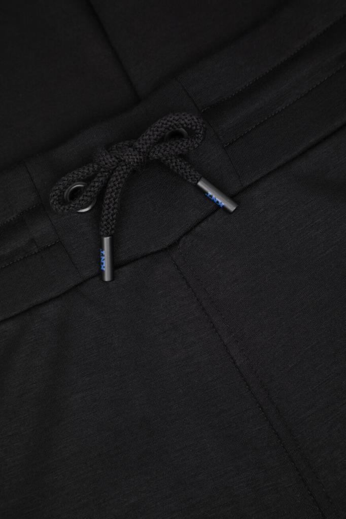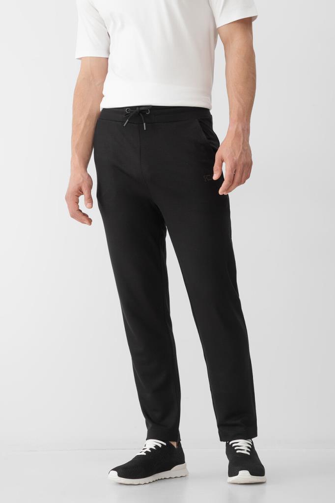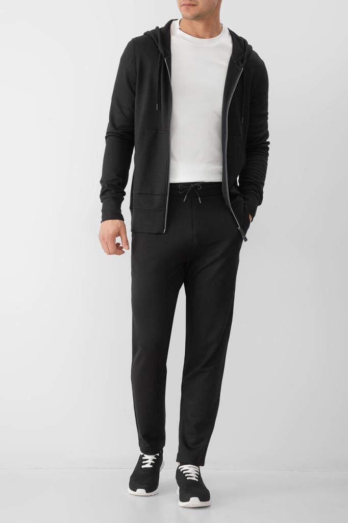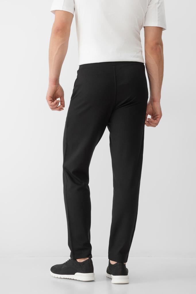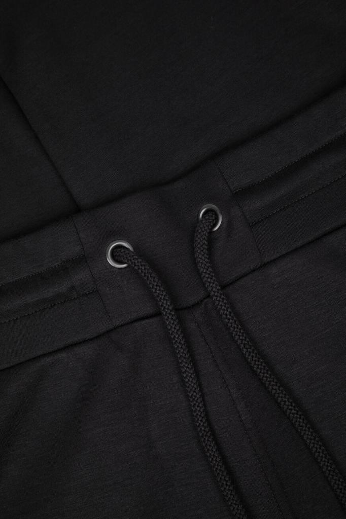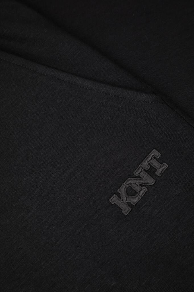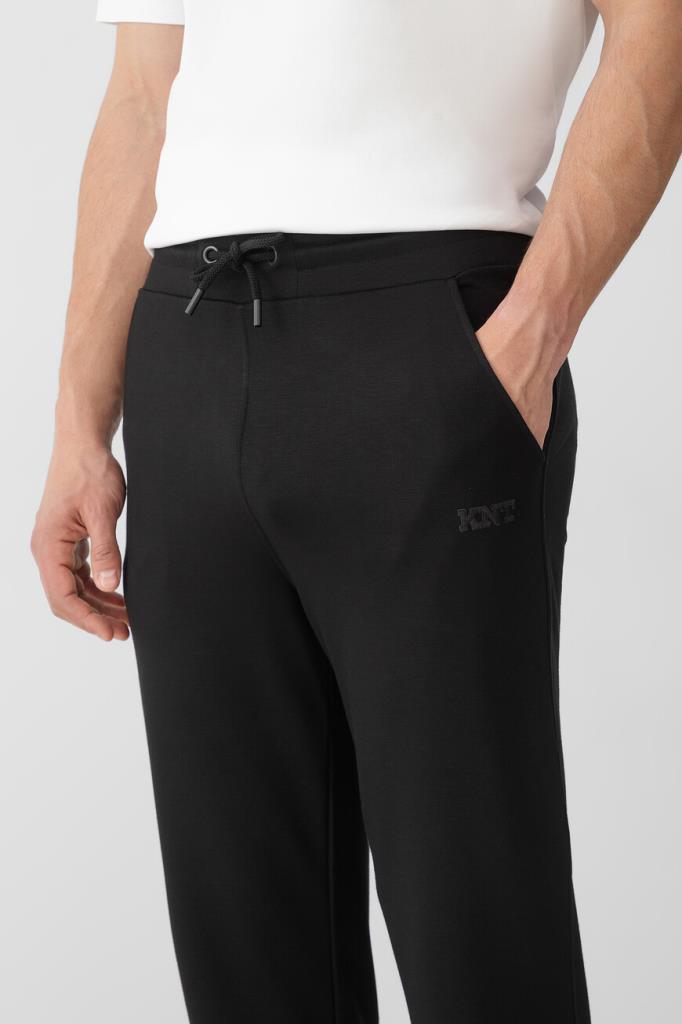 Лёгкие брюки Kiton в спортивном стиле из коллекции KNT. Модель из эластичного вискозного волокна чёрного цвета получилась максимально комфортной. За это отвечают заниженная линия шагового шва, не сковывающая движения, и широкий эластичный пояс-кулиска, не впивающийся в кожу. На принадлежность изделия прямого силуэта Дому указывает тональная аббревиатура «KNT», вышитая под левым передним карманом.