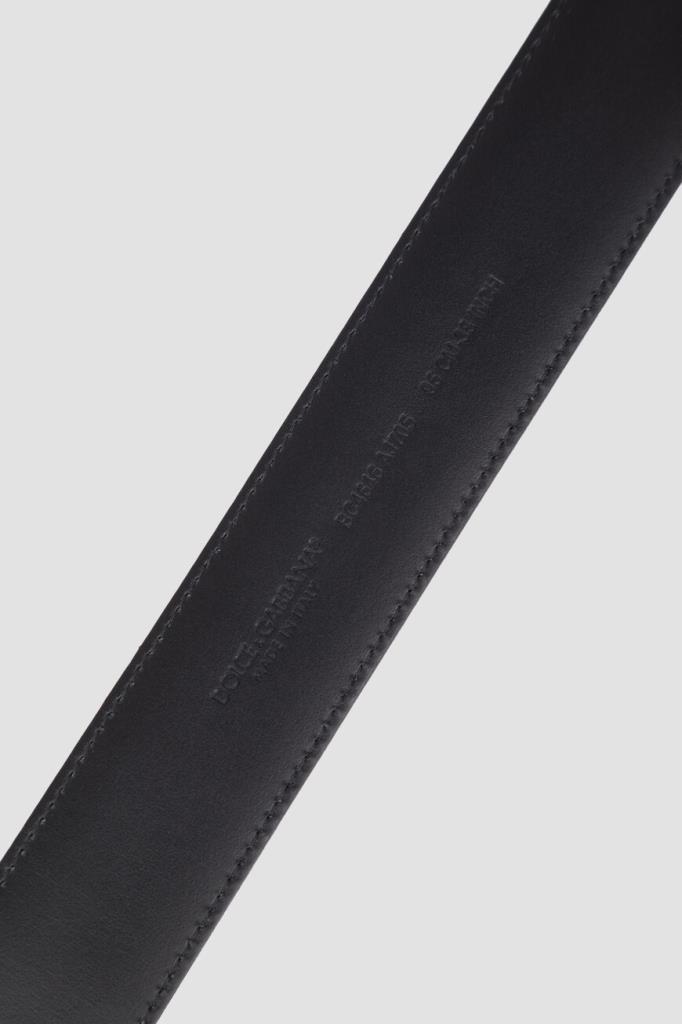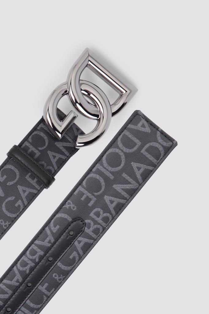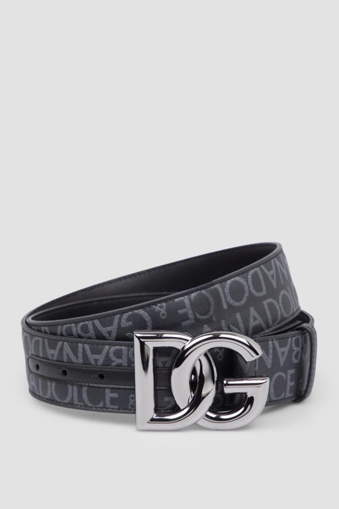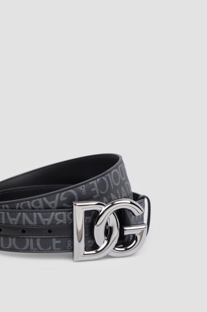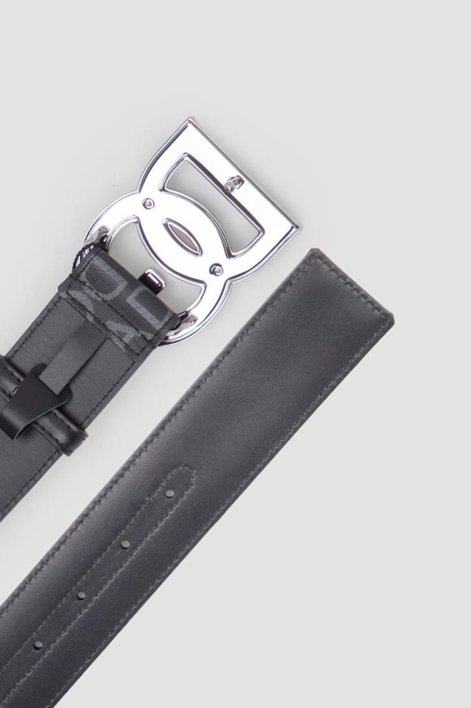 Комбинированный ремень Dolce & Gabbana с подвижным кожаным тренчиком. Для изготовления аксессуара используется плотный жаккард с деталями из гладкой телячьей кожи. Модель обработана специальным составом, отталкивающим влагу и грязь, и прошита по краю. Поверхность текстильной части изделия средней ширины покрыта геометрическим паттерном в виде повторяющегося лого Дома. Отличительной особенностью ремня является крупная пряжка в виде перекрёстного логотипа DG с рутениевым гальваническим покрытием.