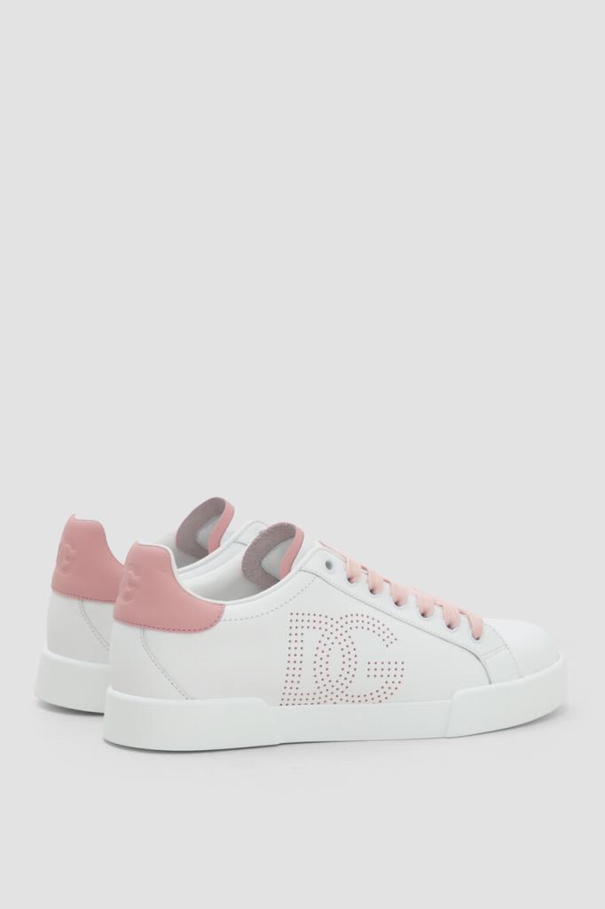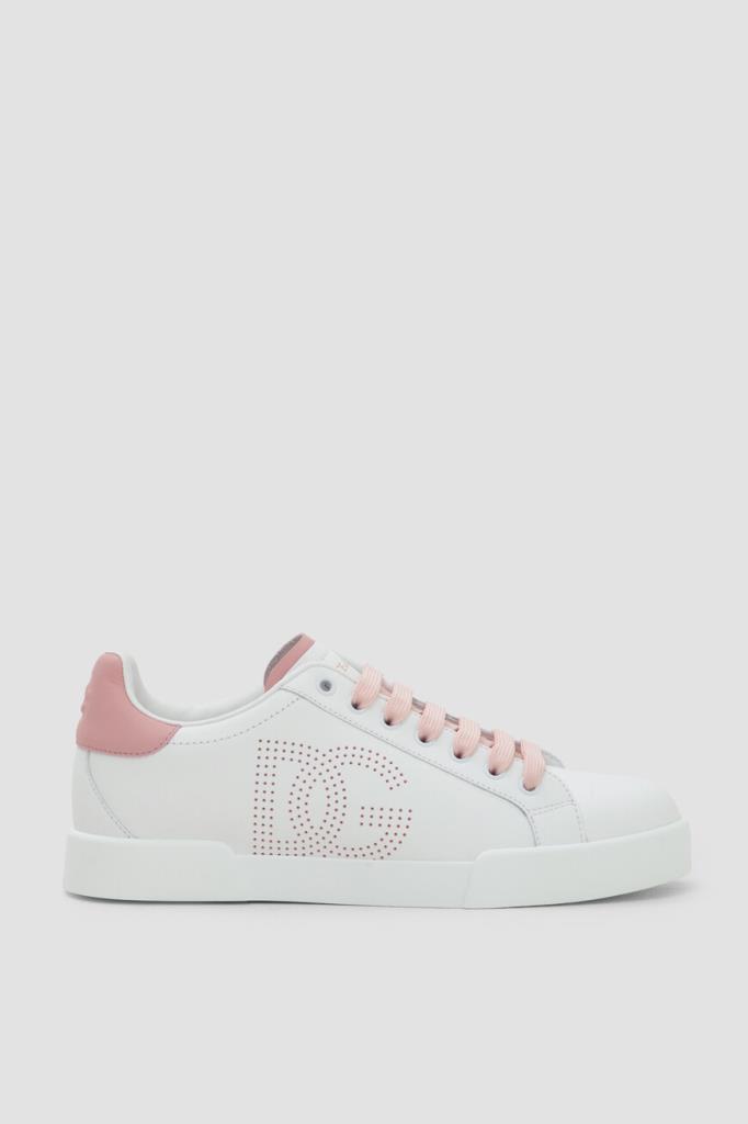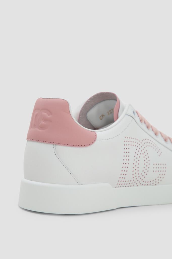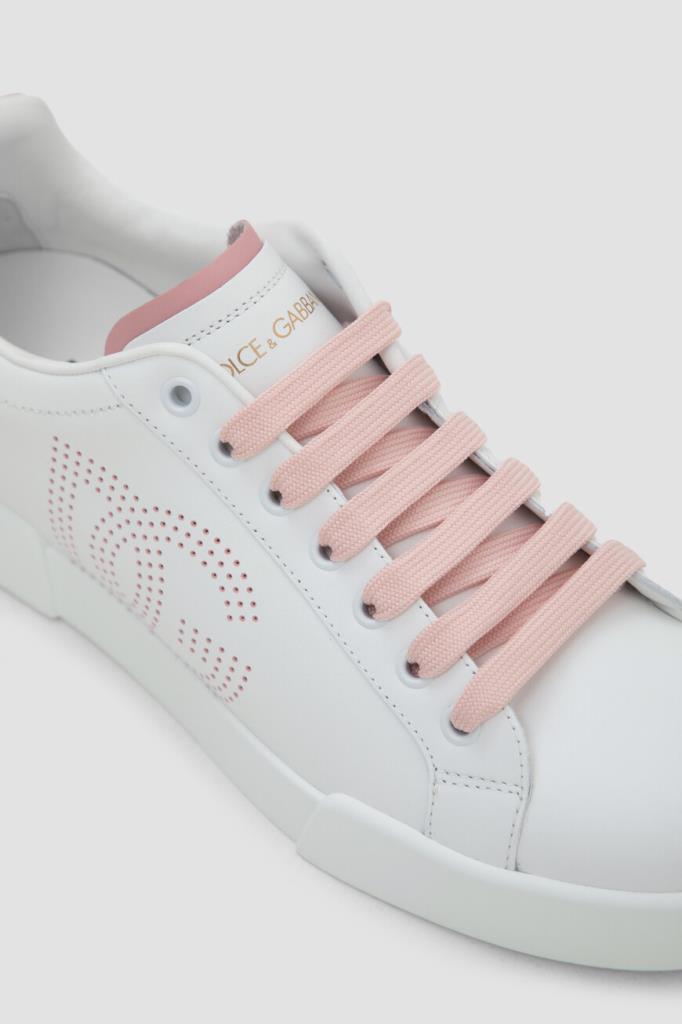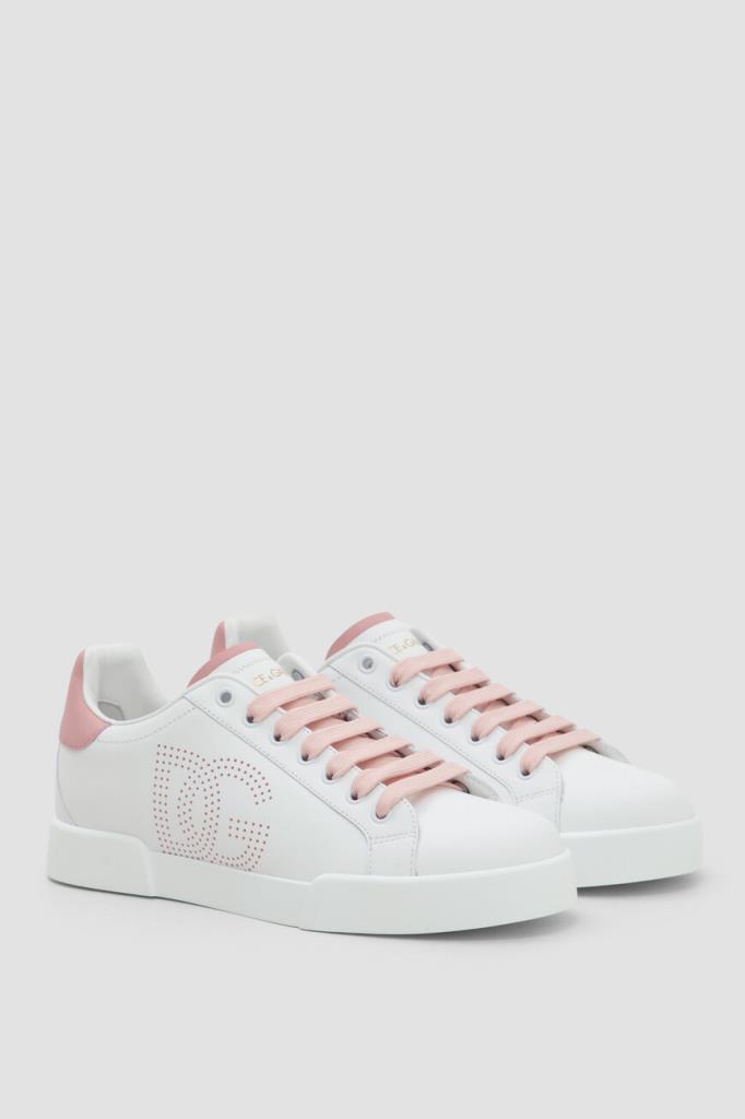 Белые сникеры Portofino от DOLCE & GABBANA с нежно-розовыми вставками. Для изготовления модели с широкой колодкой выбрана гладкая телячья кожа. Отличительными особенностями пары являются патч с золотистым логотипом на язычке, тиснёная монограмма DG на кожаной вставке сзади и крупная перфорация сбоку. Изделие установлено на гибкую резиновую подошву с рифленым протектором.