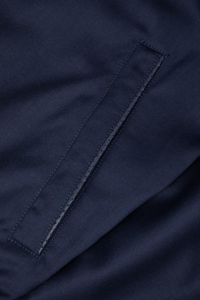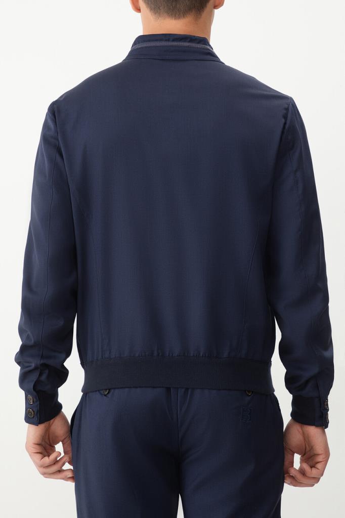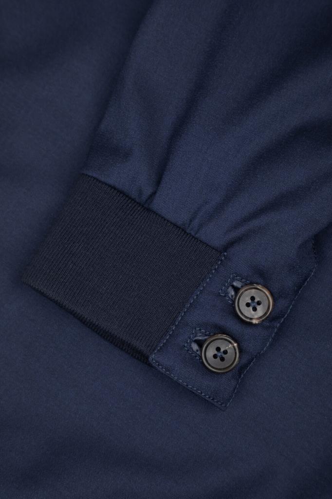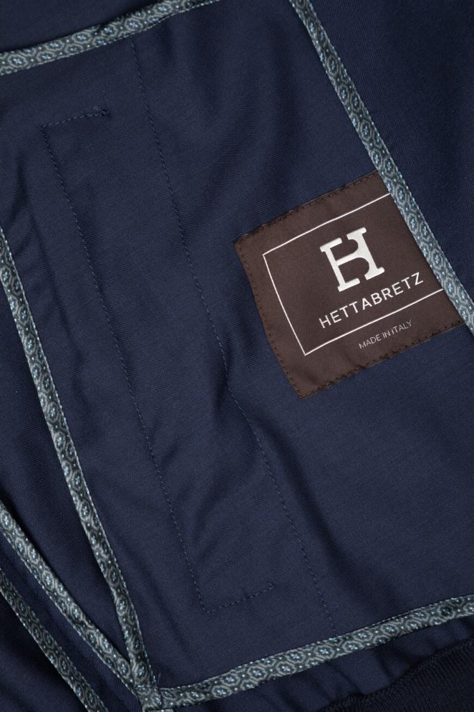 Тёмно-синяя куртка Hettabretz с невысоким воротником-стойкой. Для производства изделия прямого силуэта выбран трикотаж на основе мягкой шерсти и льна. Модель застёгивается на встречную молнию с двумя брендированными пуллерами и отличается наличием широкого эластичного пояса и манжет-резинок на крупных роговых пуговицах для оптимальной посадки по фигуре. Декором выступают кожаные полосы с узором и перфорацией сзади на воротнике и в отделке двух прорезных карманов по бокам соотвественно.