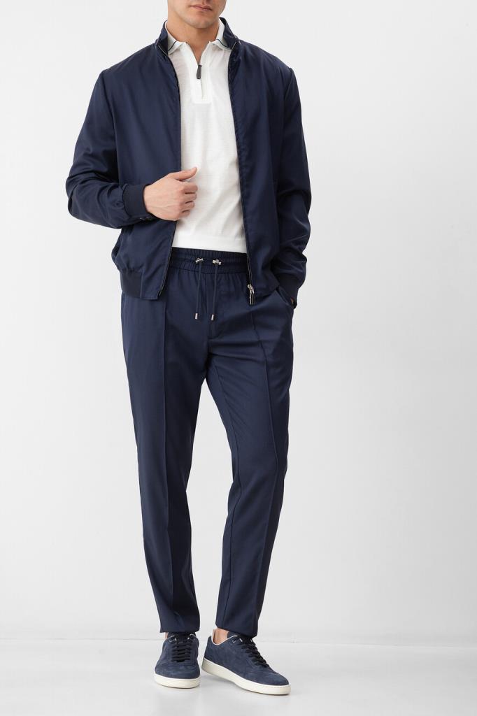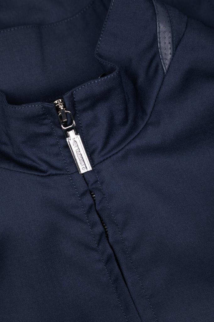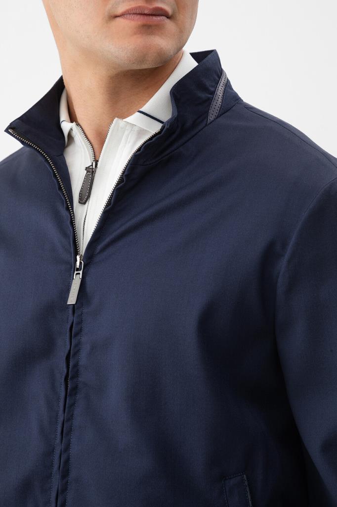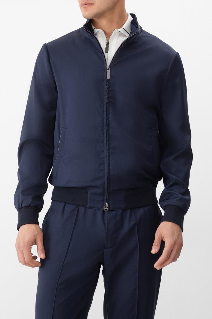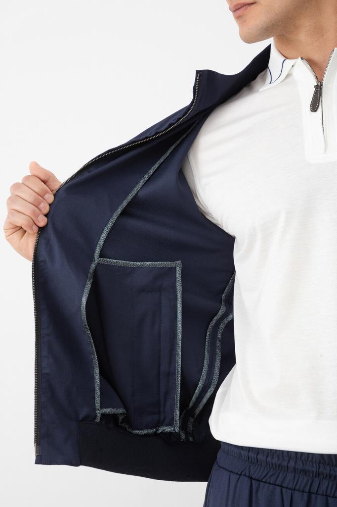 Тёмно-синяя куртка Hettabretz с невысоким воротником-стойкой. Для производства изделия прямого силуэта выбран трикотаж на основе мягкой шерсти и льна. Модель застёгивается на встречную молнию с двумя брендированными пуллерами и отличается наличием широкого эластичного пояса и манжет-резинок на крупных роговых пуговицах для оптимальной посадки по фигуре. Декором выступают кожаные полосы с узором и перфорацией сзади на воротнике и в отделке двух прорезных карманов по бокам соотвественно.