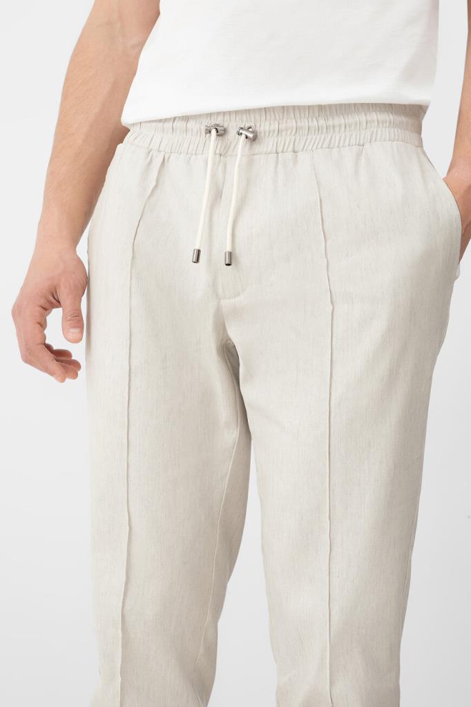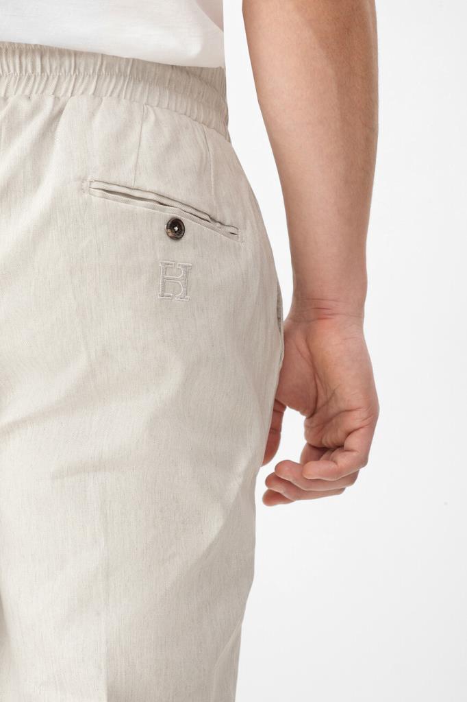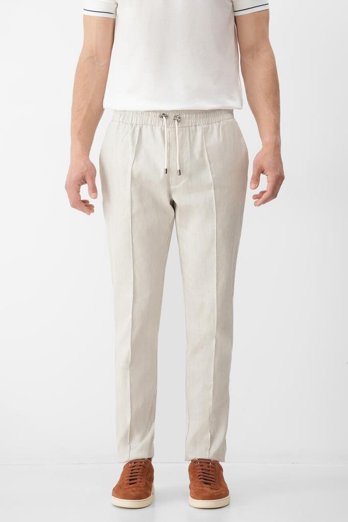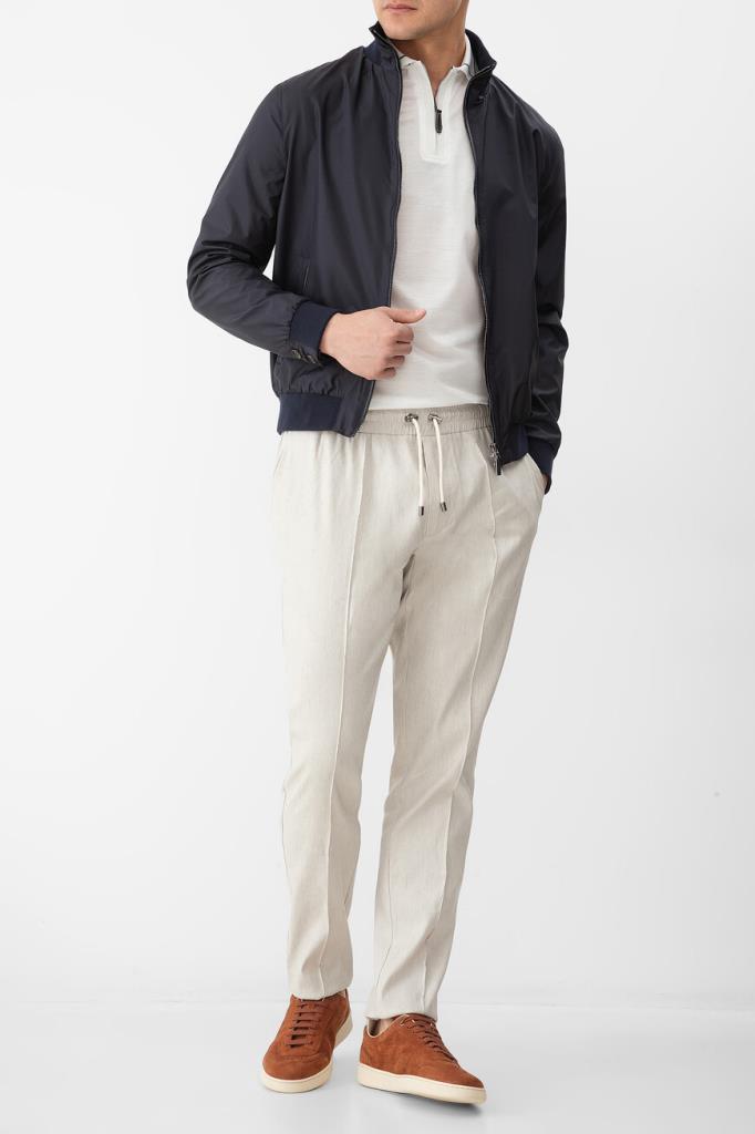 Трикотажные брюки Hettabretz с четырьмя прорезными карманами. Изделие прямого силуэта сшито из мягкого хлопка и льна с добавлением эластичных волокон. Модель сочетает в себе элементы классического и спортивного стилей: очерченные стрелки и широкий эластичный пояс-кулиску для оптимальной посадки. Брюки станут частью комплекта из поло с короткими рукавами и куртки на встречной молнии с двумя брендированными пуллерами.