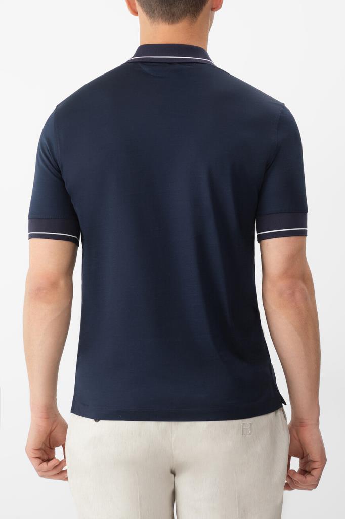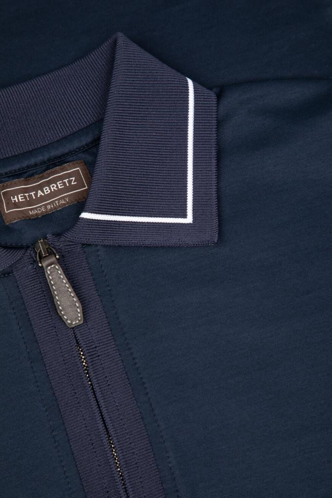 Полуприлегающее поло Hettabretz на серебристой застёжке-молнии сверху. Изделие выполнено из мягкого хлопкового трикотажа тёмно-синего цвета лицевой гладью. Отложной воротник и манжеты коротких рукавов украшают белые полосы-декор, а нижняя часть повседневной модели оснащена неглубокими боковыми разрезами.