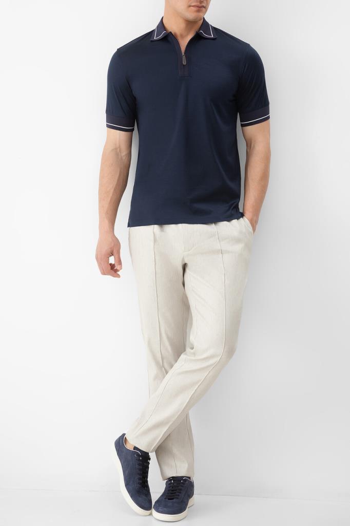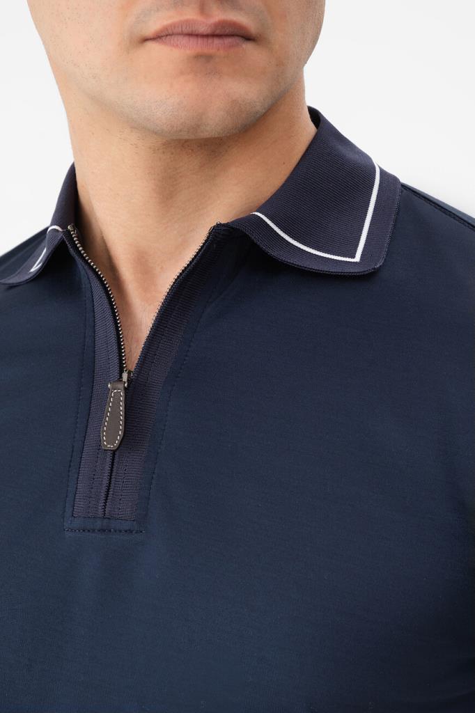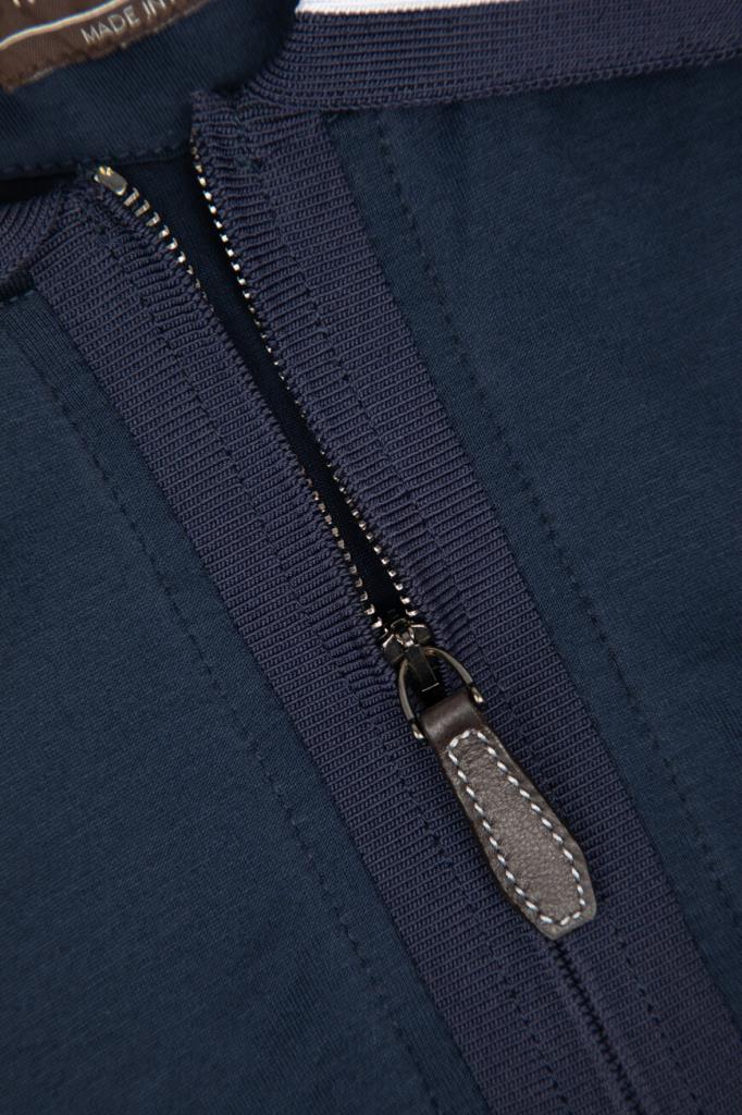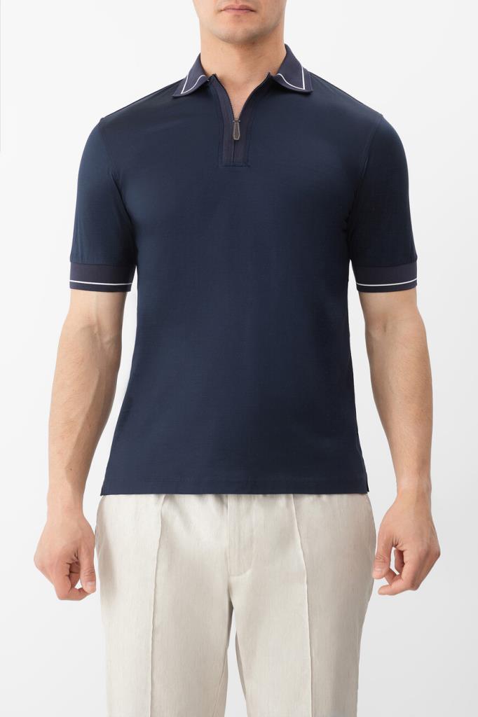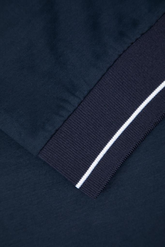 Полуприлегающее поло Hettabretz на серебристой застёжке-молнии сверху. Изделие выполнено из мягкого хлопкового трикотажа тёмно-синего цвета лицевой гладью. Отложной воротник и манжеты коротких рукавов украшают белые полосы-декор, а нижняя часть повседневной модели оснащена неглубокими боковыми разрезами.