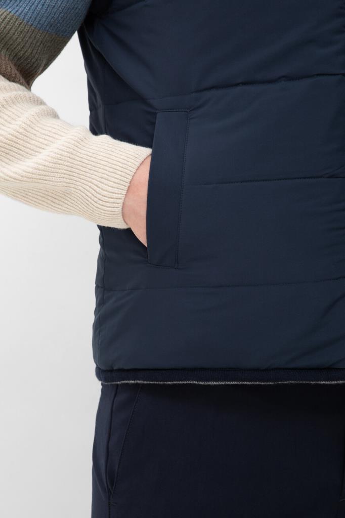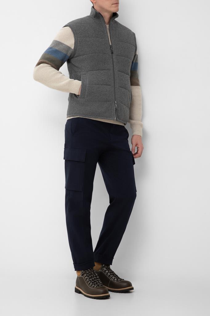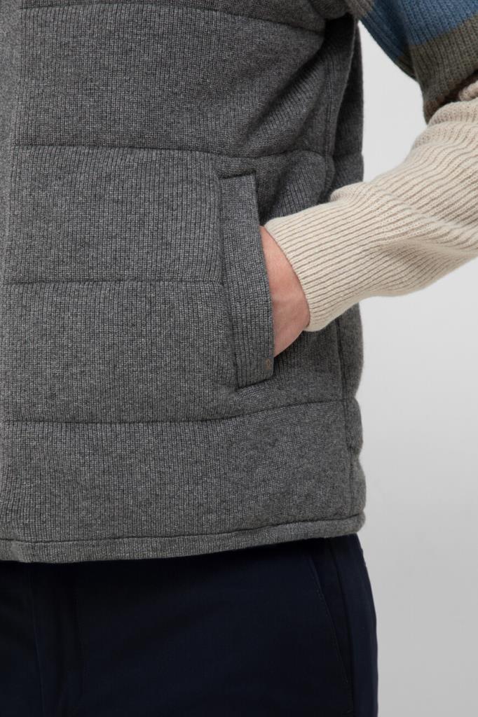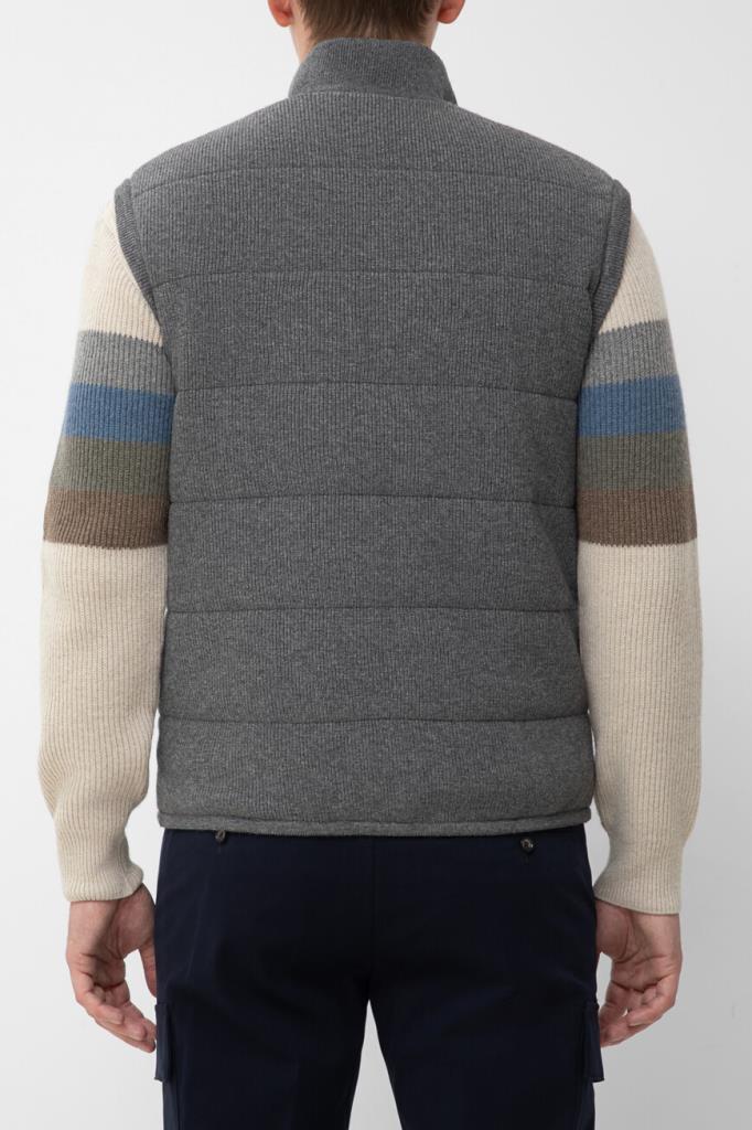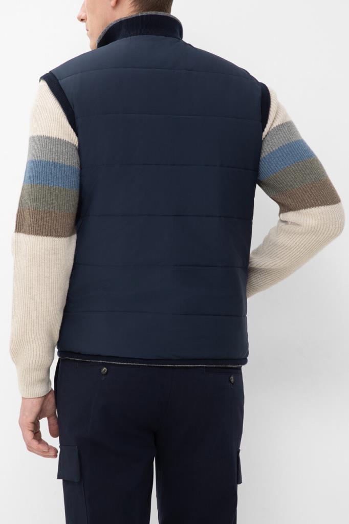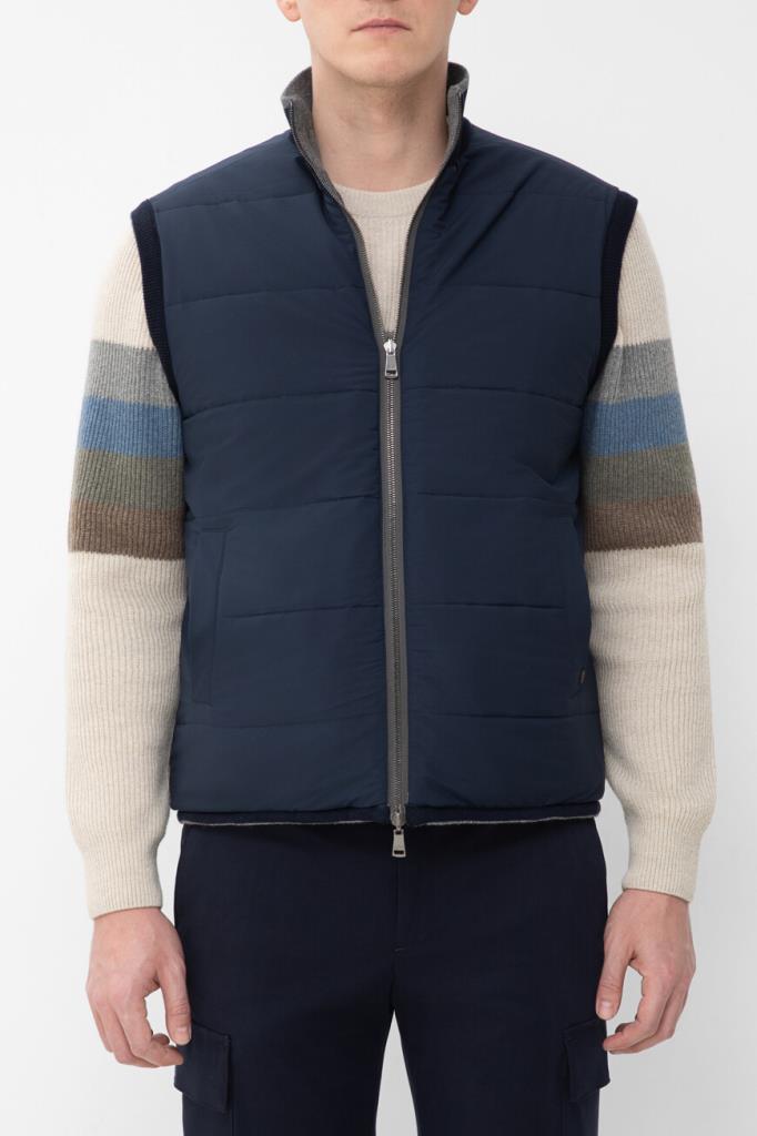 Двусторонний жилет с воротником-стойкой от бренда Paul&Shark. Одна сторона изделия выполнена из мягкого трикотажа на основе шерсти virgin, кашемира и вискозного волокна серого цвета английской резинкой, а другая сторона изготовлена из прочного тёмно-синего полиэфира - ткани Typhoon Platinum, инновации, запатентованной Домом, которая заключается в наличии ультратонкой мембраны, создающей барьер для внешней влаги и сильного ветра. Модель отличается горизонтальной стёжкой и застёжкой на молнию с двумя брендированными пуллерами.