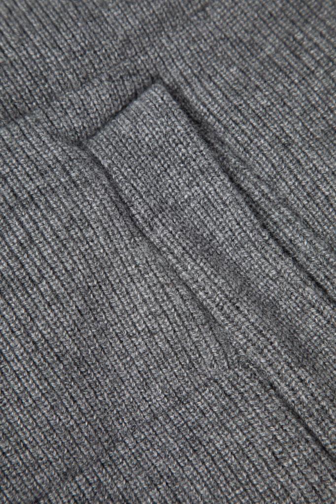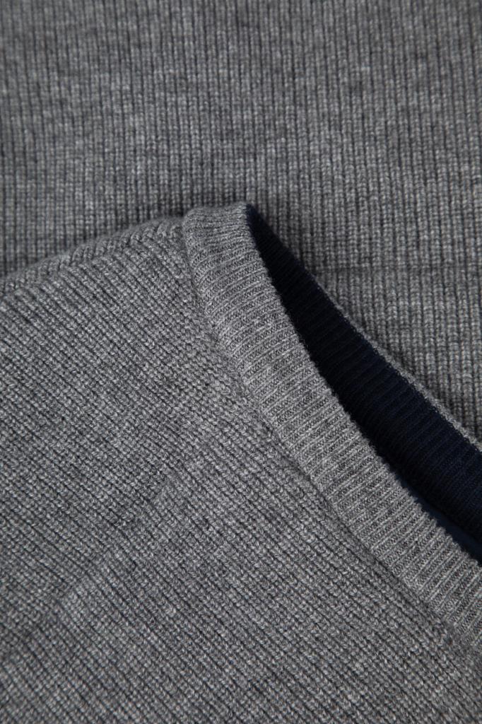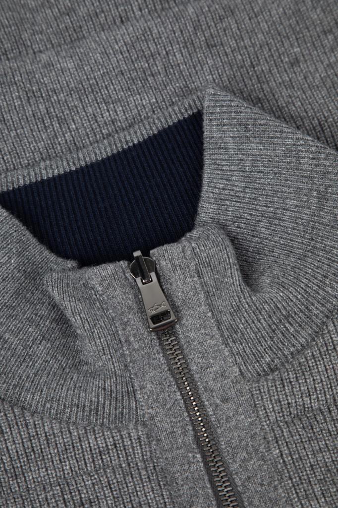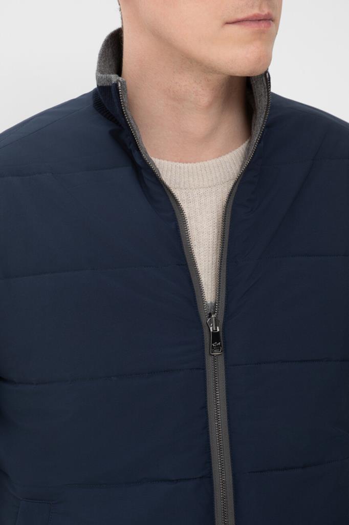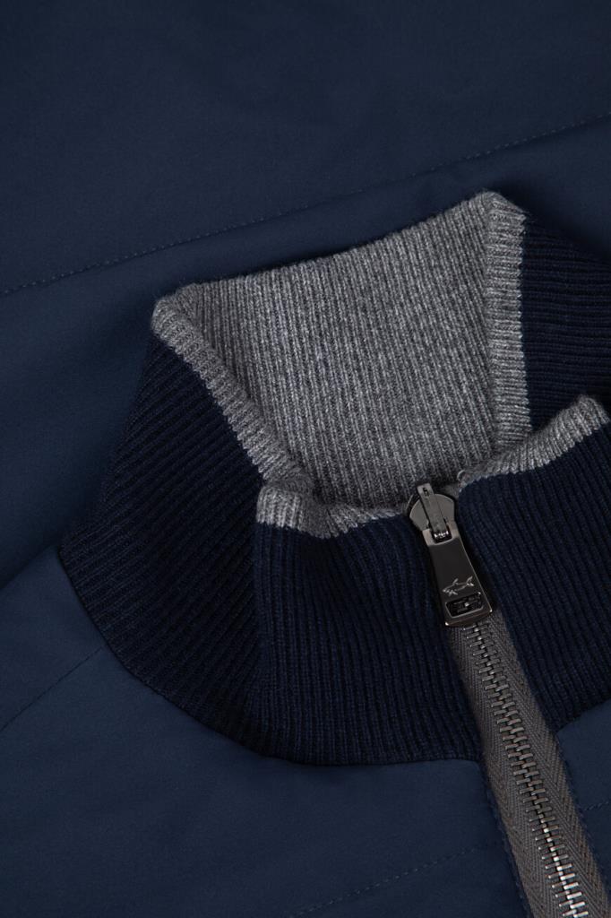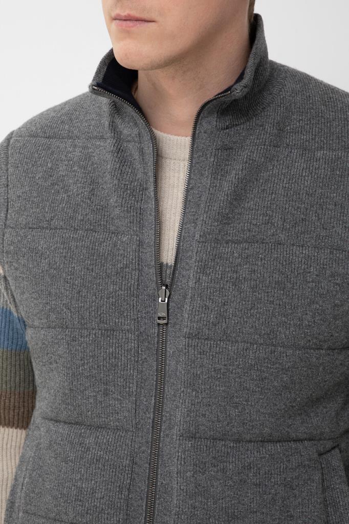 Двусторонний жилет с воротником-стойкой от бренда Paul&Shark. Одна сторона изделия выполнена из мягкого трикотажа на основе шерсти virgin, кашемира и вискозного волокна серого цвета английской резинкой, а другая сторона изготовлена из прочного тёмно-синего полиэфира - ткани Typhoon Platinum, инновации, запатентованной Домом, которая заключается в наличии ультратонкой мембраны, создающей барьер для внешней влаги и сильного ветра. Модель отличается горизонтальной стёжкой и застёжкой на молнию с двумя брендированными пуллерами.