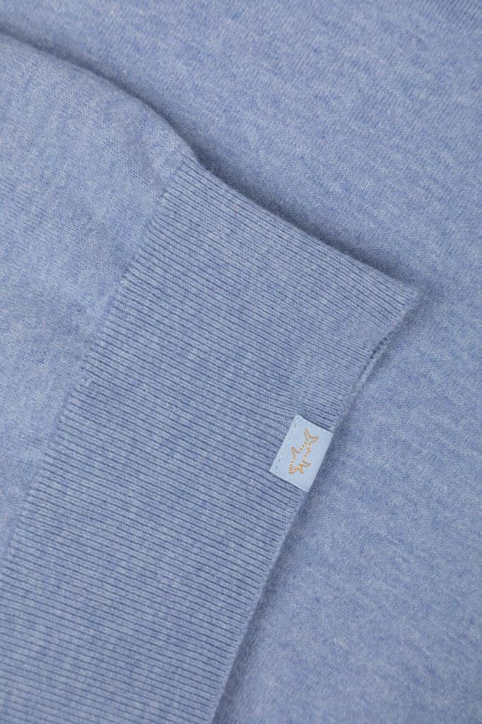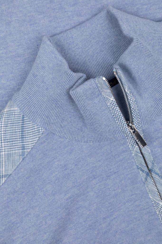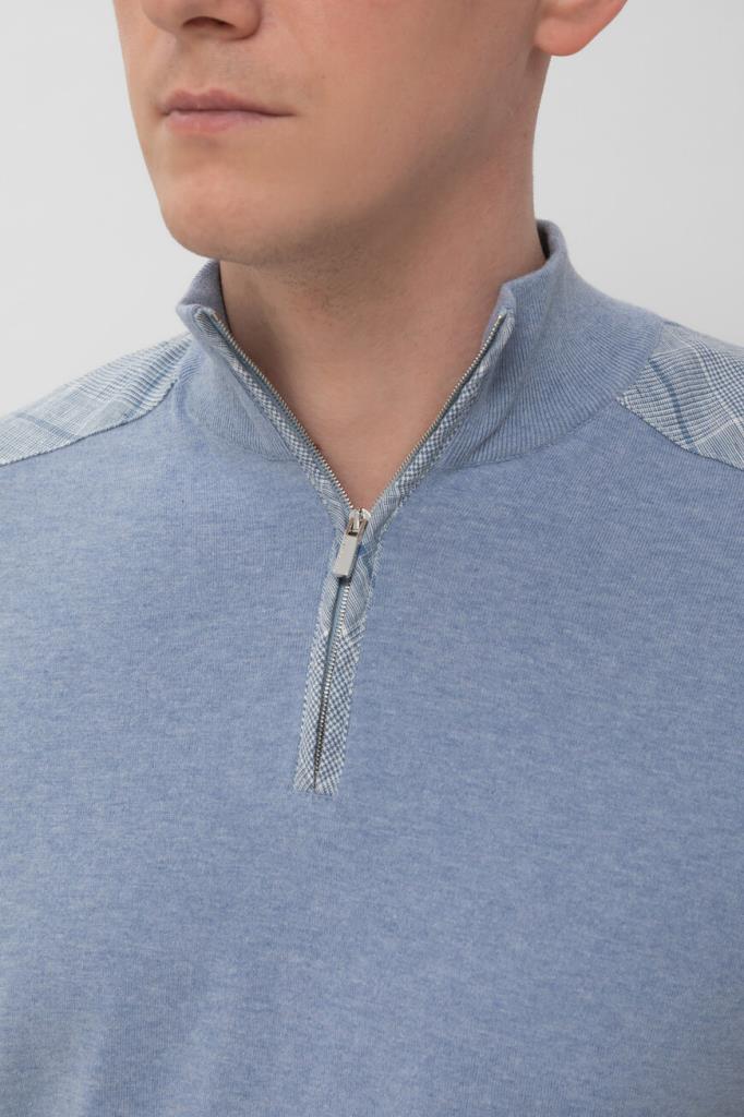 Прямой свитер на короткой молнии сверху от бренда Paul&Shark. Для изготовления модели голубого оттенка выбран мягкий хлопковый трикотаж, связанный лицевой гладью. Плечи и планка застёжки декорированы клетчатыми вставками из льна, а низ изделия украшен деталью с миниатюрным изображением акулы.