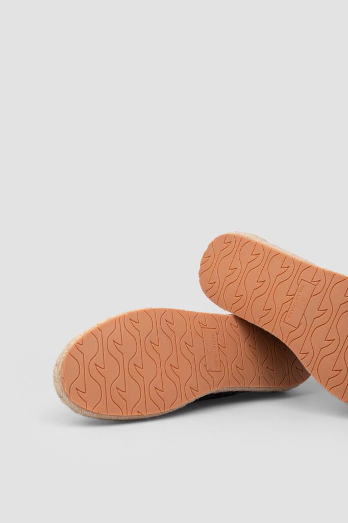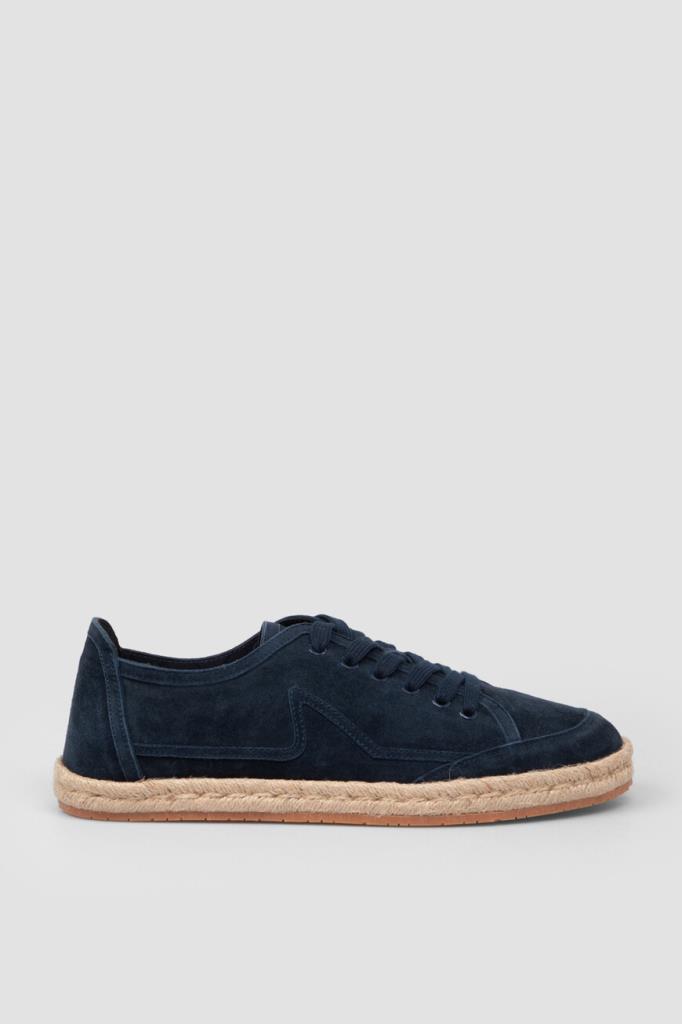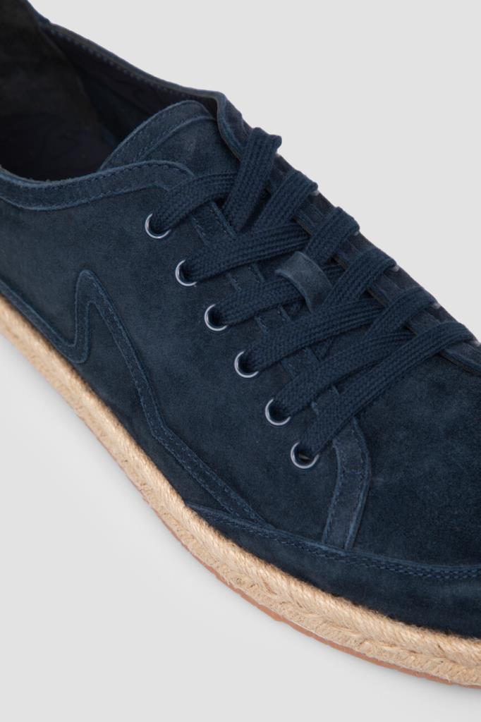 Эспадрильи Paul&Shark из коллекции Riviera Hello Capri. Для производства удобной пары используется мягкая замша тёмно-синего цвета с бархатистой поверхностью. По бокам размещены крупные культовые силуэты острых плавников акул, выполненные в технике интарсия, а стельки также украшены брендированным геометрическим мотивом. Надёжную фиксацию модели на ноге обеспечивает открытая перекрёстная шнуровка с люверсами в тон.