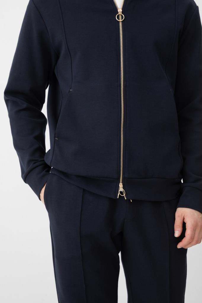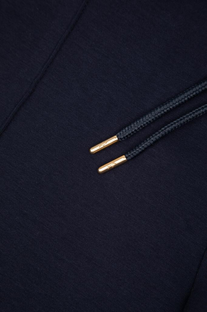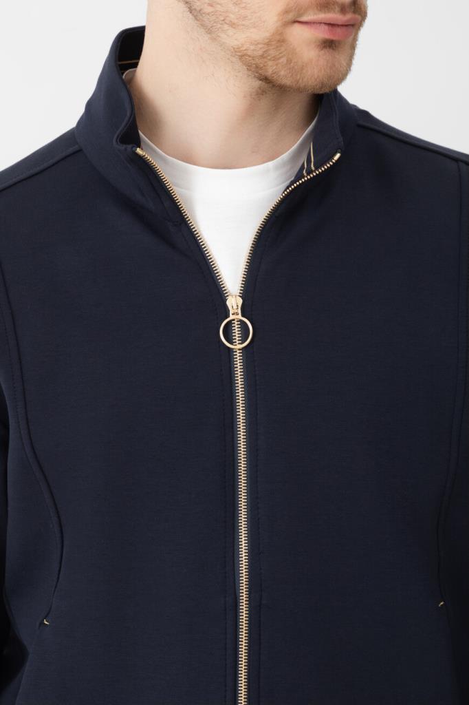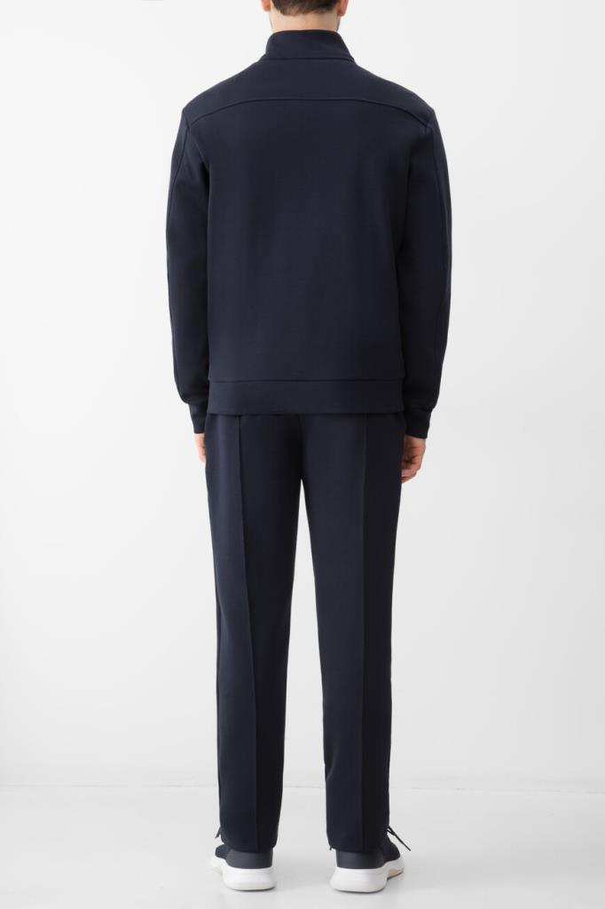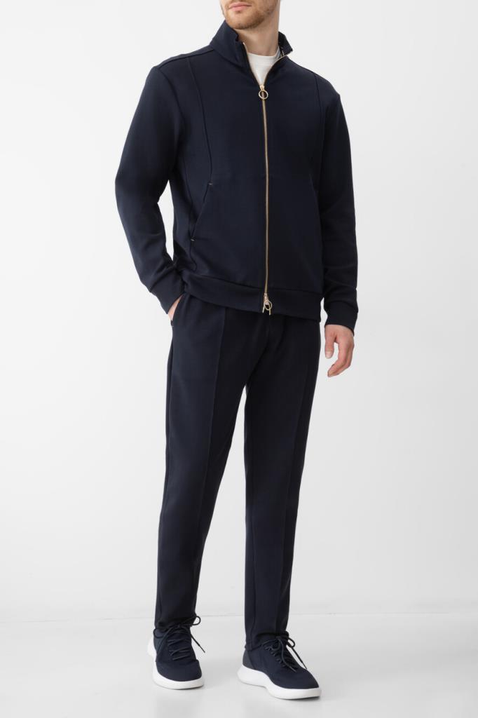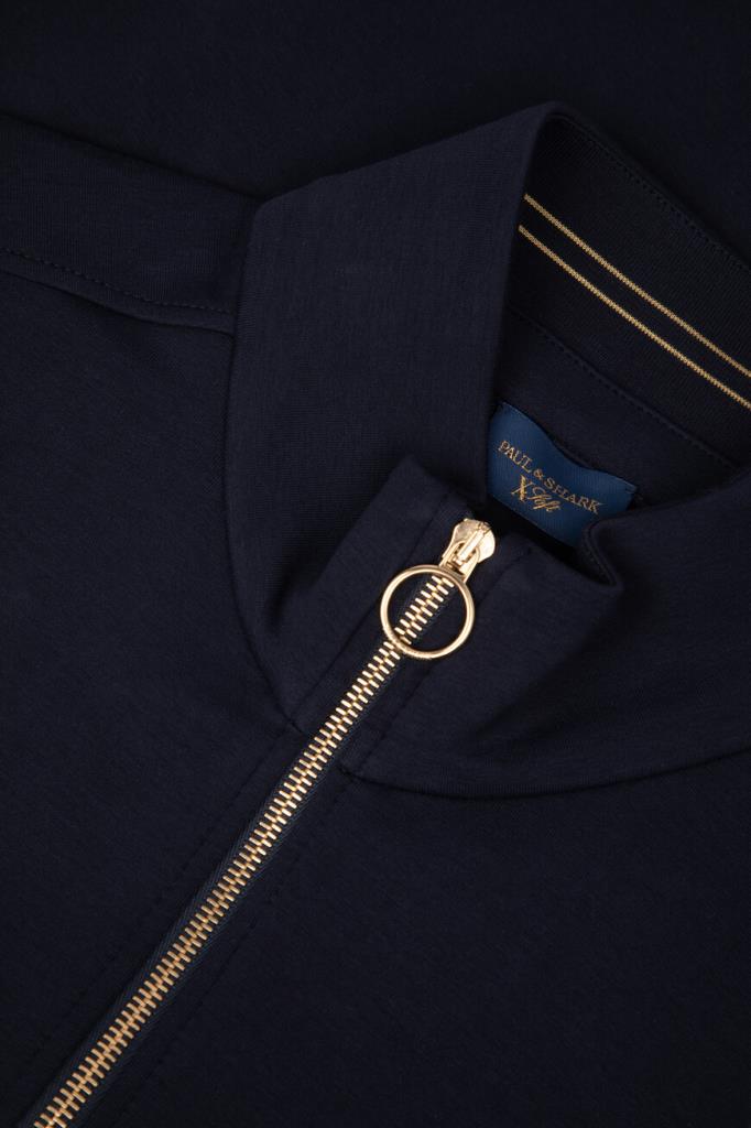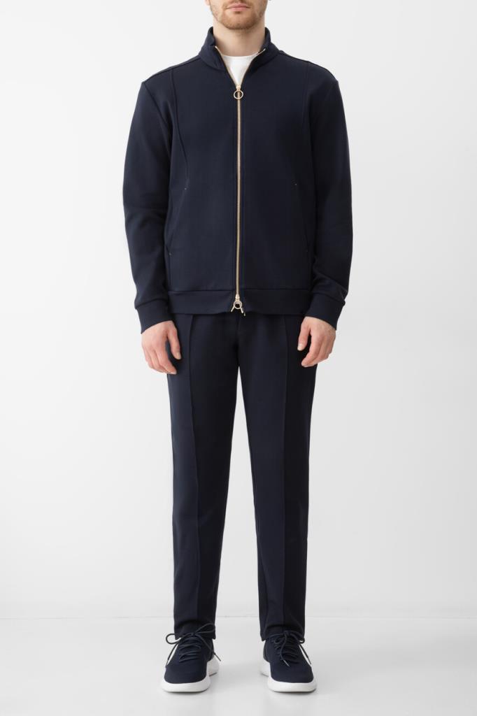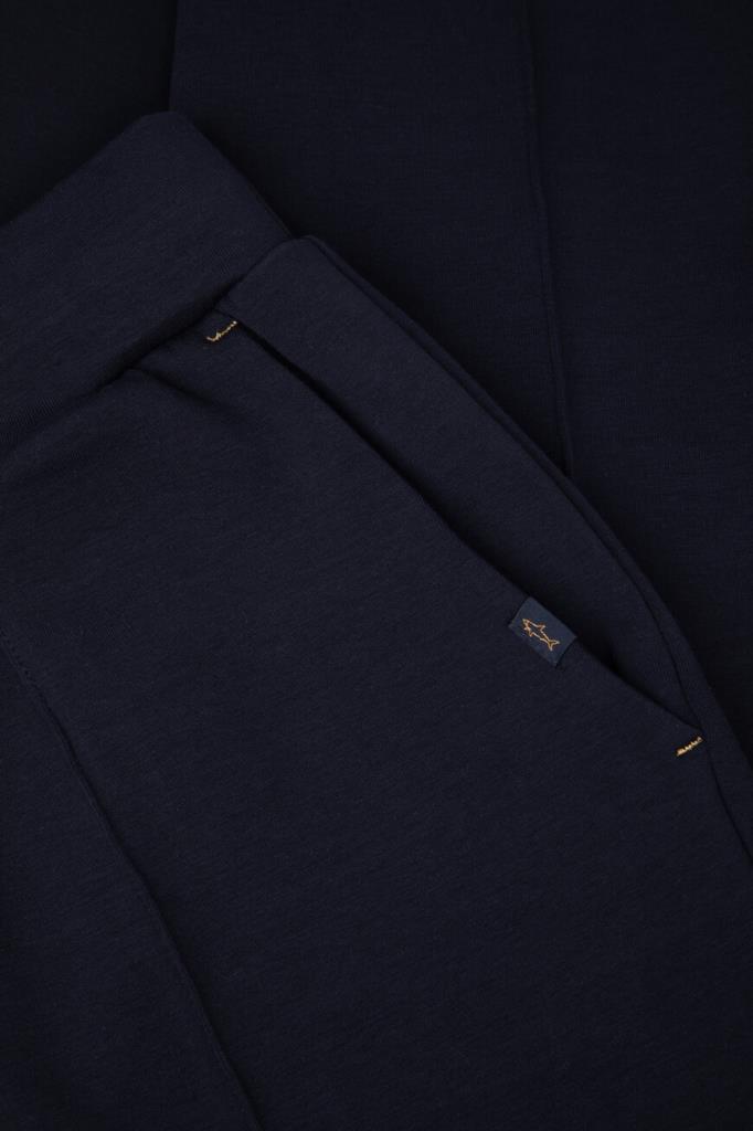 Трикотажный спортивный костюм от бренда Paul&Shark. Для пошива олимпийки на встречной молнии светло-золотого оттенка и брюк с очерченными стрелками используются хлопок и прочный нейлон тёмно-синего цвета с эксклюзивной мягкой обработкой X-Soft. Принадлежность комплекта Дому деликатно обозначена вставкой с силуэтом культовой акулы, размещённой на левом переднем кармане брюк.