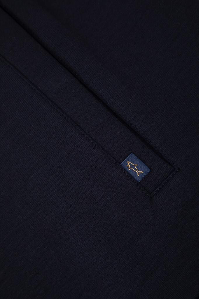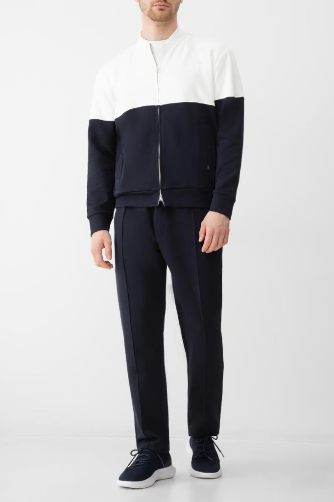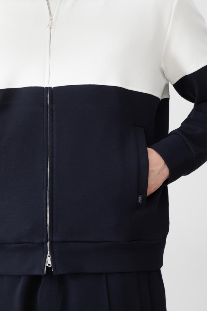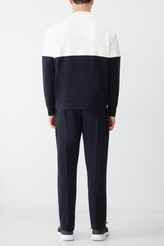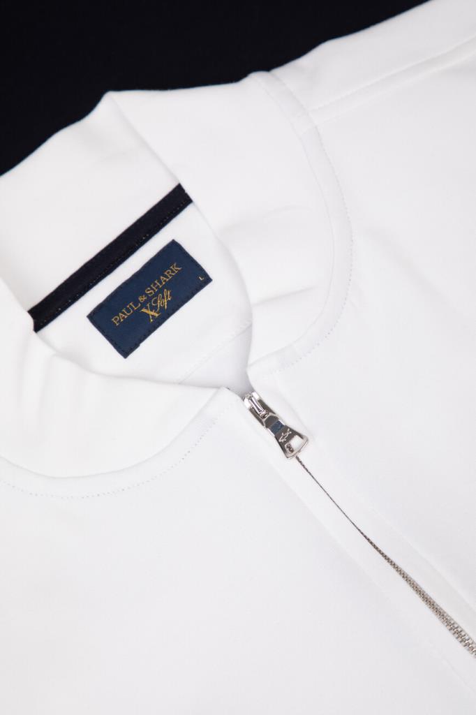 Спортивный костюм Paul&Shark в белом и тёмно-синем тонах. Для производства комплекта из двухцветной олимпийки с невысоким воротником-стойкой в стиле бомбера и брюк с очерченными стрелками используется эластичный трикотаж на основе хлопка и прочного нейлона с эксклюзивной мягкой обработкой X-Soft. На принадлежность изделий Дому указывают вставка с культовой акулой на левом кармане толстовки и вышитый силуэт острого плавника акулы на кармане брюк.