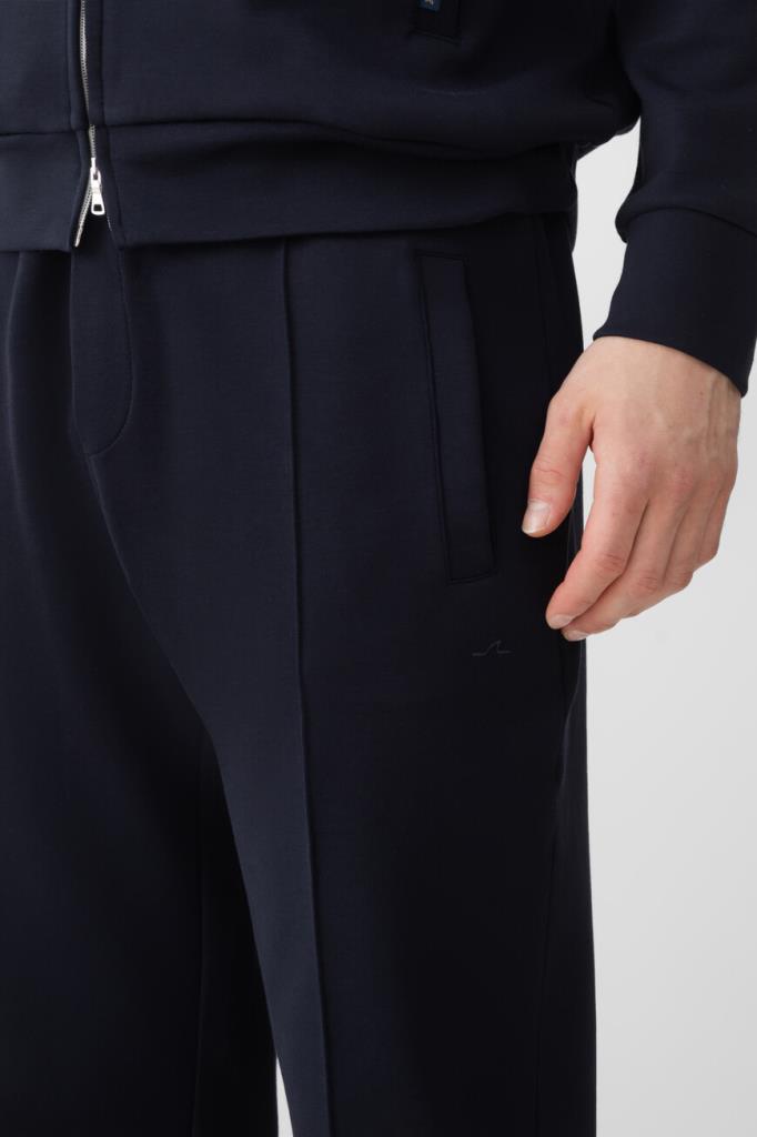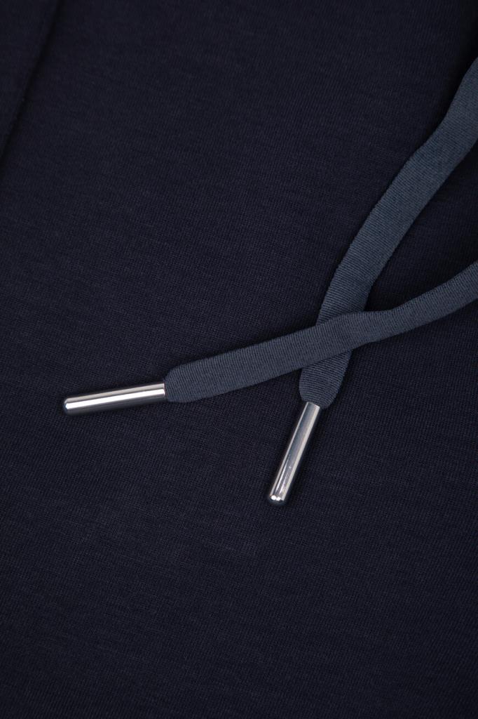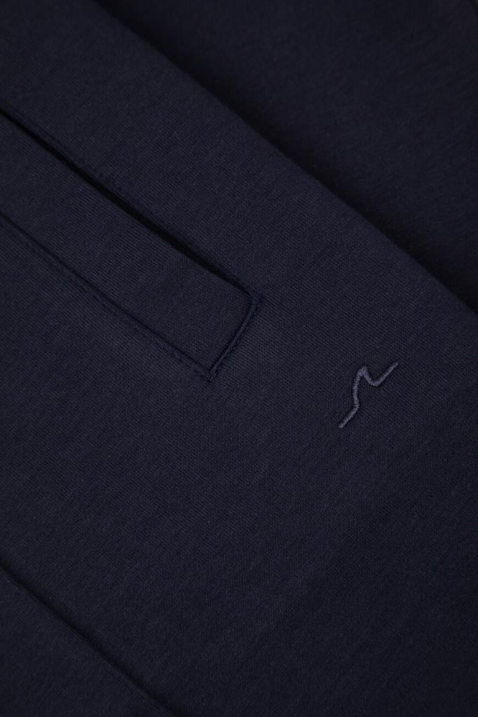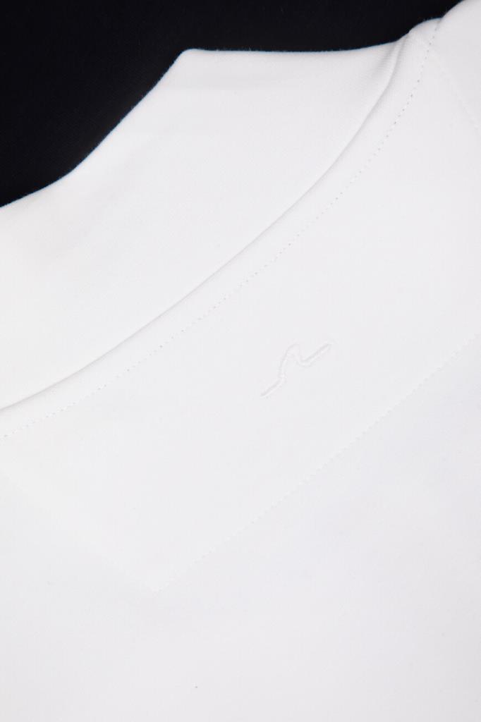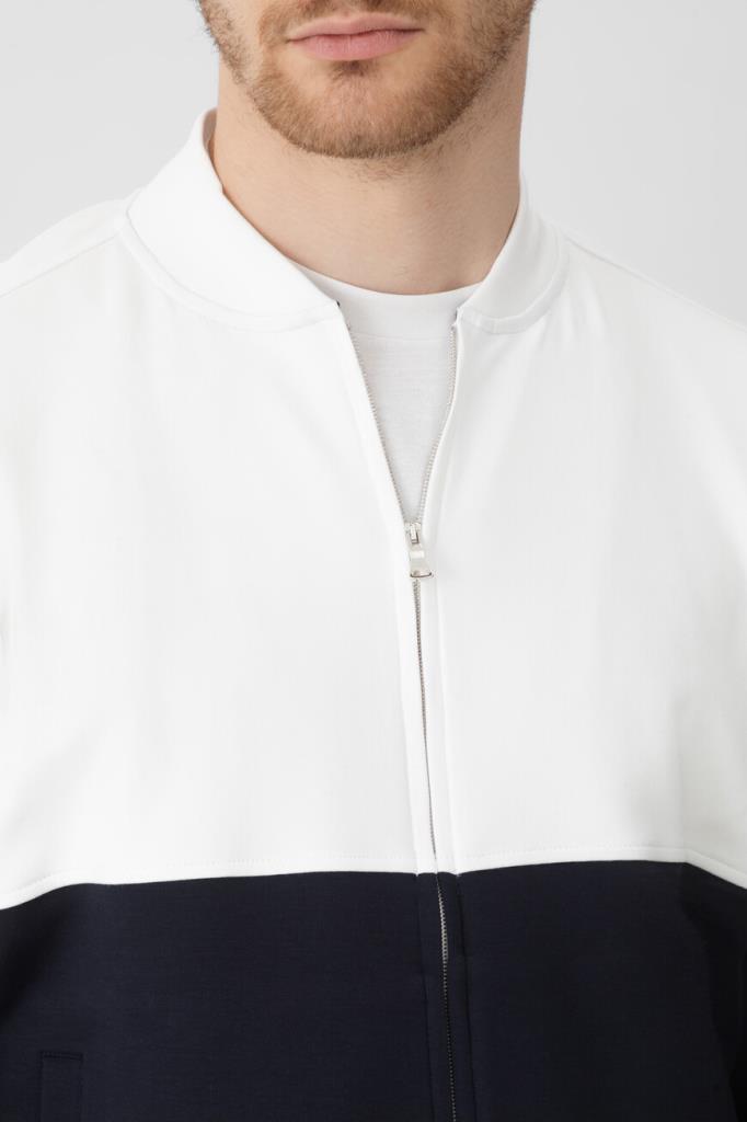 Спортивный костюм Paul&Shark в белом и тёмно-синем тонах. Для производства комплекта из двухцветной олимпийки с невысоким воротником-стойкой в стиле бомбера и брюк с очерченными стрелками используется эластичный трикотаж на основе хлопка и прочного нейлона с эксклюзивной мягкой обработкой X-Soft. На принадлежность изделий Дому указывают вставка с культовой акулой на левом кармане толстовки и вышитый силуэт острого плавника акулы на кармане брюк.