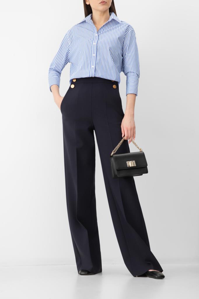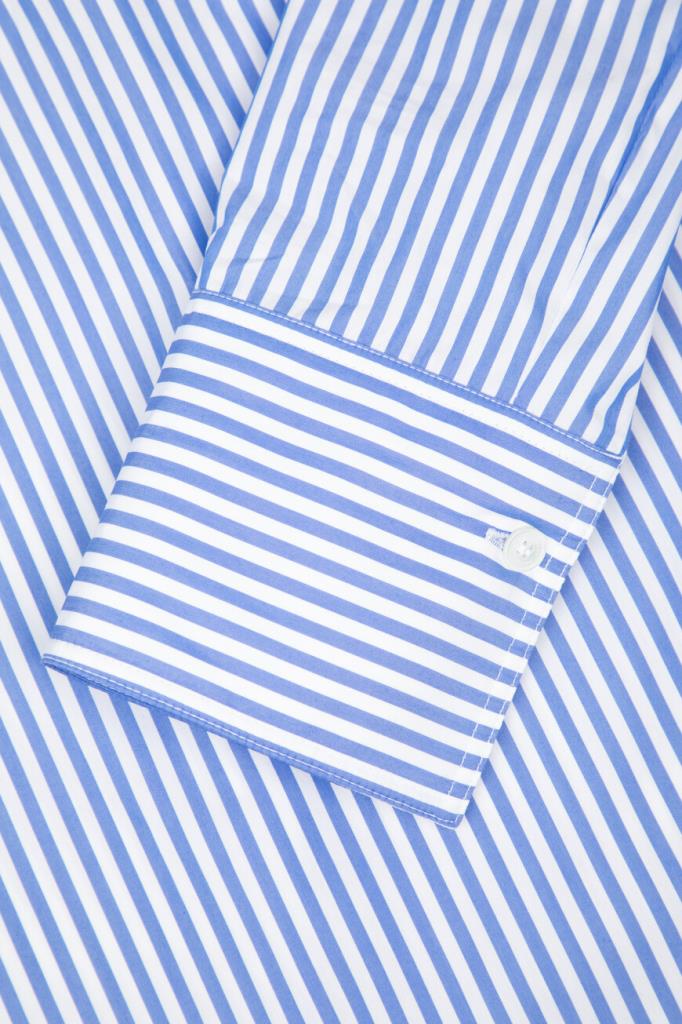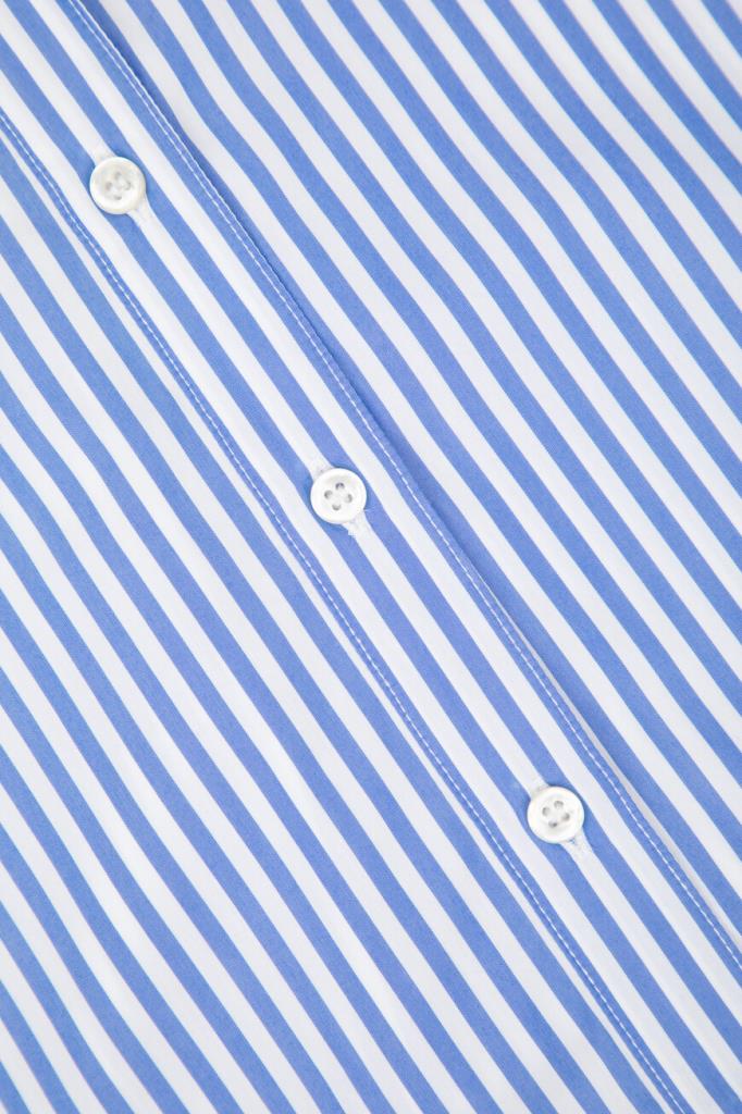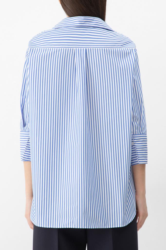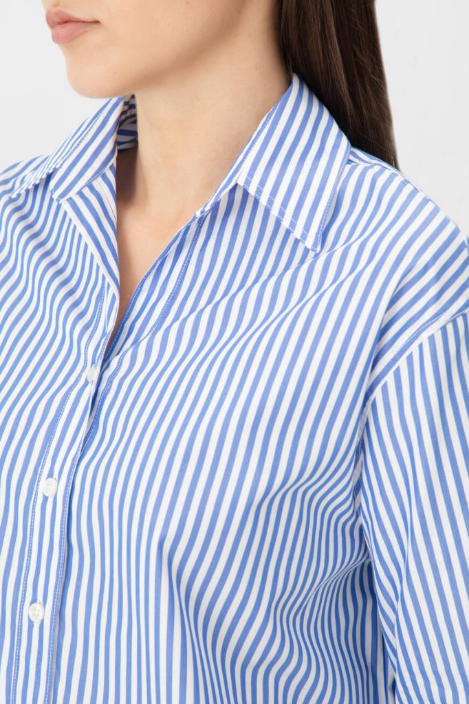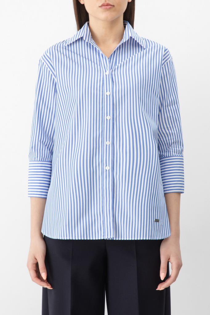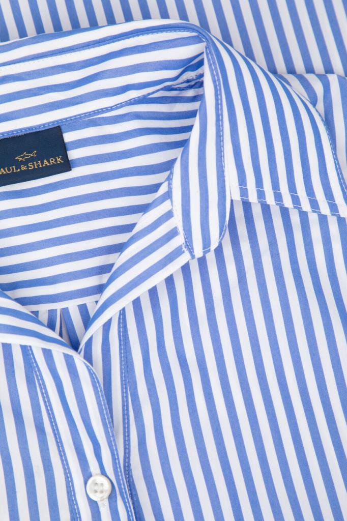 Полосатая рубашка Paul&Shark с укороченными рукавами. Для пошива изделия прямого силуэта выбран мягкий хлопковый трикотаж в белом и синем тонах. Отличительными деталями являются гавайский воротник, классические складки на спинке и серебристый прямоугольный лейбл с гравировкой спереди в нижней части.