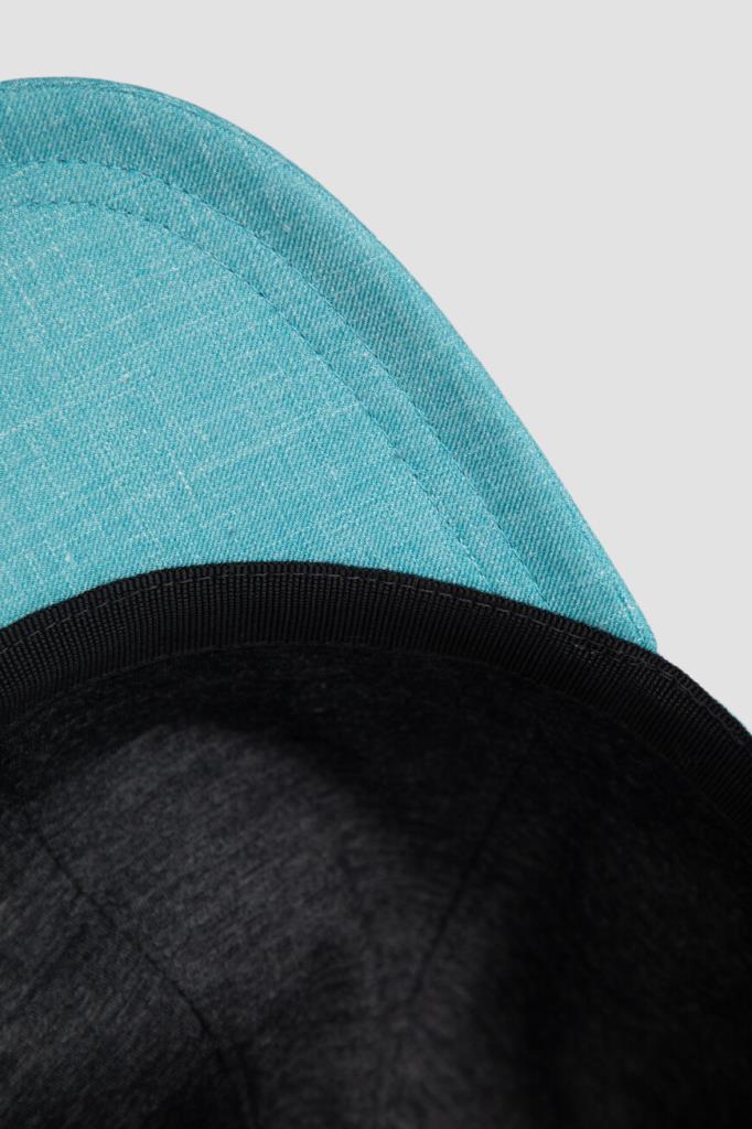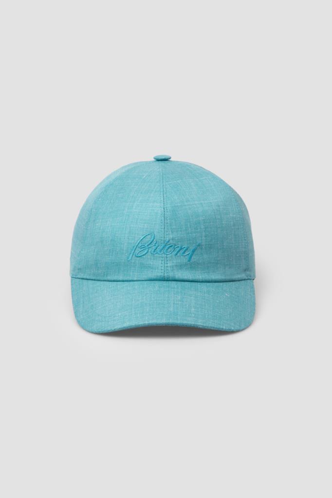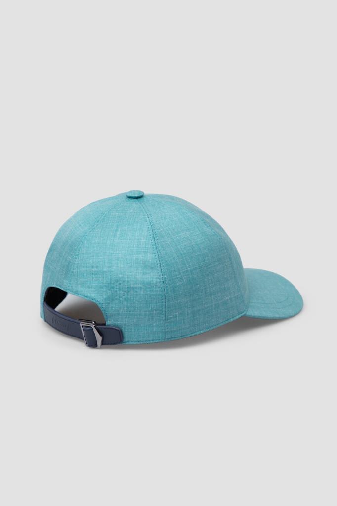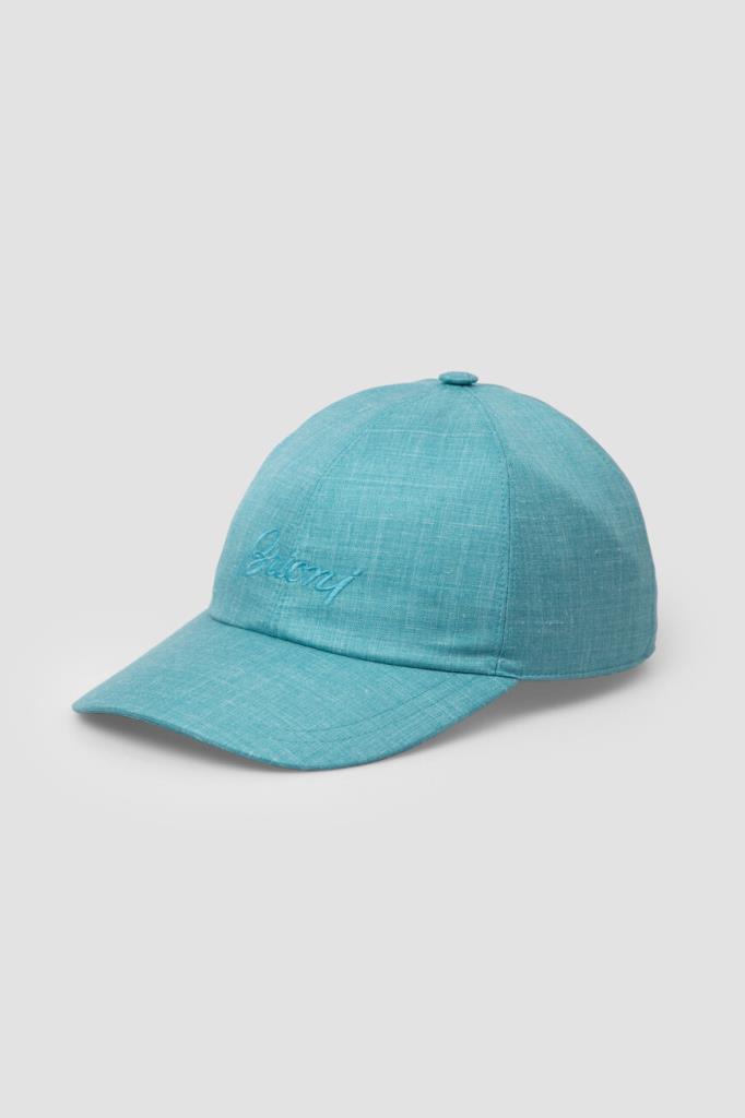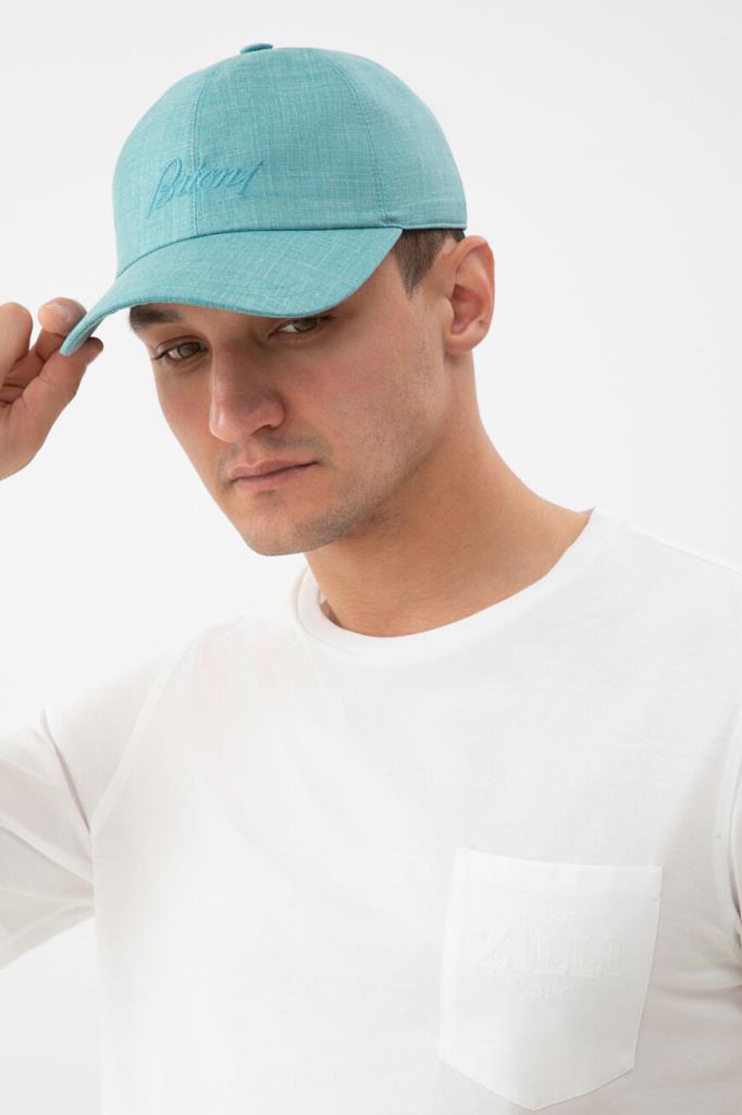 Трикотажная бейсболка Brioni с широким изогнутым козырьком. Для производства аксессуара выбраны гладкий шёлк, кашемир и лён бирюзового оттенка. Отличительными деталями являются крупная тональная вышивка в виде логотипа Дома на тулье и наличие тёмно-синего брендированного ремешка из гладкой кожи ягнёнка с пряжкой в задней части. Модель прекрасно сочетается с классической футболкой и джинсами, позволяя создать образ в стиле «спортивный шик».