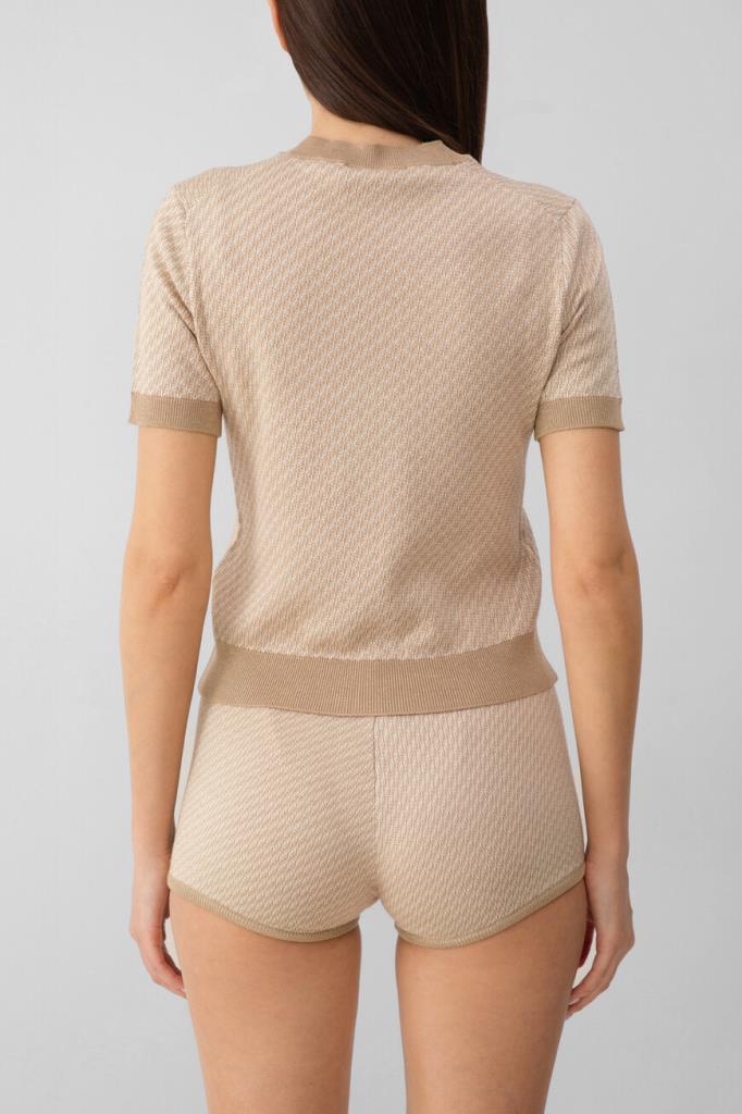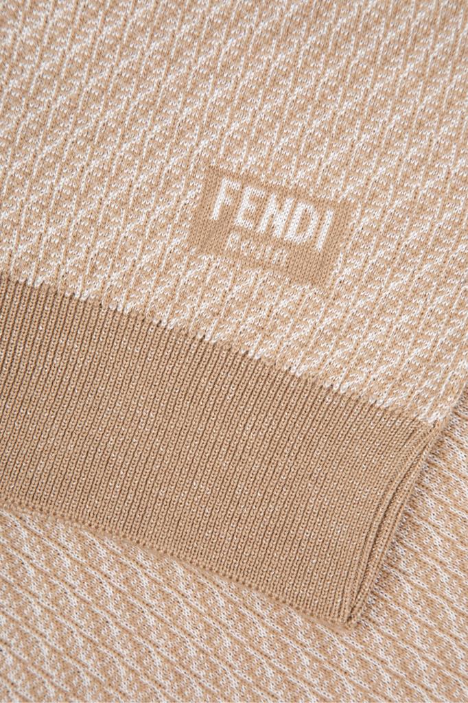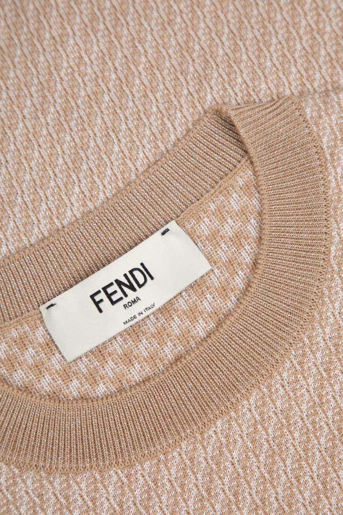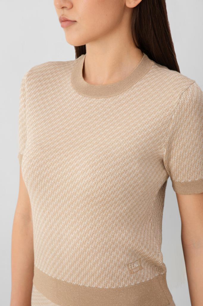 Свитер облегающего силуэта от бренда Fendi. Поверхность изделия из смеси мягкой шерсти, гладкого шёлка и прочного износостойкого нейлона покрыта жаккардовым микроузором «FF» светло-коричневого оттенка на белом фоне. Однотонные широкий пояс и манжеты рукавов выполнены с отделкой в наборную резинку для оптимальной посадки по фигуре. Образ можно завершить парными шортами с высокой линией талии из той же коллекции.