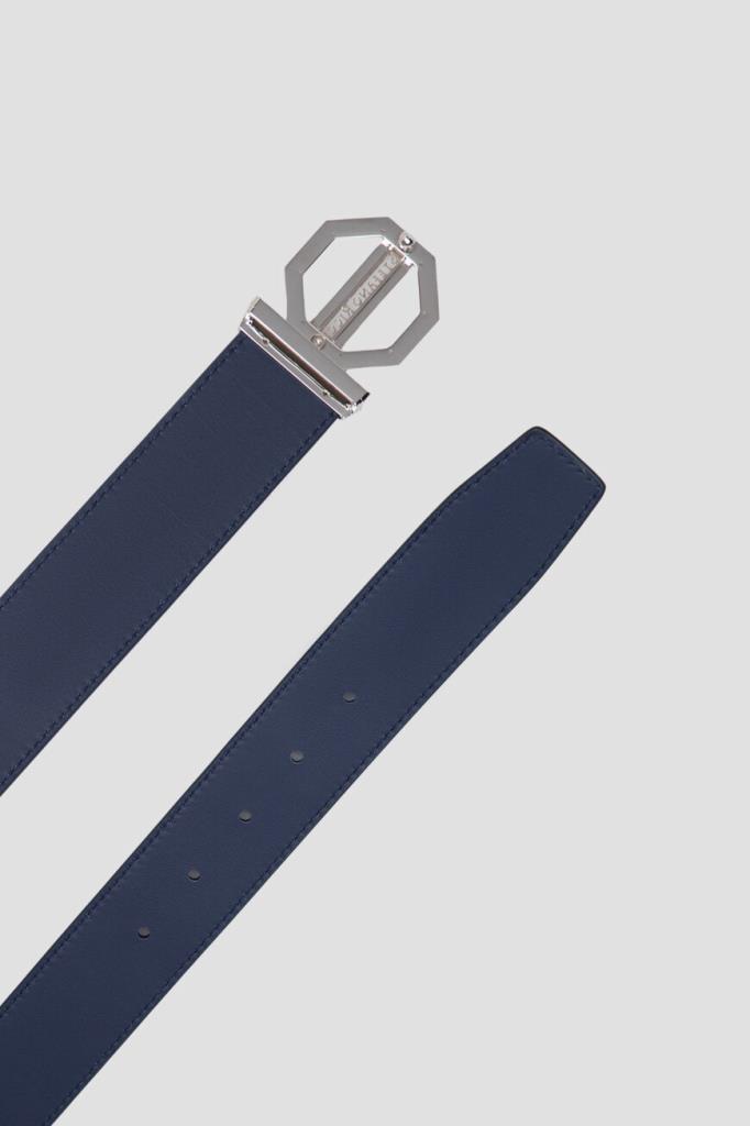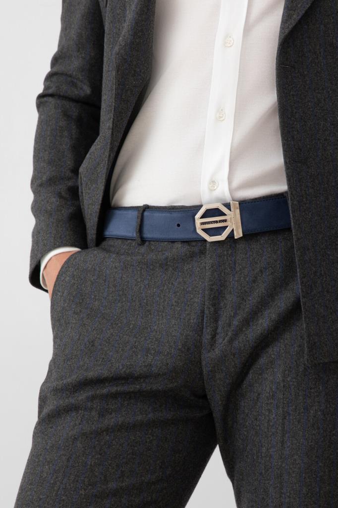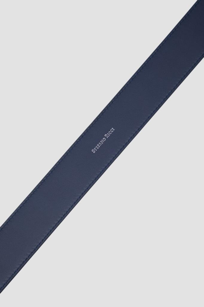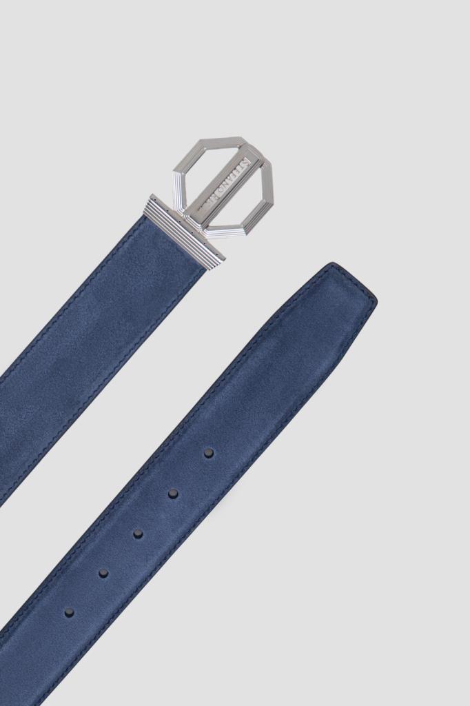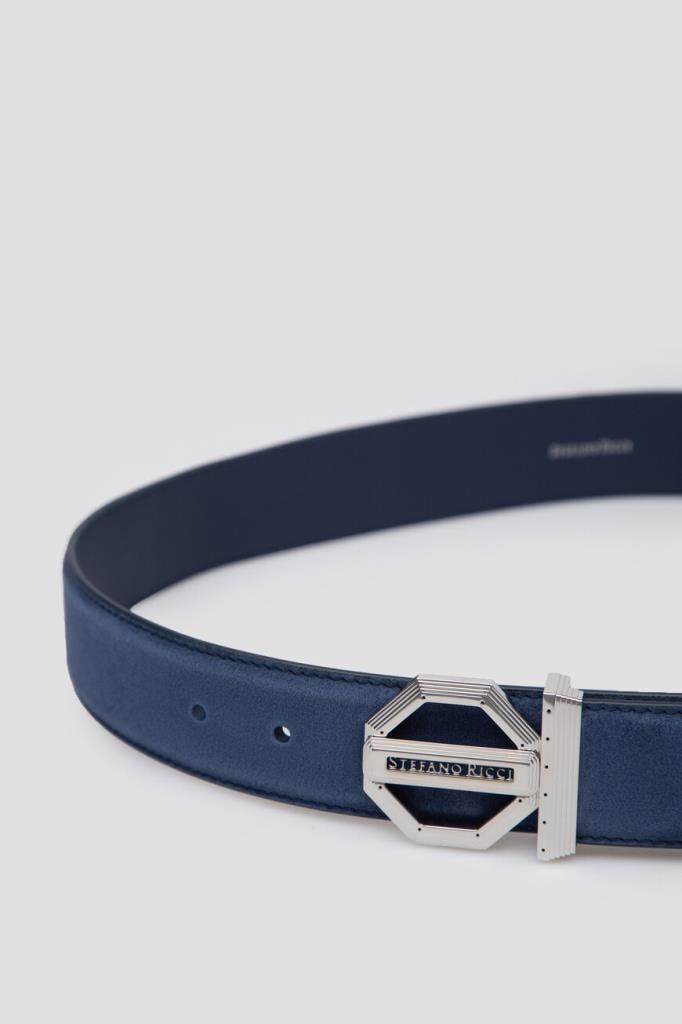 Синий ремень Stefano Ricci с чуть зауженным краем. Для изготовления аксессуара средней ширины используется плотная бархатистая замша. Комфортную регулировку модели по линии талии обеспечивает серебристая фигурная пряжка-восьмигранник с точечным чеканным узором, рельефным полосатым мотивом, фацетными краями и надписью-логотипом Дома в центре.
