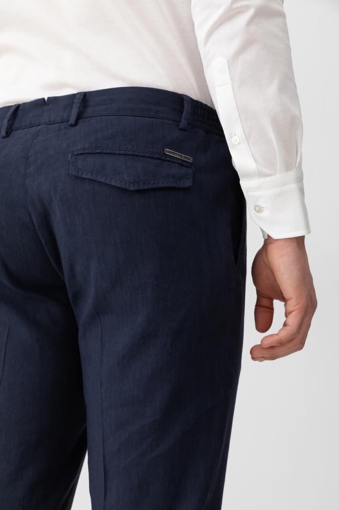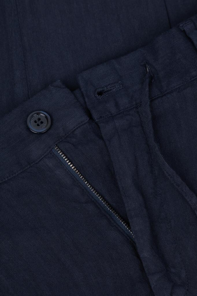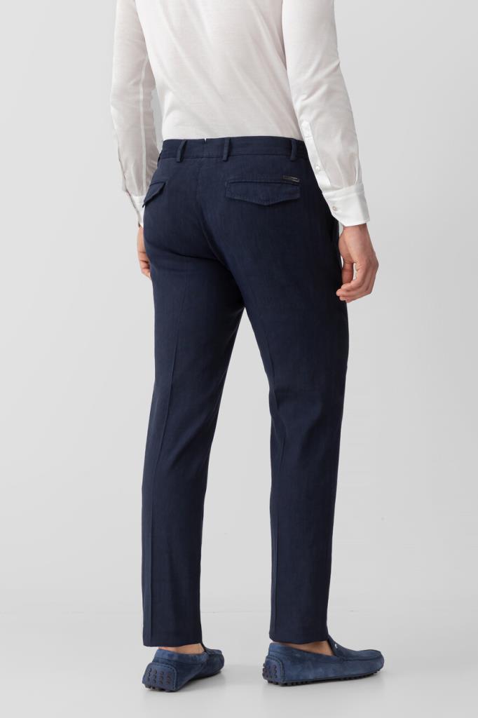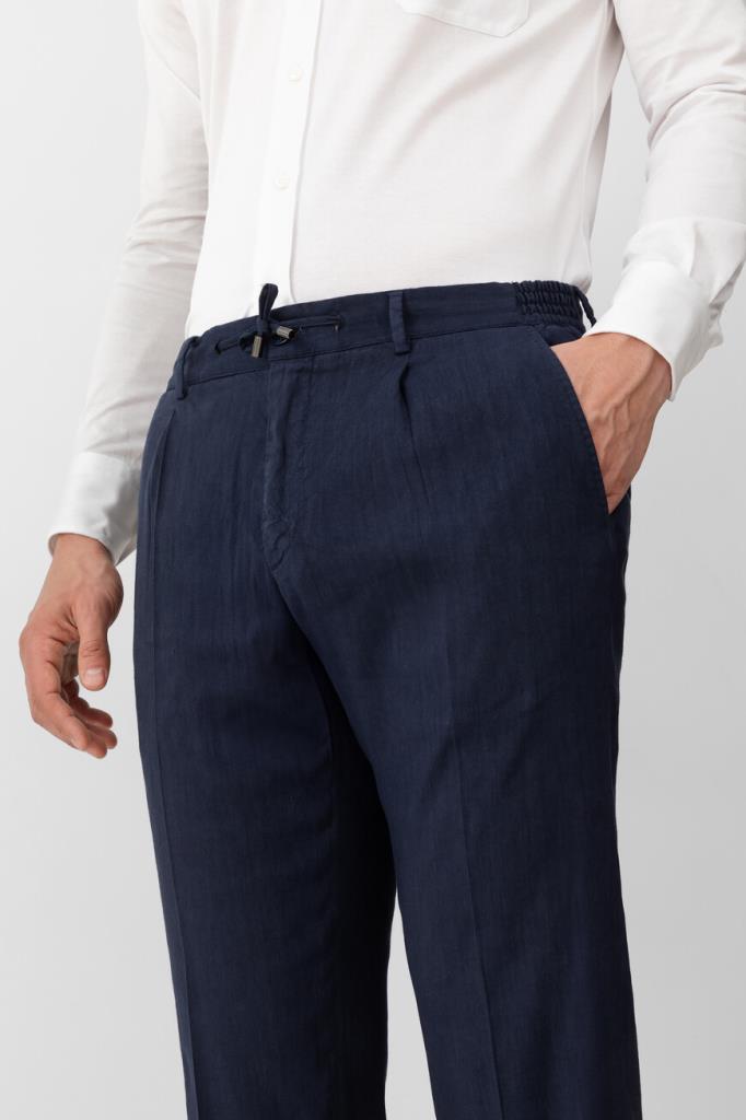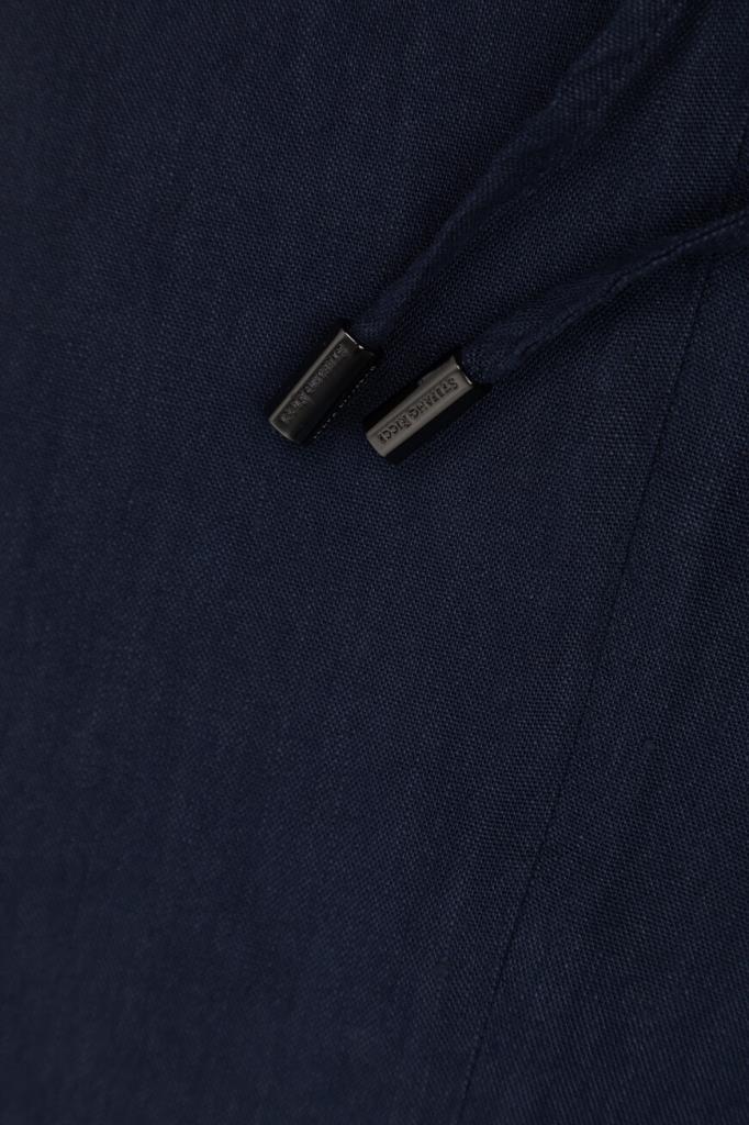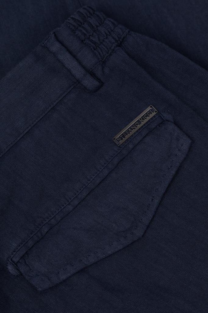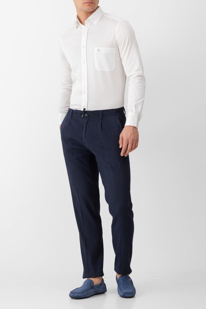 Прямые брюки Stefano Ricci с четырьмя прорезными карманами. Для производства изделия тёмно-синего цвета используется мягкий трикотаж на основе льна и прочного вискозного волокна с добавлением стрейчевых волокон. Фасон модели, сочетающей в себе элементы классического и спортивного стилей, предполагает наличие плотного пояса-кулиски со шлевками под ремень и эластичными боковыми вставками, стрелок и защипов сверху и застёжки на молнию, покрытую планкой, и крупную брендированную пуговицу.