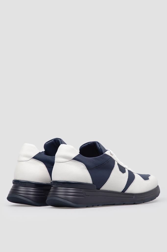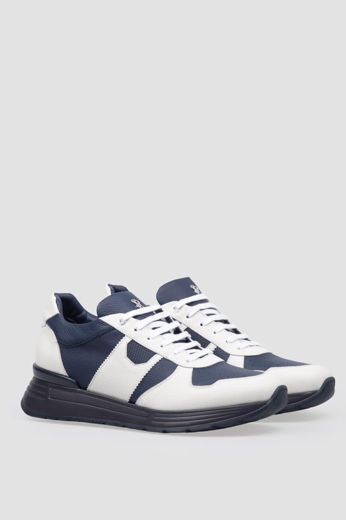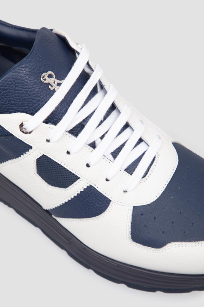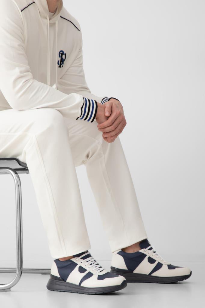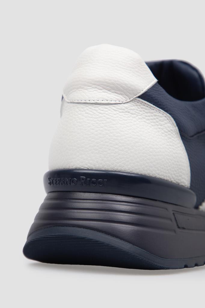 Динамичные сникеры Stefano Ricci станут фаворитом этого сезона. Удобная пара выполнена из зернистой матовой кожи телёнка белого и тёмно-синего оттенков. Конструкция изделия характеризуется широкой колодкой и наличием закрытого типа шнуровки, обеспечивающего надёжную фиксацию на ноге. Атрибутами Дома выступают декоративная фурнитура в виде лого-монограммы из металла с гальваническим покрытием спереди и рельефная надпись-логотип в задней части.