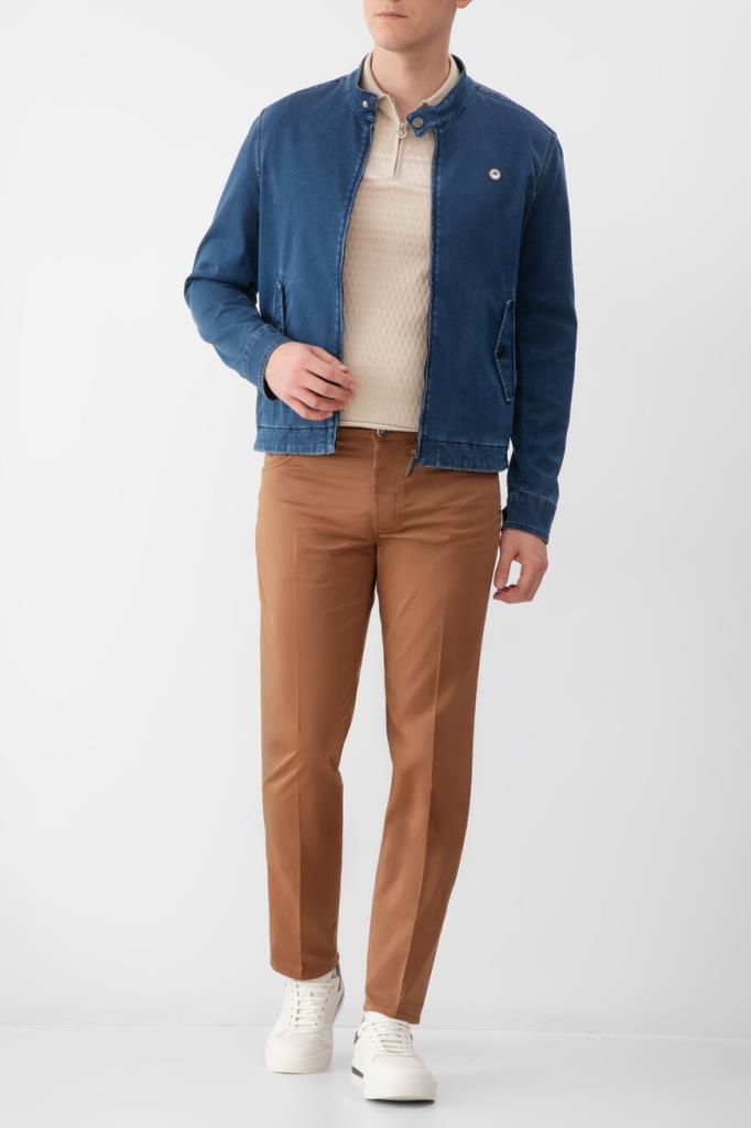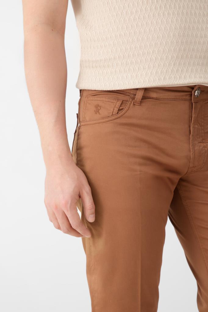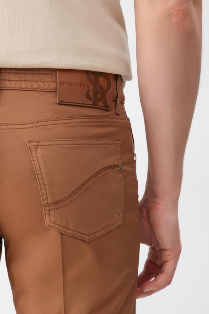 Хлопковые джинсы Stefano Ricci с добавлением стрейчевых волокон. Конструкция повседневной модели коричневого оттенка характеризуется зауженным силуэтом и высокой посадкой на талии. Изделие с классическими стрелками украшают прямоугольная кожаная накладка с тиснёными надписью-логотипом и монограммой бренда на поясе сзади, вышитый лого-монограмма на маленьком кармане спереди и дизайнерская строчка в тон на задних карманах.