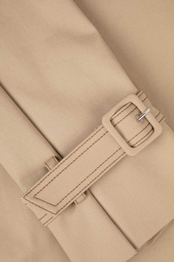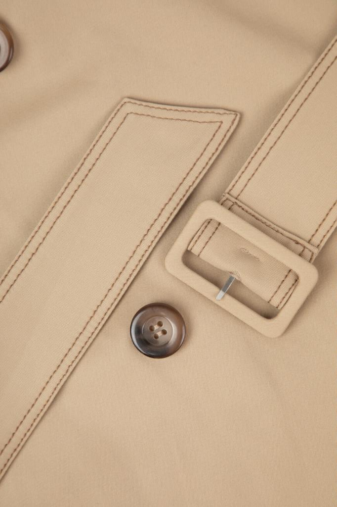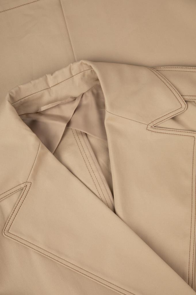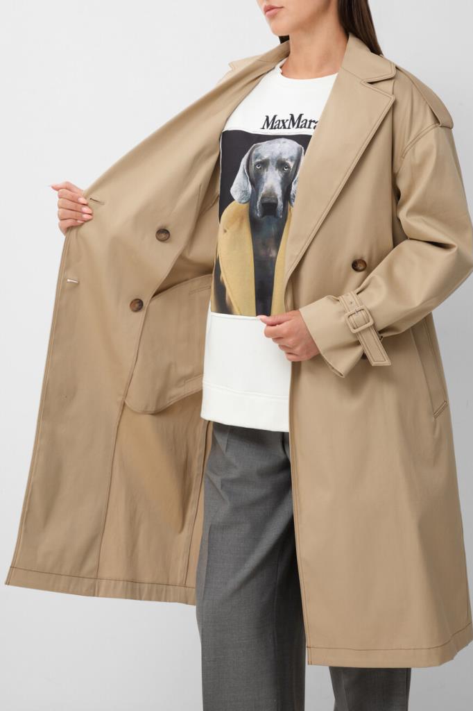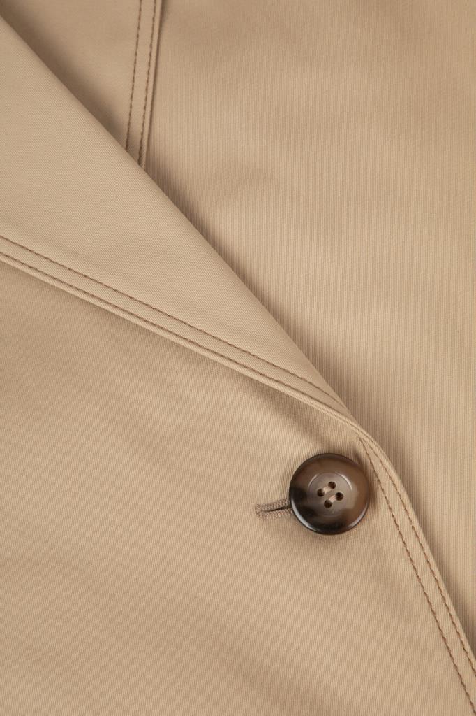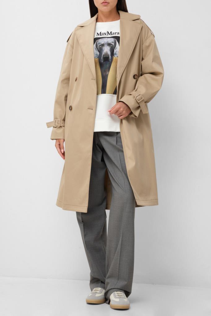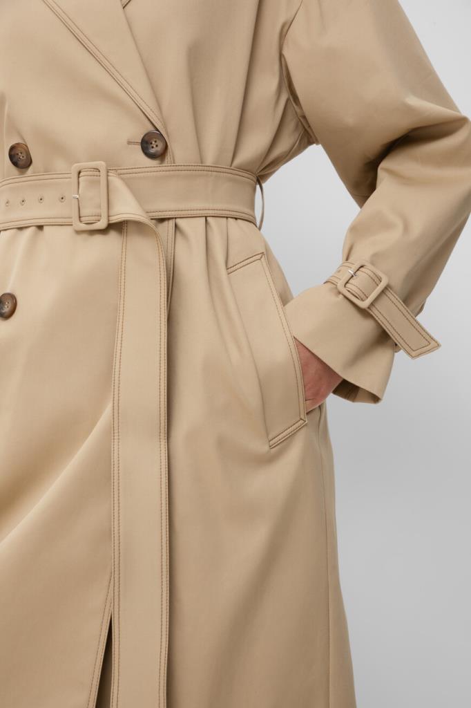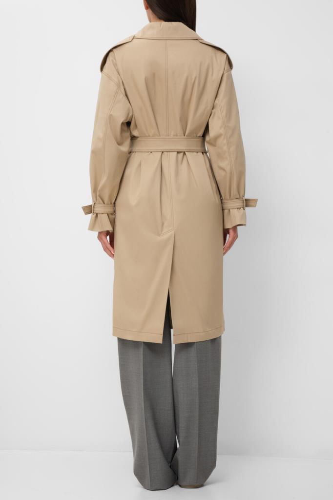 Прямой тренч-миди из линейки Max Mara Studio. Для изготовления двубортной модели бежевого оттенка используется водоотталкивающий хлопковый габардин с добавлением эластичных волокон. Изделие отличается наличием характерных для такого типа пальто деталей: погонами, ремешками с пряжками на манжетах, спущенной линией плеч и прорезными карманами по бокам. Широкий съёмный пояс с прямоугольной пряжкой подчёркивает силуэт, а в качестве минималистичного декора выступает прострочка на швах.