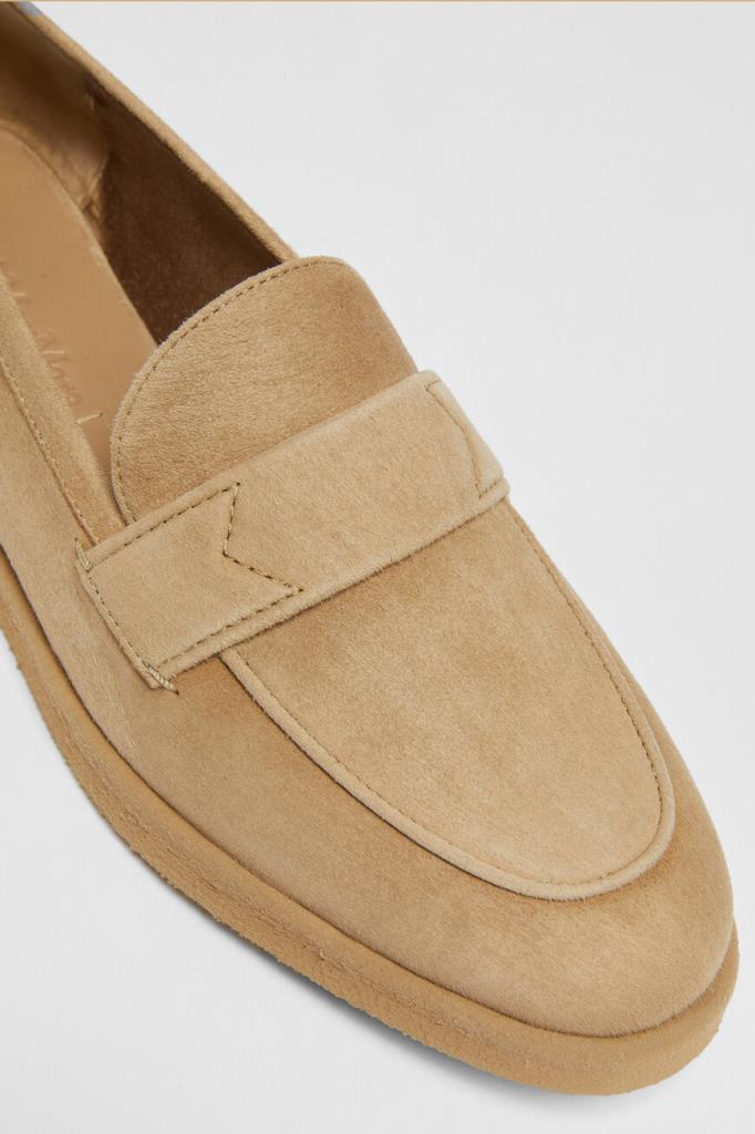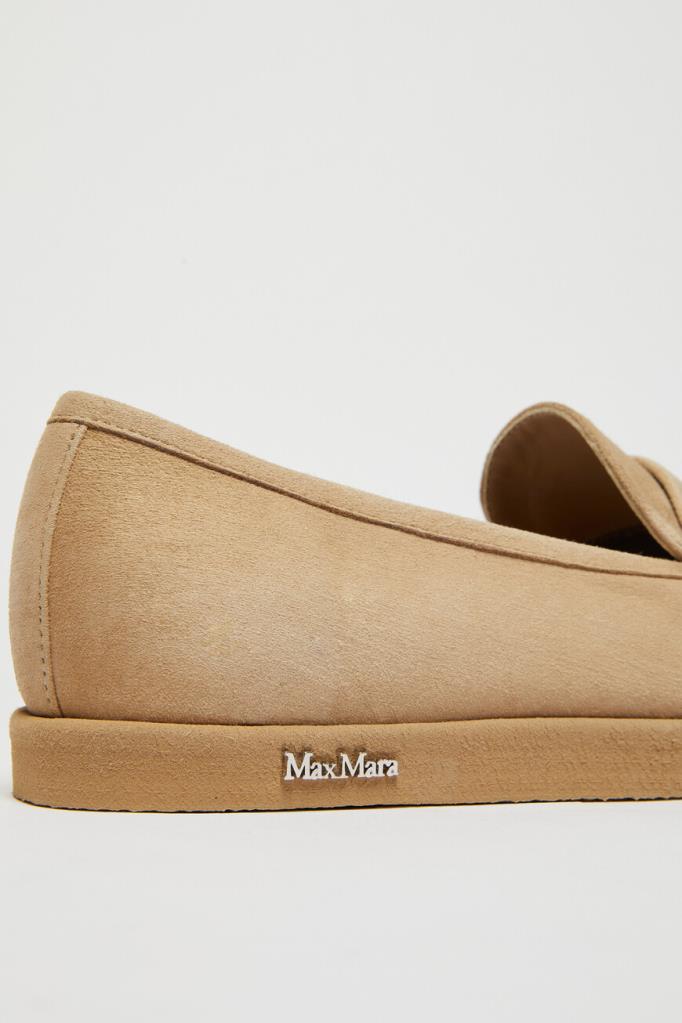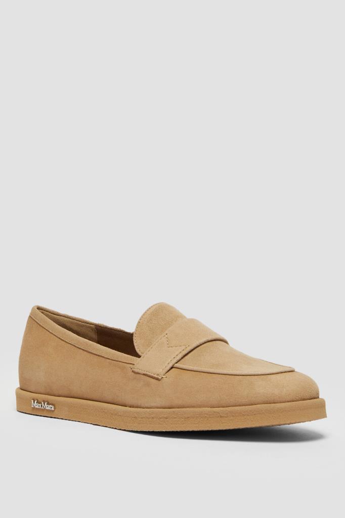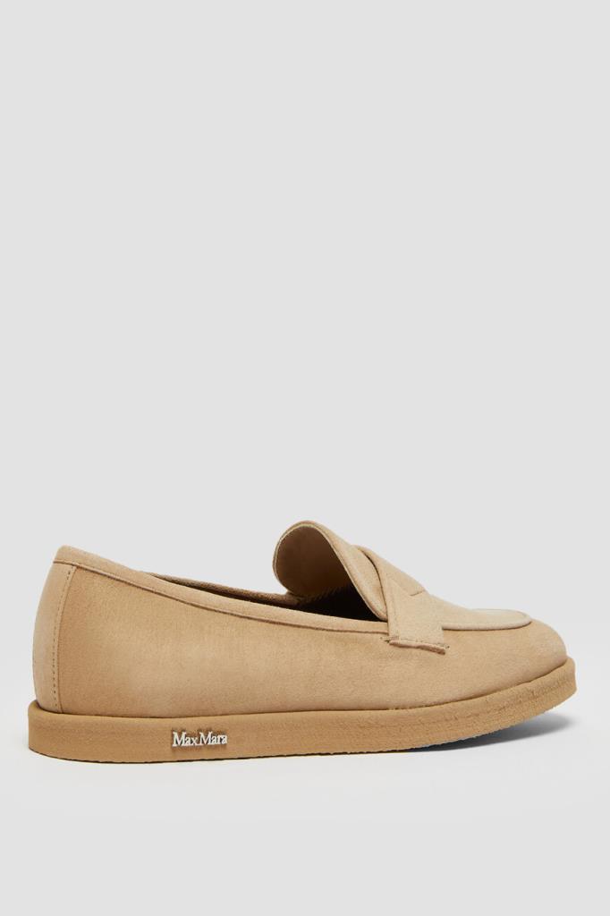 Замшевые лоферы Max Mara с классическим поперечным ремешком на союзке. Изделие отличается бархатистой текстурой и наличием неброского знакового декора - рельефного логотипа из металла серебристого оттенка сбоку и тиснёными надписями-лого Дома на кожаных стельках. Декором также выступает рельефный декоративный шов спереди.