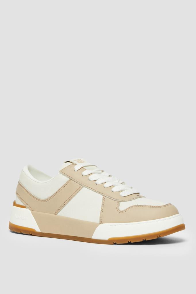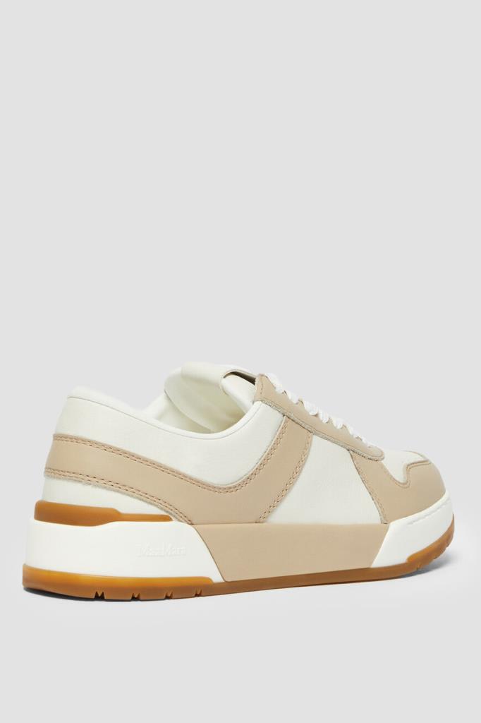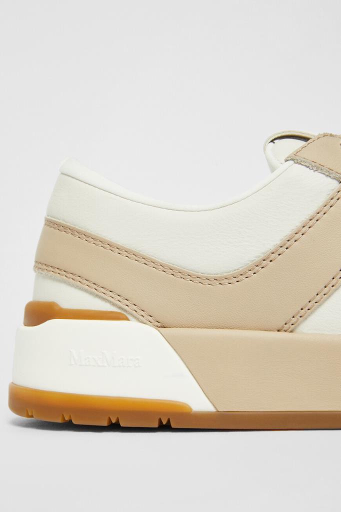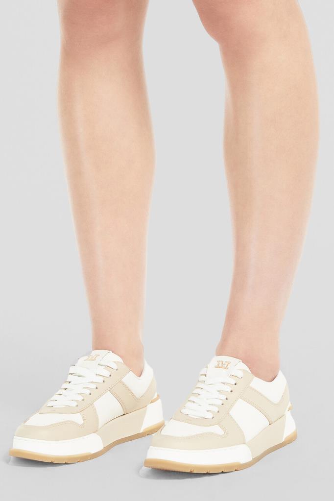 Сникеры Max Mara на плоской трёхцветной подошве из натуральной резины. Модель изготовлена из мягкой кожи телёнка в белом и бежевом тонах и оснащена закрытой перекрёстной шнуровкой. Для надёжного сцепления с дорогой предусмотрен протектор. Атрибутами Дома выступают крупная дизайнерская литера «M» на язычке, рельефный логотип сбоку на подошве и брендирование на коричневой вставке снизу.