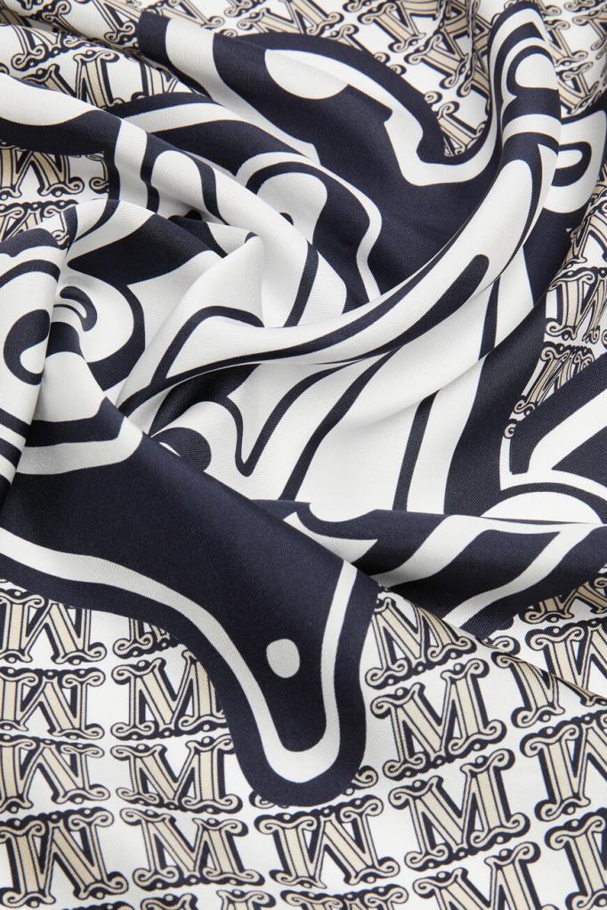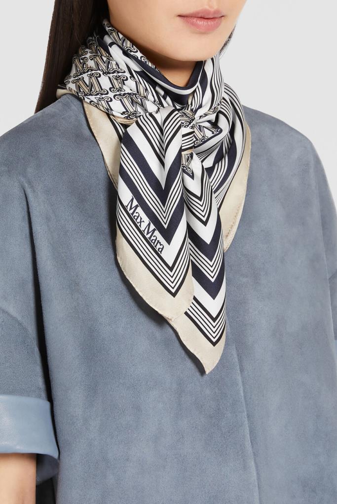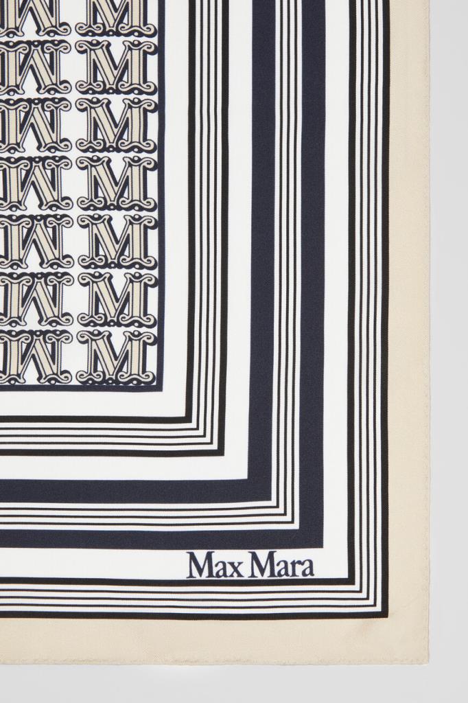 Шелковый платок Max Mara с окантовкой в виде квадратов. Поверхность модели, сшитой из чистой саржи, покрыта коллекционным принтом в белом, светло-бежевом и тёмно-синем оттенках. В центре расположены крупные изображение якоря и дизайнерская монограмма «M».