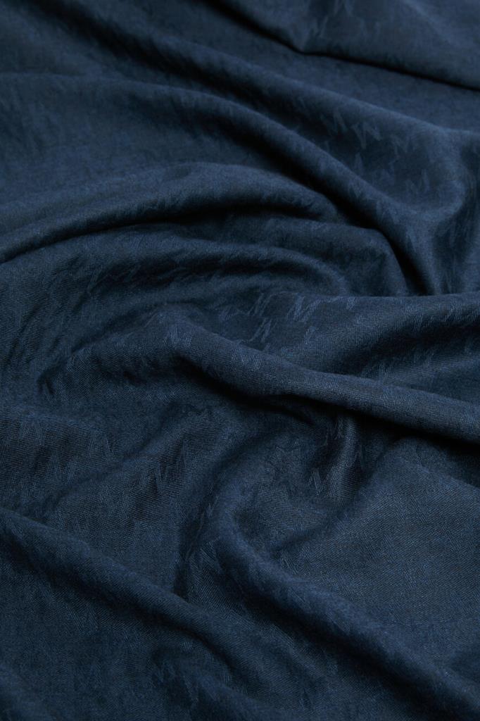 Жаккардовый палантин тёмно-синего оттенка от Max Mara. Для производства изделия выбраны мягкая шерсть и гладкий шёлк с ромбовидным геометрическим узором в виде повторяющейся литеры «M» в тон и эффектом градиента. Модель станет завершающим элементом сезонных образов.