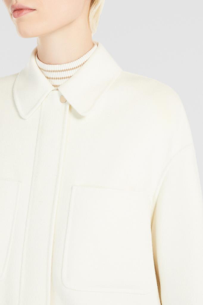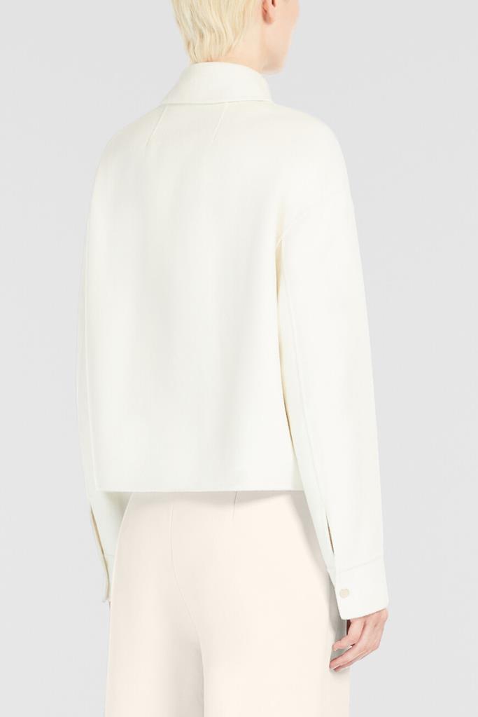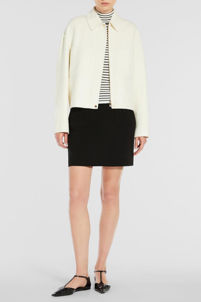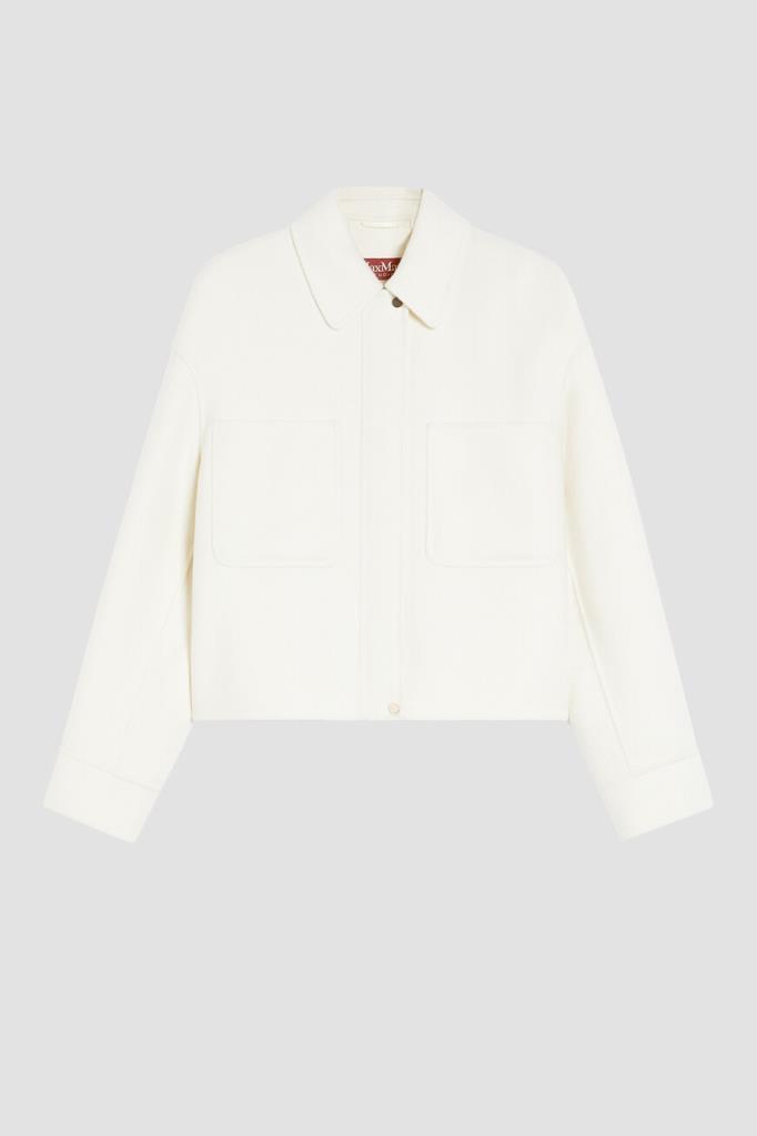 Белая куртка свободного кроя от Max Mara. Изделие из мягкого драпа на основе шерсти virgin, кашемира и гладкого шёлка оснащено застёжкой на молнию золотого оттенка, покрытую планкой, и две металлические клёпки и дополнено двумя нагрудными накладными карманами. Особенностью модели является наличие рельефных полос-канта в тон.