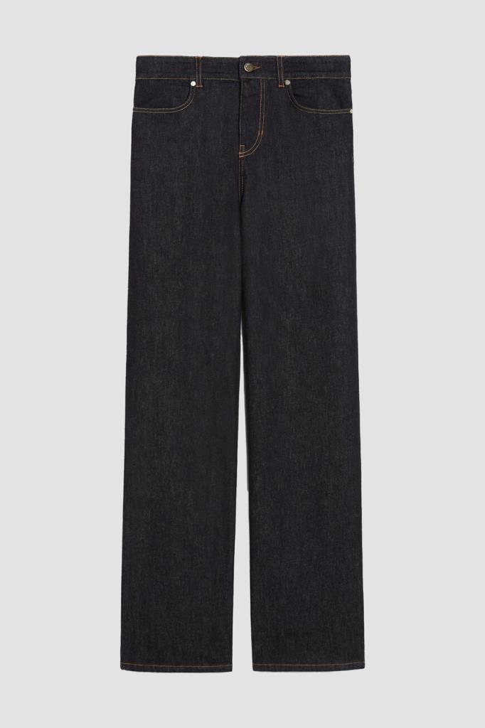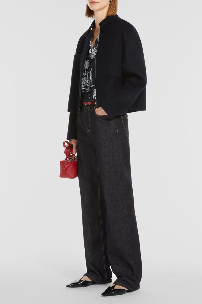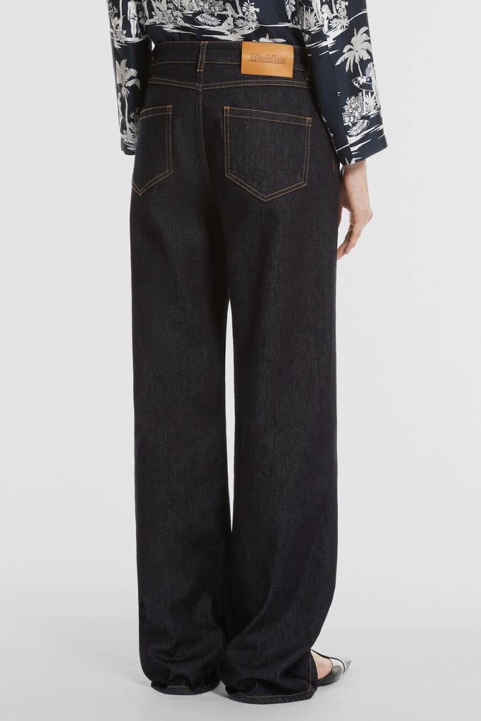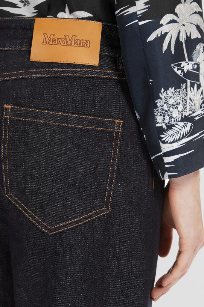 Пятикарманные джинсы с символикой бренда Max Mara. Для пошива изделия прямого силуэта используется эластичный хлопковый деним. Атрибутом Дома выступает прямоугольная кожаная накладка с крупным логотипом на поясе сзади. Края изделия подчёркнуты светло-коричневой прострочкой.