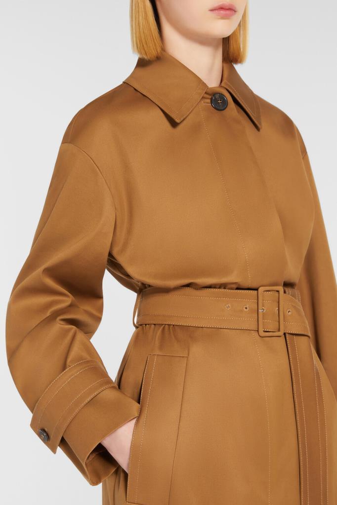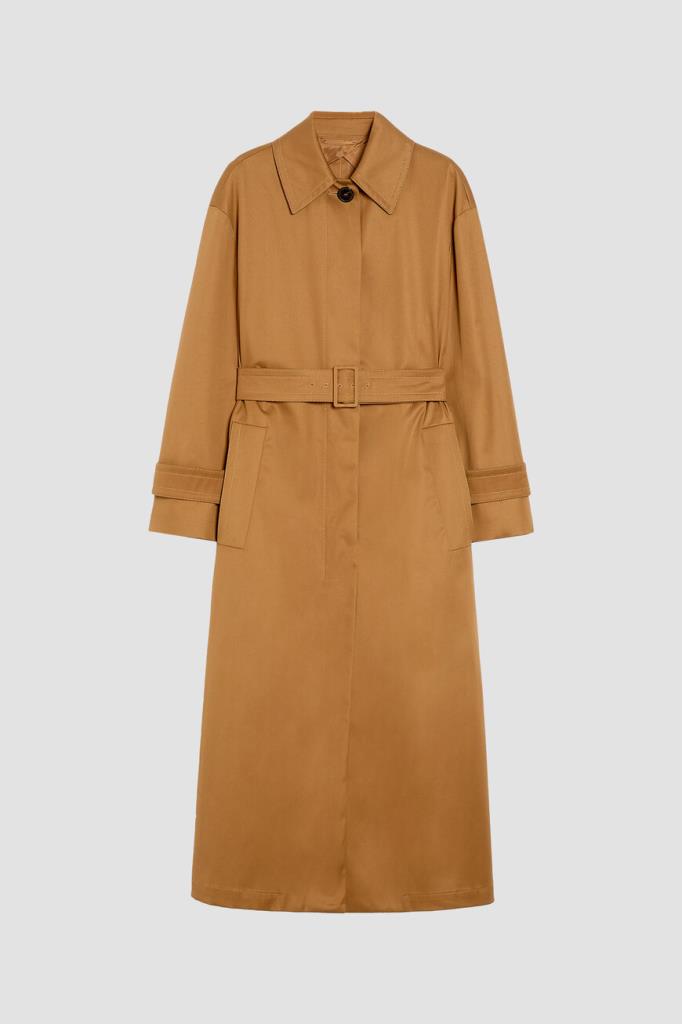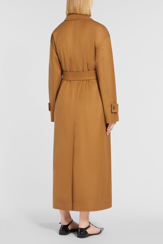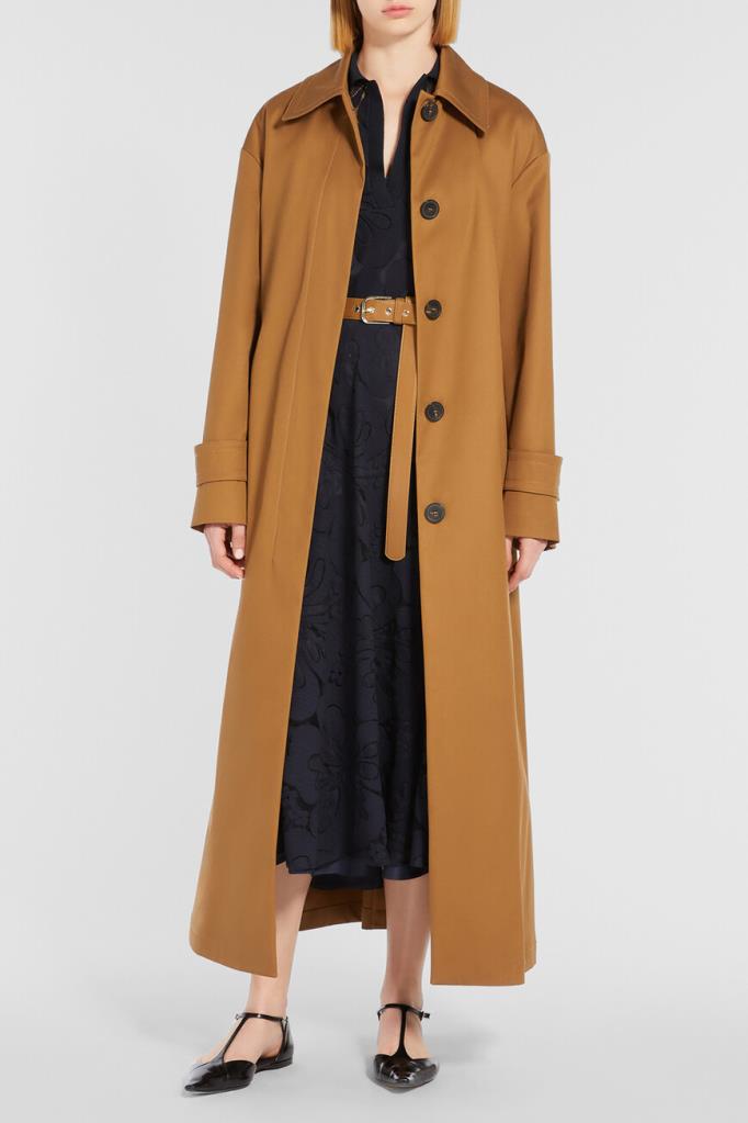 Коричневый тренчкот однобортного силуэта от Max Mara. Для создания длинной модели выбран водоотталкивающий габардин на основе хлопка стрейч с прострочкой на швах. Фасон изделия характеризуется расклешенным книзу кроем и наличием отложного воротника, пат на роговой пуговице снизу на уровне манжет и центрального разреза-шлицы сзади. Тренчкот на крупных пуговицах, покрытых планкой, станет неотъемлемой частью женского гардероба.