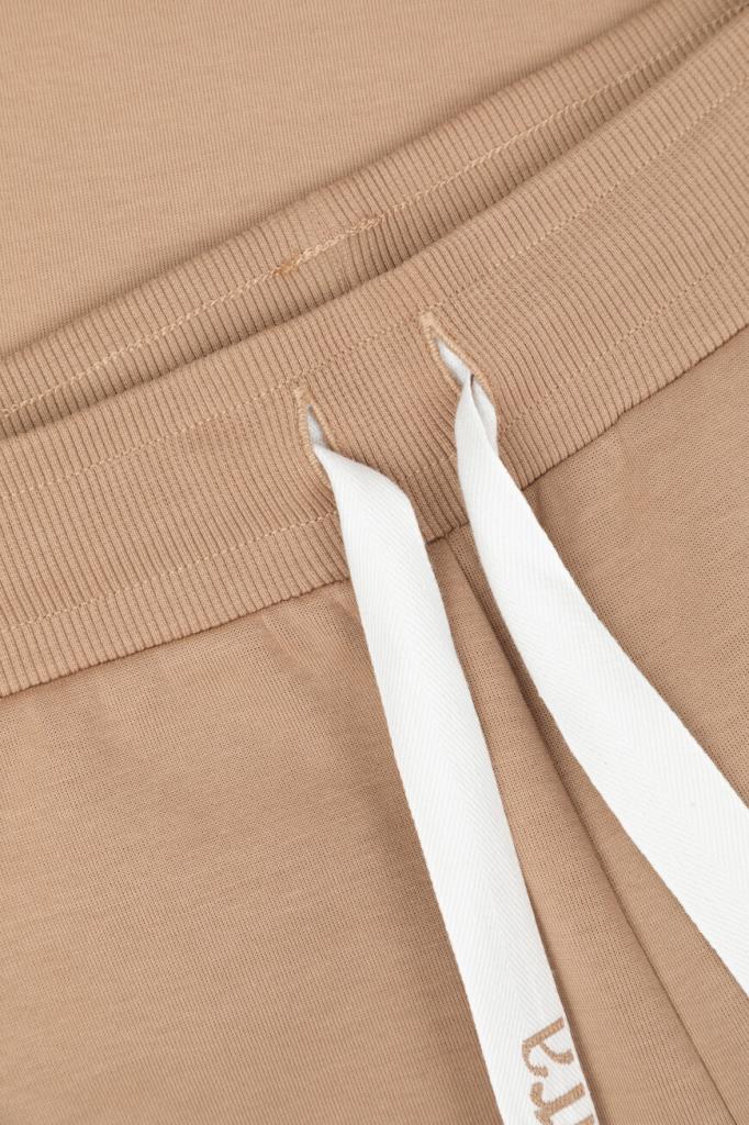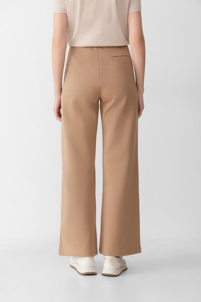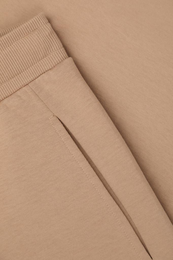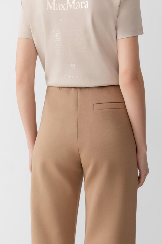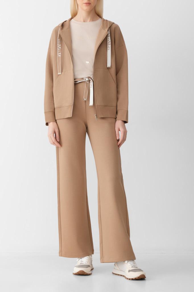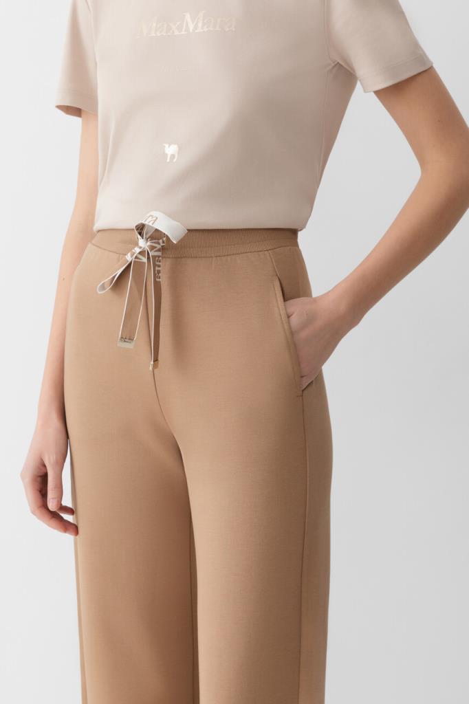 Брюки Max Mara из мягкого и приятного на ощупь трикотажа в фирменном оттенке кэмел. Свободный крой и широкие штанины не сковывают движений, а эластичный пояс с фирменной жаккардовой лентой обеспечивает комфортную посадку. Практичные детали: удобные боковые карманы по швам и задний прорезной карман. Особенно хорошо модель смотрится с толстовкой из той же коллекции бренда.