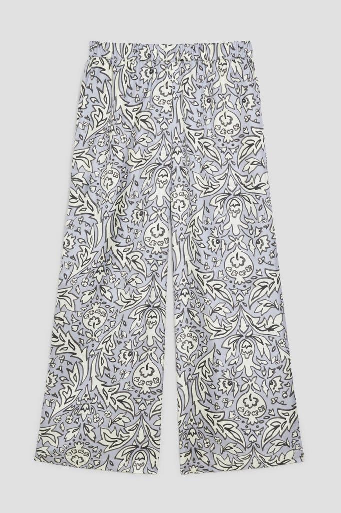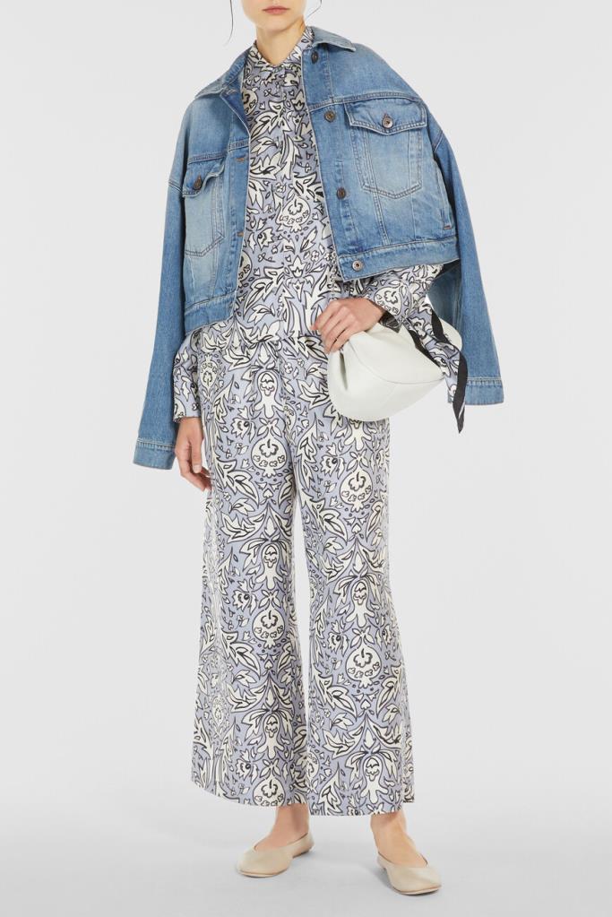 Укороченные брюки Max Mara с широким эластичным поясом на резинке. Для изготовления модели расслабленного силуэта, выполненной в пижамном стиле, используется гладкий шелковый твил. Поверхность изделия покрыта двухцветным растительным мотивом, словно нарисованным маркером от руки, на бледно-голубом фоне. Сочетайте тонкие брюки с парной рубашкой и джинсовой курткой с эффектом делаве из той же коллекции.