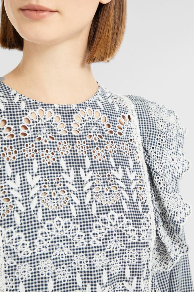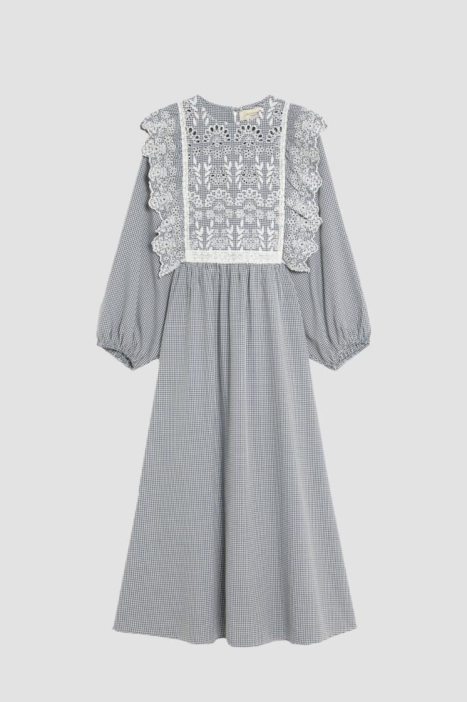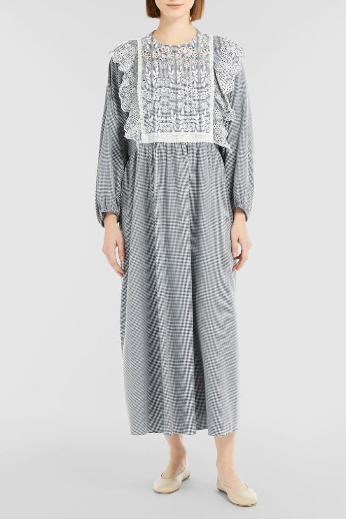 Платье из линейки Max Mara Weekend с кружевной вышивкой Broderie anglaise. Для пошива модели расклешенного книзу силуэта выбран мягкий трикотаж на основе прочного полиэфира и вискозного волокна с принтом в мелкую клетку Gingham в белом и тёмно-синем тонах. Конструкция изделия ниже колена предполагает наличие круглого выреза горловины и застёжки-молнии сверху в задней части. Платье декорировано белыми вышитым орнаментом с ажурными вставками и деталью манишки с мягкими рюшами и фестончатыми краями по бокам.